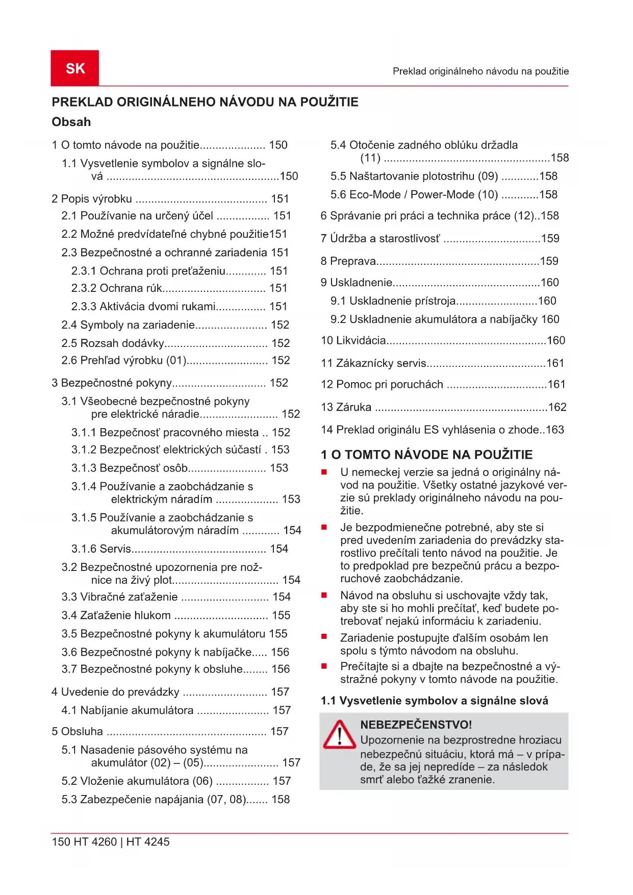 diely podliehajúce opotrebeniu, ktoré sú na karte náhradných dielov označené rámčekom xxxxxx (x) Záručná doba začína plynúť odo dňa zakúpenia zariadenia prvým koncovým odberateľom. Rozhodu- júci je dátum na doklade o zakúpení zariadenia. S týmto vyhlásením o záruke a s originálnym dokla- dom o zakúpení zariadenia sa obráťte na svojho predajcu alebo na najbližší autorizovaný zákaznícky servis. Zákonné nároky kupujúceho voči predávajúcemu vyplývajúce z chýb výrobku zostávajú týmto vyhlásením nedotknuté.442203_b 163 Preklad originálu ES vyhlásenia o zhode 14 PREKLAD ORIGINÁLU ES VYHLÁSENIA O ZHODE Týmto vyhlasujeme, že tento produkt vo forme, v akej sa predáva na trhu, spĺňa podmienky harmoni- zovaných smerníc EÚ, bezpečnostných štandardov EÚ a štandardov špecifických pre produkt. Výrobok Akumulátorové nožnice na živý plot Sériové číslo G2033022 Výrobca AL-KO Geräte GmbH Ichenhauser Str. 14 D-89359 Kötz Dokumentácia - oprávnená osoba Andreas Hedrich Ichenhauser Str. 14 D-89359 Kötz Typ HT 4260 HT 4245 Hladina hluku EN ISO 3744 nameraný/garantovaný 93,1dB(A) / 95dB(A) Smernice EÚ 2006/42/ES 2014/30/EÚ 2000/14/ES 2011/65/EÚ Vyhlásenie o zhode 2000/14/ES, príloha V Harmonizované normy EN 60745-1:2009+A11:2010 EN 60745-2-15:2009+A1:2010 EN 55014-1:2006+A1:2009+A2:2011 EN 55014-2:2015 Kötz, 16.05.2018 Dr. Wolfgang Hergeth RiaditeľHU 164 HT 4260 | HT 4245 Az eredeti kezelési útmutató fordítása AZ EREDETI KEZELÉSI ÚTMUTATÓ FORDÍTÁSA Tartalomjegyzék 1 Ehhez a kezelési útmutatóhoz................. 164