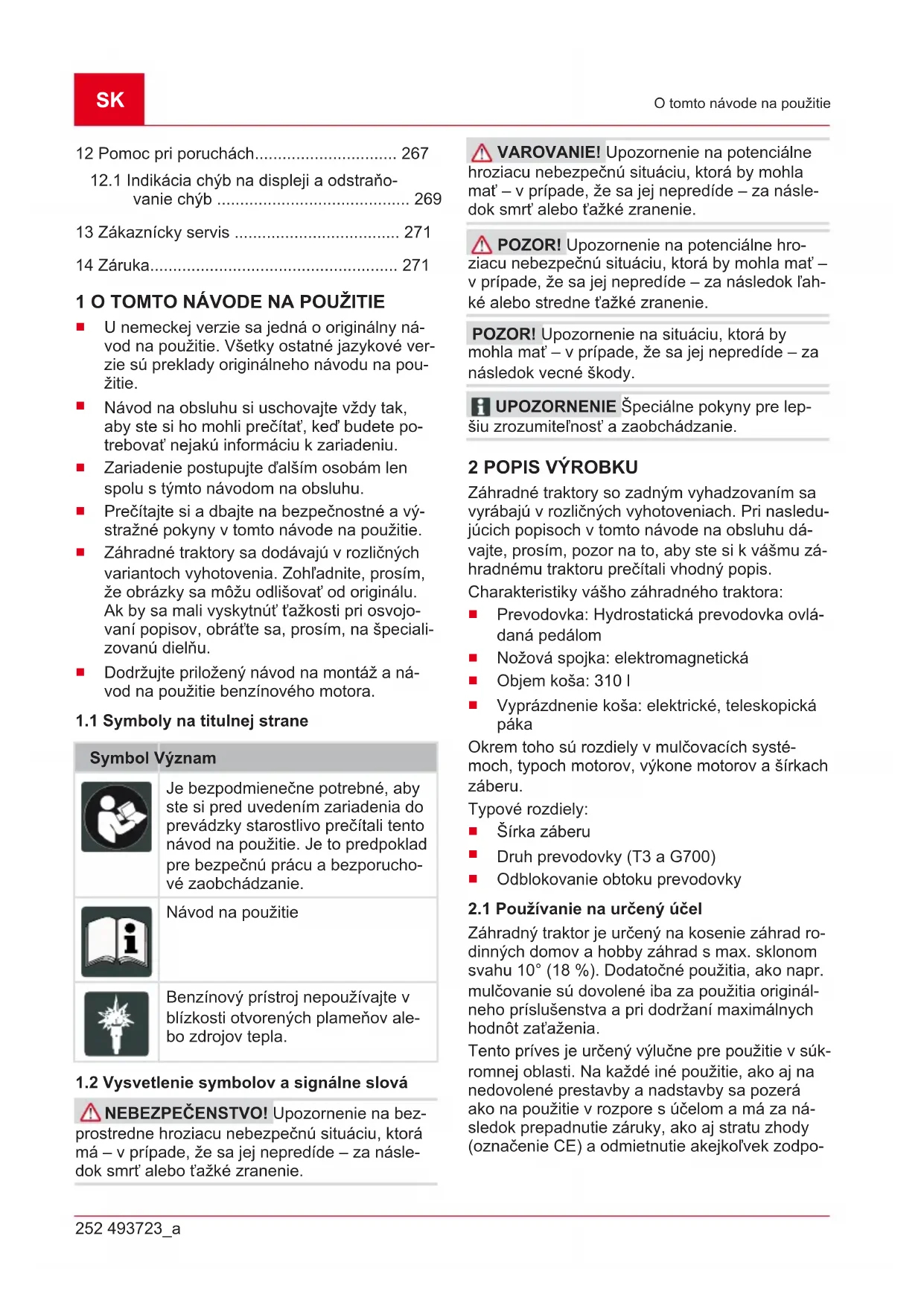 Záhradný traktor je určený na kosenie záhrad ro- dinných domov a hobby záhrad s max. sklonom svahu 10° (18%). Dodatočné použitia, ako napr. mulčovanie sú dovolené iba za použitia originál- neho príslušenstva a pri dodržaní maximálnych hodnôt zaťaženia. Tento príves je určený výlučne pre použitie v súk- romnej oblasti. Na každé iné použitie, ako aj na nedovolené prestavby a nadstavby sa pozerá ako na použitie v rozpore s účelom a má za ná- sledok prepadnutie záruky, ako aj stratu zhody (označenie CE) a odmietnutie akejkoľvek zodpo-493723_a 253 Popis výrobku vednosti voči škodám používateľa alebo tretej osoby zo strany výrobcu.