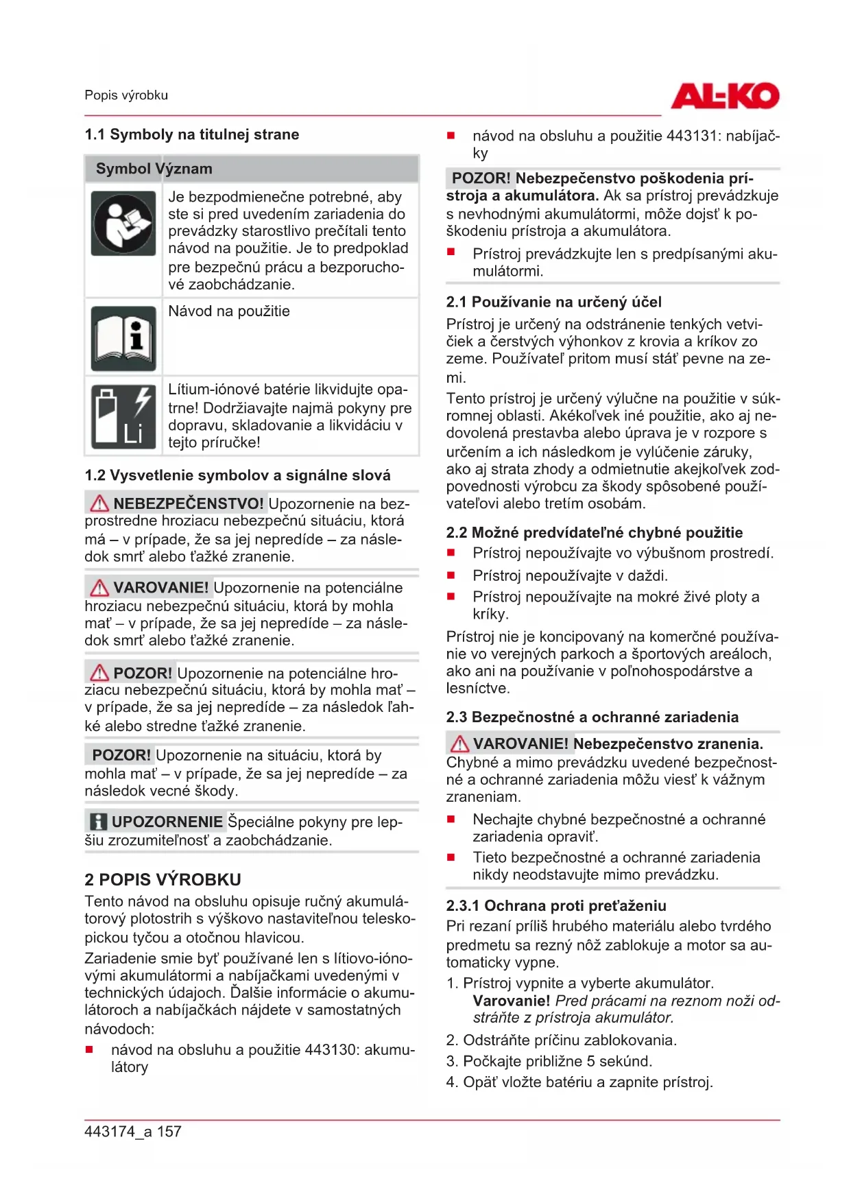 UPOZORNENIE Akumulátor a nabíjačka nie sú súčasťou dodávky a preto musia byť zakúpe- né zvlášť. Po vybalení skontrolujte, či boli dodané všetky konštrukčné diely. Č. Konštrukčná časť 1 Základný prístroj 2 Rezacia hlavica s otočným kĺbom 3 Ochranný kryt rezného noža 4 Návod na obsluhu443174_a 159 Bezpečnostné pokyny