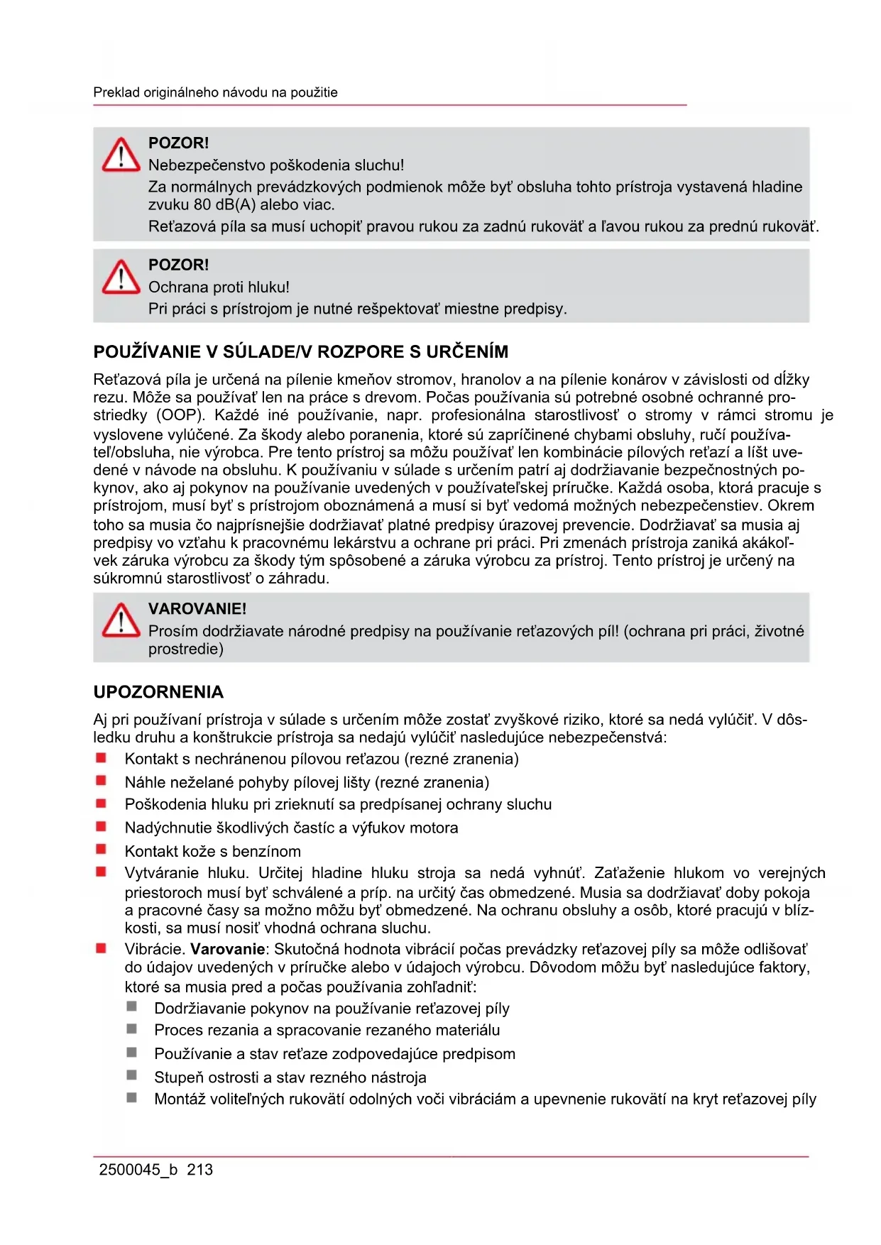 - VYHLÁSENIE O ZHODE - ES POZOR! Pred používaním našich výrobkov si pozorne prečítajte túto príručku, aby ste sa oboznámili s prístrojom. Majte túto príručku vždy poruke. POZOR! Výstražné symboly v tejto príručke označené príslušnými symbolmi poukazujú na kritické body, ktoré sa musia rešpektovať, aby sa predišlo nebezpečenstvu zranenia; pozorne si prečítajte pokyny a počas používania ich dodržujte. POZOR! Tento symbol označuje pokyny, ktoré sa musia dodržať, aby sa zabránilo úrazom, ktoré môžu viesť k zraneniam alebo smrti. POZOR! Tento symbol označuje pokyny, ktoré sa musia dodržať, aby sa zabránilo mechanickým po- ruchám, výpadkom alebo poškodeniam. POZOR! Pozorne si prečítajte tieto pokyny skôr, než začnete s pílou pracovať a dobre ich uschovajte. Pokyny si pozorne prečítajte. Zoznámte sa s ovládacími prvkami, aby ste mohli prístroj bez- pečne používať. Tento návod na obsluhu si uschovajte spolu s reťazovou pílou.Preklad originálneho návodu na použitie 2500045_b 213 POZOR! Nebezpečenstvo poškodenia sluchu! Za normálnych prevádzkových podmienok môže byť obsluha tohto prístroja vystavená hladine zvuku 80 dB(A) alebo viac. Reťazová píla sa musí uchopiť pravou rukou za zadnú rukoväť a ľavou rukou za prednú rukoväť. POZOR! Ochrana proti hluku! Pri práci s prístrojom je nutné rešpektovať miestne predpisy. POUŽÍVANIE V SÚLADE/V ROZPORE S URČENÍM Reťazová píla je určená na pílenie kmeňov stromov, hranolov a na pílenie konárov v závislosti od dĺžky rezu. Môže sa používať len na práce s drevom. Počas používania sú potrebné osobné ochranné pro- striedky (OOP). Každé iné používanie, napr. profesionálna starostlivosť o stromy v rámci stromu je vyslovene vylúčené. Za škody alebo poranenia, ktoré sú zapríčinené chybami obsluhy, ručí používa- teľ/obsluha, nie výrobca. Pre tento prístroj sa môžu používať len kombinácie pílových reťazí a líšt uve- dené v návode na obsluhu. K používaniu v súlade s určením patrí aj dodržiavanie bezpečnostných po- kynov, ako aj pokynov na používanie uvedených v používateľskej príručke. Každá osoba, ktorá pracuje s prístrojom, musí byť s prístrojom oboznámená a musí si byť vedomá možných nebezpečenstiev. Okrem toho sa musia čo najprísnejšie dodržiavať platné predpisy úrazovej prevencie. Dodržiavať sa musia aj predpisy vo vzťahu k pracovnému lekárstvu a ochrane pri práci. Pri zmenách prístroja zaniká akákoľ- vek záruka výrobcu za škody tým spôsobené a záruka výrobcu za prístroj. Tento prístroj je určený na súkromnú starostlivosť o záhradu. VAROVANIE! Prosím dodržiavate národné predpisy na používanie reťazových píl! (ochrana pri práci, životné prostredie) UPOZORNENIA Aj pri používaní prístroja v súlade s určením môže zostať zvyškové riziko, ktoré sa nedá vylúčiť. V dôs- ledku druhu a konštrukcie prístroja sa nedajú vylúčiť nasledujúce nebezpečenstvá: Kontakt s nechránenou pílovou reťazou (rezné zranenia) Náhle neželané pohyby pílovej lišty (rezné zranenia) Poškodenia hluku pri zrieknutí sa predpísanej ochrany sluchu Nadýchnutie škodlivých častíc a výfukov motora Kontakt kože s benzínom Vytváranie hluku. Určitej hladine hluku stroja sa nedá vyhnúť. Zaťaženie hlukom vo verejných priestoroch musí byť schválené a príp. na určitý čas obmedzené. Musia sa dodržiavať doby pokoja a pracovné časy sa možno môžu byť obmedzené. Na ochranu obsluhy a osôb, ktoré pracujú v blíz- kosti, sa musí nosiť vhodná ochrana sluchu. Vibrácie. Varovanie: Skutočná hodnota vibrácií počas prevádzky reťazovej píly sa môže odlišovať do údajov uvedených v príručke alebo v údajoch výrobcu. Dôvodom môžu byť nasledujúce faktory, ktoré sa musia pred a počas používania zohľadniť: Dodržiavanie pokynov na používanie reťazovej píly Proces rezania a spracovanie rezaného materiálu Používanie a stav reťaze zodpovedajúce predpisom Stupeň ostrosti a stav rezného nástroja Montáž voliteľných rukovätí odolných voči vibráciám a upevnenie rukovätí na kryt reťazovej pílysk Poloha dielov 214 2500045_b Ak zistíte neprirodzený pocit alebo sfarbenie kože na rukách po použití stroja, zaraďte primeranú pra- covnú prestávku. Bez pracovných prestávok môže dôjsť k vibračnému syndrómu dlaní a paží. POLOHA DIELOV p. 234