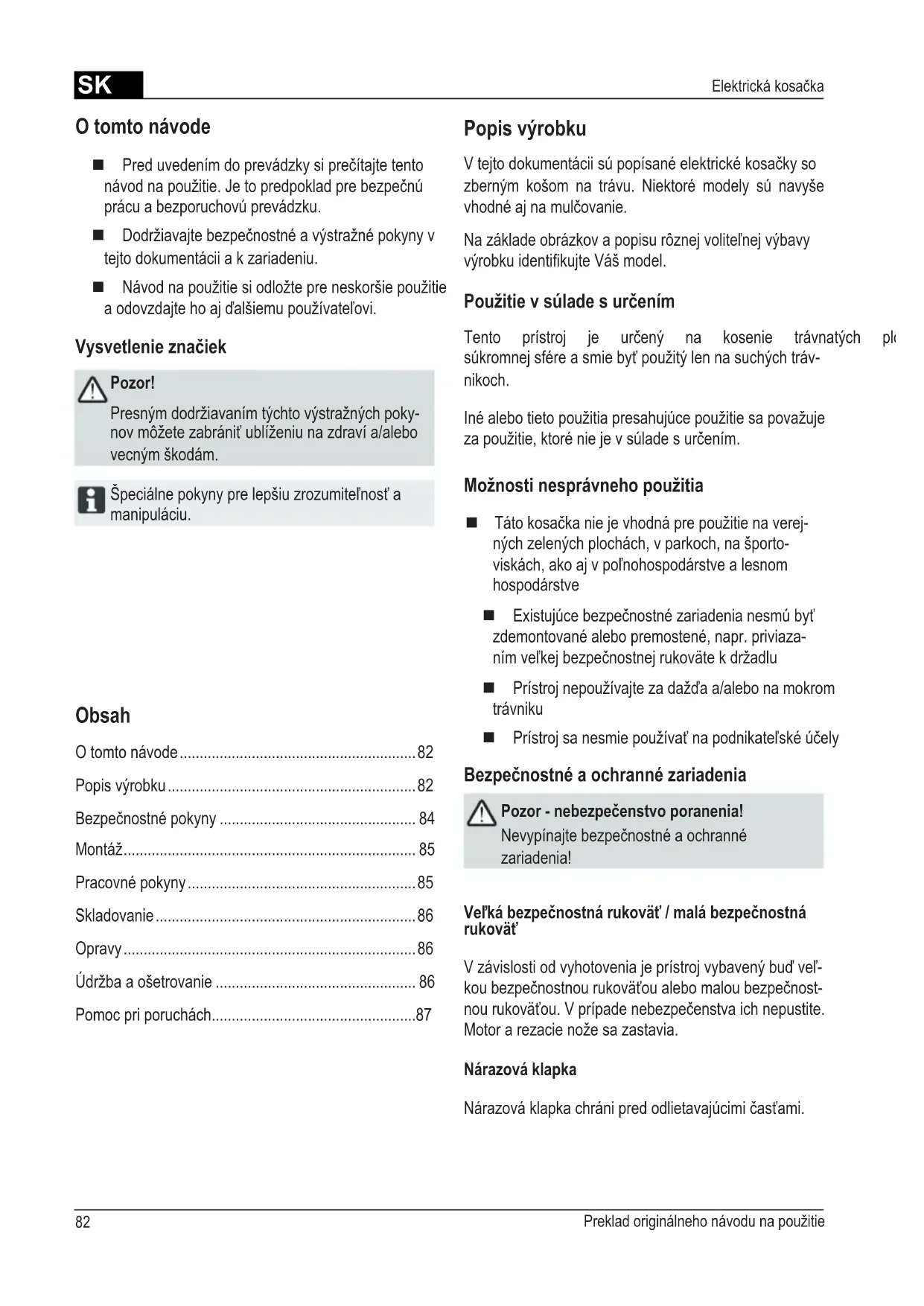 - Pomoc pri poruchách O tomto návode Preduvedenímdoprevádzkysiprečítajtetento návodnapoužitie.Jetopredpokladprebezpečnú prácu a bezporuchovú prevádzku. Dodržiavajtebezpečnostnéavýstražnépokynyv tejto dokumentácii a k zariadeniu. Návodnapoužitiesiodložtepreneskoršiepoužitie aodovzdajtehoajďalšiemupoužívateľovi. Vysvetlenie značiek Pozor! Presnýmdodržiavanímtýchtovýstražnýchpoky- novmôžetezabrániťublíženiunazdravía/alebo vecným škodám. Špeciálnepokynyprelepšiuzrozumiteľnosťa manipuláciu. Popis výrobku Vtejtodokumentáciisúpopísanéelektrickékosačkyso zberným košom na trávu. Niektoré modely sú navyše vhodnéajnamulčovanie. Nazákladeobrázkovapopisurôznejvoliteľnejvýbavy výrobkuidentikujteVášmodel. Použitie v súlade s určením Tento prístroj je určený na kosenie trávnatých plôch v súkromnejsféreasmiebyťpoužitýlennasuchýchtráv- nikoch. Inéalebotietopoužitiapresahujúcepoužitiesapovažuje zapoužitie,ktoréniejevsúladesurčením. Možnosti nesprávneho použitia Tátokosačkaniejevhodnáprepoužitienaverej- ných zelených plochách, v parkoch, na športo- viskách,akoajvpoľnohospodárstvealesnom hospodárstve Existujúcebezpečnostnézariadenianesmúbyť zdemontované alebo premostené, napr. priviaza- nímveľkejbezpečnostnejrukovätekdržadlu Prístrojnepoužívajtezadažďaa/alebonamokrom trávniku Prístrojsanesmiepoužívaťnapodnikateľskéúčely Bezpečnostné a ochranné zariadenia Pozor - nebezpečenstvo poranenia! Nevypínajtebezpečnostnéaochranné zariadenia! Veľká bezpečnostná rukoväť / malá bezpečnostná rukoväť Vzávislostiodvyhotoveniajeprístrojvybavenýbuďveľ- koubezpečnostnourukoväťoualebomaloubezpečnost- nourukoväťou.Vprípadenebezpečenstvaichnepustite. Motorarezacienožesazastavia. Nárazová klapka Nárazováklapkachránipredodlietavajúcimičasťami.SK p. 87