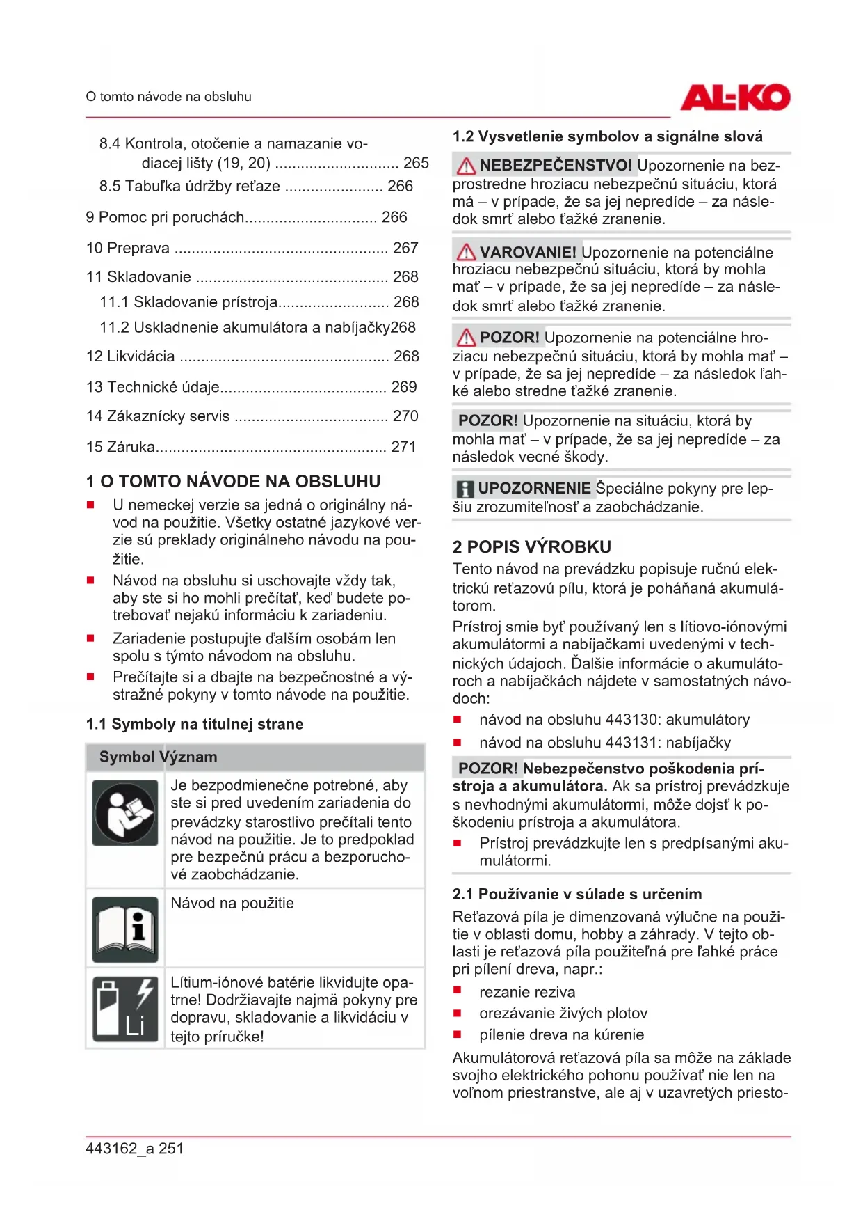 V prípade otázok k záruke, oprave alebo náhrad- ným dielom sa obráťte, prosím, na najbližší ser- vis AL-KO. Tento nájdete na internete na nasle- dovnej adrese: www.al-ko.com/service-contacts443162_a 271 Záruka 15 ZÁRUKA Prípadné chyby materiálu alebo výrobné chyby na zariadení odstránime počas zákonnej premlčacej lehoty pre nárok na náhradu škody podľa nášho výberu opravou alebo výmenou. Premlčacia lehota sa určuje vždy podľa právnych predpisov krajiny, v ktorej bolo zariadenie zakúpené. Nárok na uplatnenie záruky akceptujeme len pri: