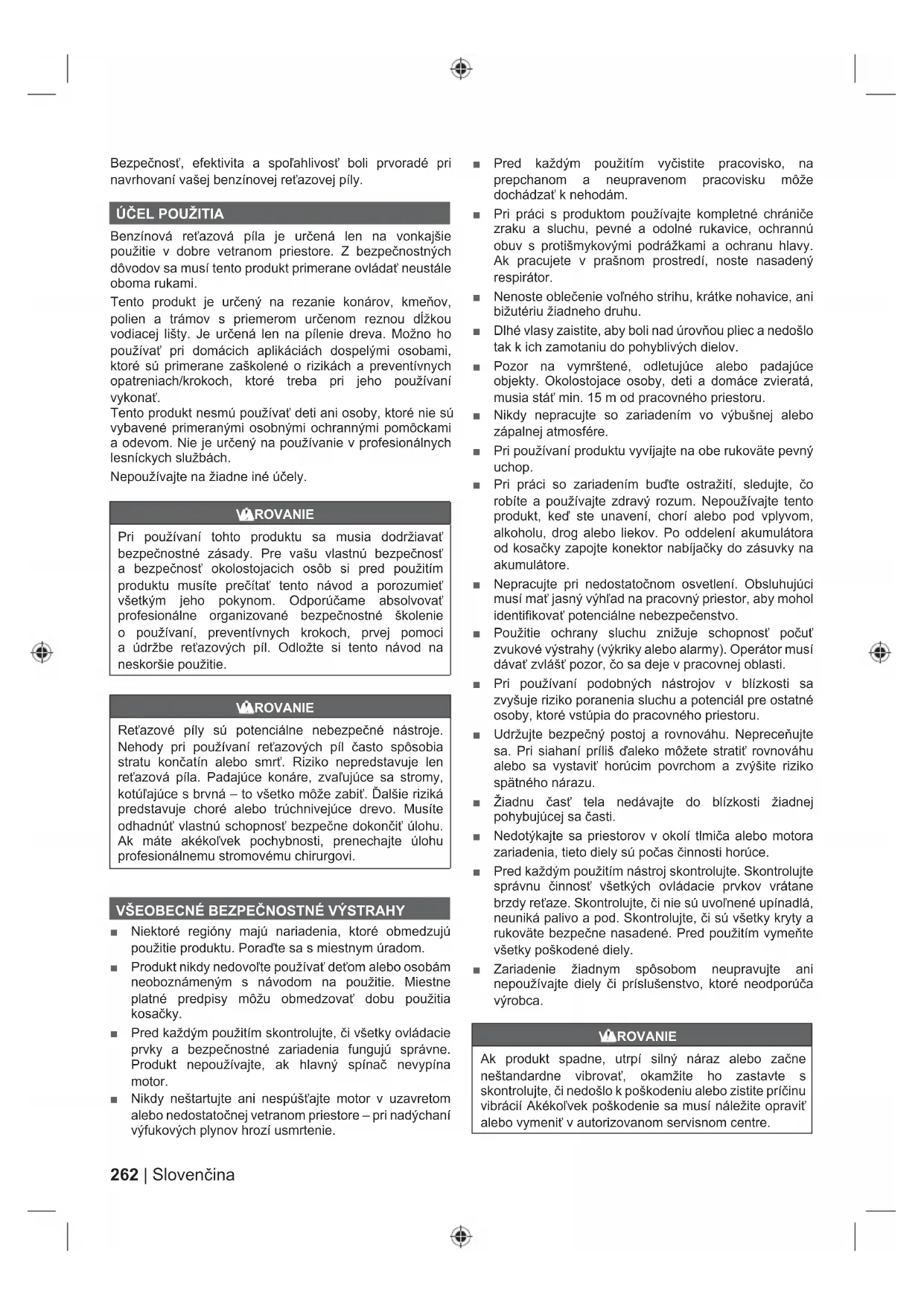 Benzínová reťazová píla je určená len na vonkajšie použitie v dobre vetranom priestore. Z bezpečnostných dôvodov sa musí tento produkt primerane ovládať neustále oboma rukami. Tento produkt je určený na rezanie konárov, kmeňov, polien a trámov s priemerom určenom reznou dĺžkou vodiacej lišty. Je určená len na pílenie dreva. Možno ho používať pri domácich aplikáciách dospelými osobami, ktoré sú primerane zaškolené o rizikách a preventívnych opatreniach/krokoch, ktoré treba pri jeho používaní vykonať. Tento produkt nesmú používať deti ani osoby, ktoré nie sú vybavené primeranými osobnými ochrannými pomôckami a odevom. Nie je určený na používanie v profesionálnych lesníckych službách. Nepoužívajte na žiadne iné účely. VAROVANIE Pri používaní tohto produktu sa musia dodržiavať bezpečnostné zásady. Pre vašu vlastnú bezpečnosť a bezpečnosť okolostojacich osôb si pred použitím produktu musíte prečítať tento návod a porozumieť všetkým jeho pokynom. Odporúčame absolvovať profesionálne organizované bezpečnostné školenie o používaní, preventívnych krokoch, prvej pomoci a údržbe reťazových píl. Odložte si tento návod na neskoršie použitie. VAROVANIE Reťazové píly sú potenciálne nebezpečné nástroje. Nehody pri používaní reťazových píl často spôsobia stratu končatín alebo smrť. Riziko nepredstavuje len reťazová píla. Padajúce konáre, zvaľujúce sa stromy, kotúľajúce s brvná – to všetko môže zabiť. Ďalšie riziká predstavuje choré alebo trúchnivejúce drevo. Musíte odhadnúť vlastnú schopnosť bezpečne dokončiť úlohu. Ak máte akékoľvek pochybnosti, prenechajte úlohu profesionálnemu stromovému chirurgovi.