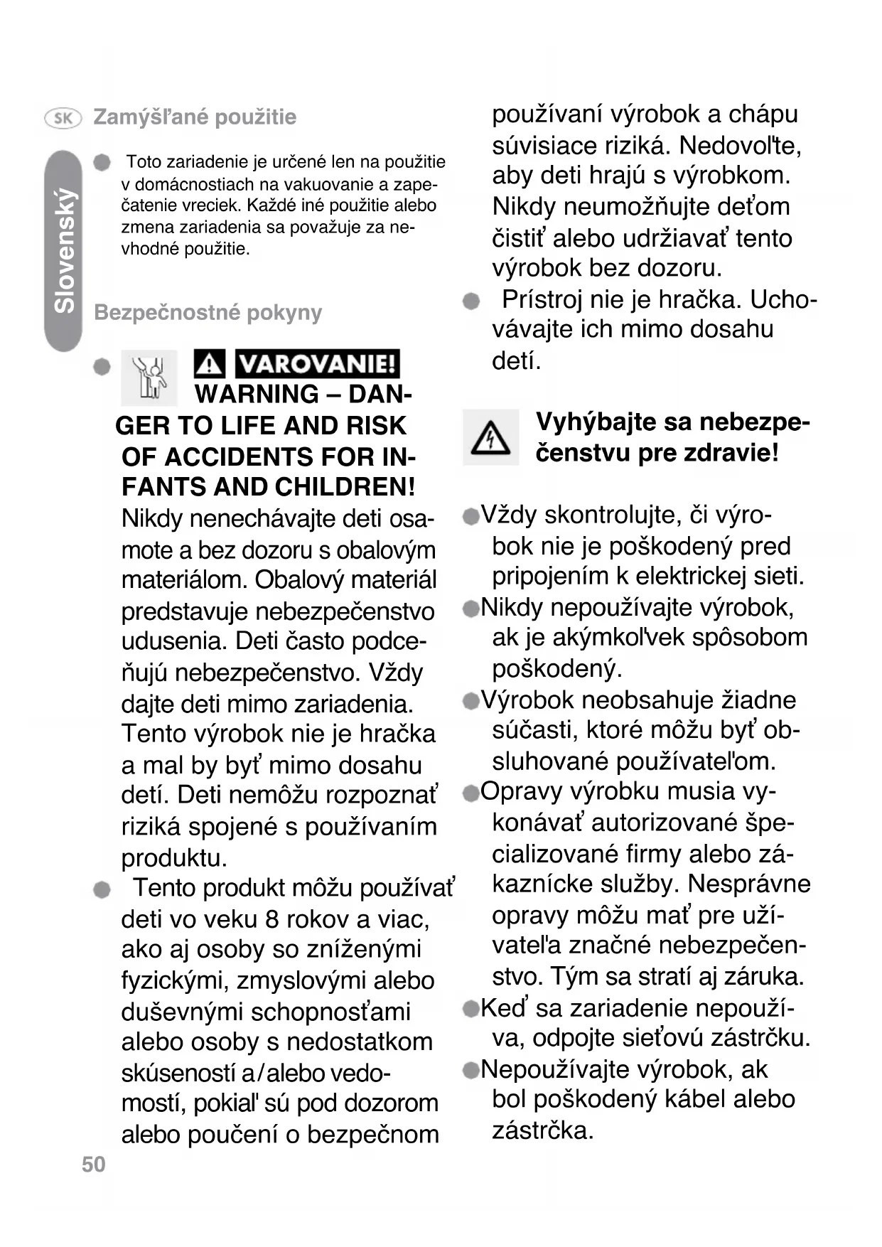 Čeština50 Zamýšľané použitie Toto zariadenie je určené len na použitie v domácnostiach na vakuovanie a zape- čatenie vreciek. Každé iné použitie alebo zmena zariadenia sa považuje za ne- vhodné použitie. Bezpečnostné pokyny WARNING – DAN-