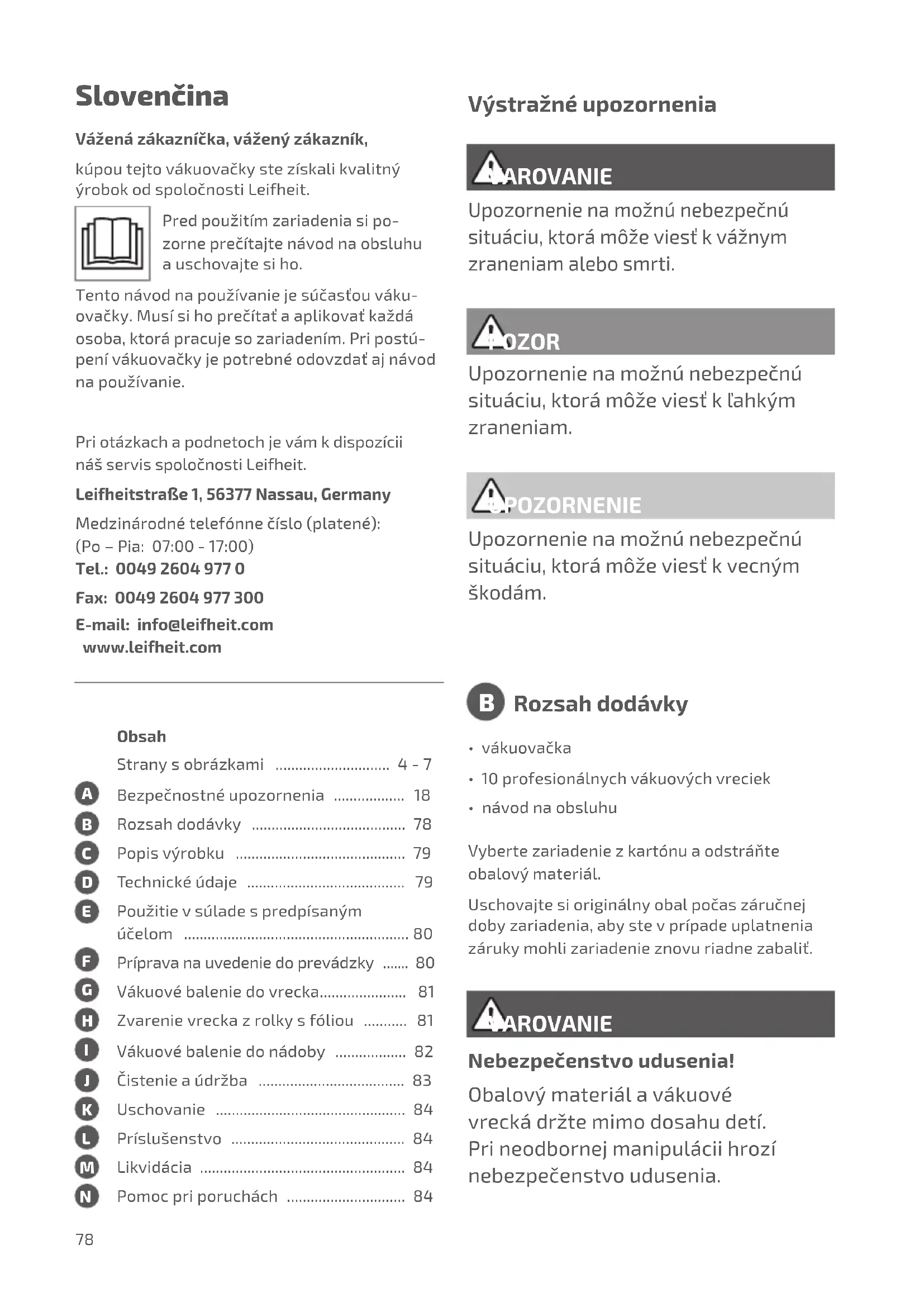 Rozsah dodávky POZOR Upozornenie na možnú nebezpečnú situáciu, ktorá môže viesť k ľahkým zraneniam. UPOZORNENIE Upozornenie na možnú nebezpečnú situáciu, ktorá môže viesť k vecným škodám. Pri otázkach a podnetoch je vám k dispozícii náš servis spoločnosti Leifheit. Leifheitstraße 1, 56377 Nassau, Germany Medzinárodné telefónne číslo (platené): (Po – Pia: 07:00 - 17:00) Tel.: 0049 2604 977 0 Fax: 0049 2604 977 300 E-mail: info@leifheit.com www.leifheit.com79