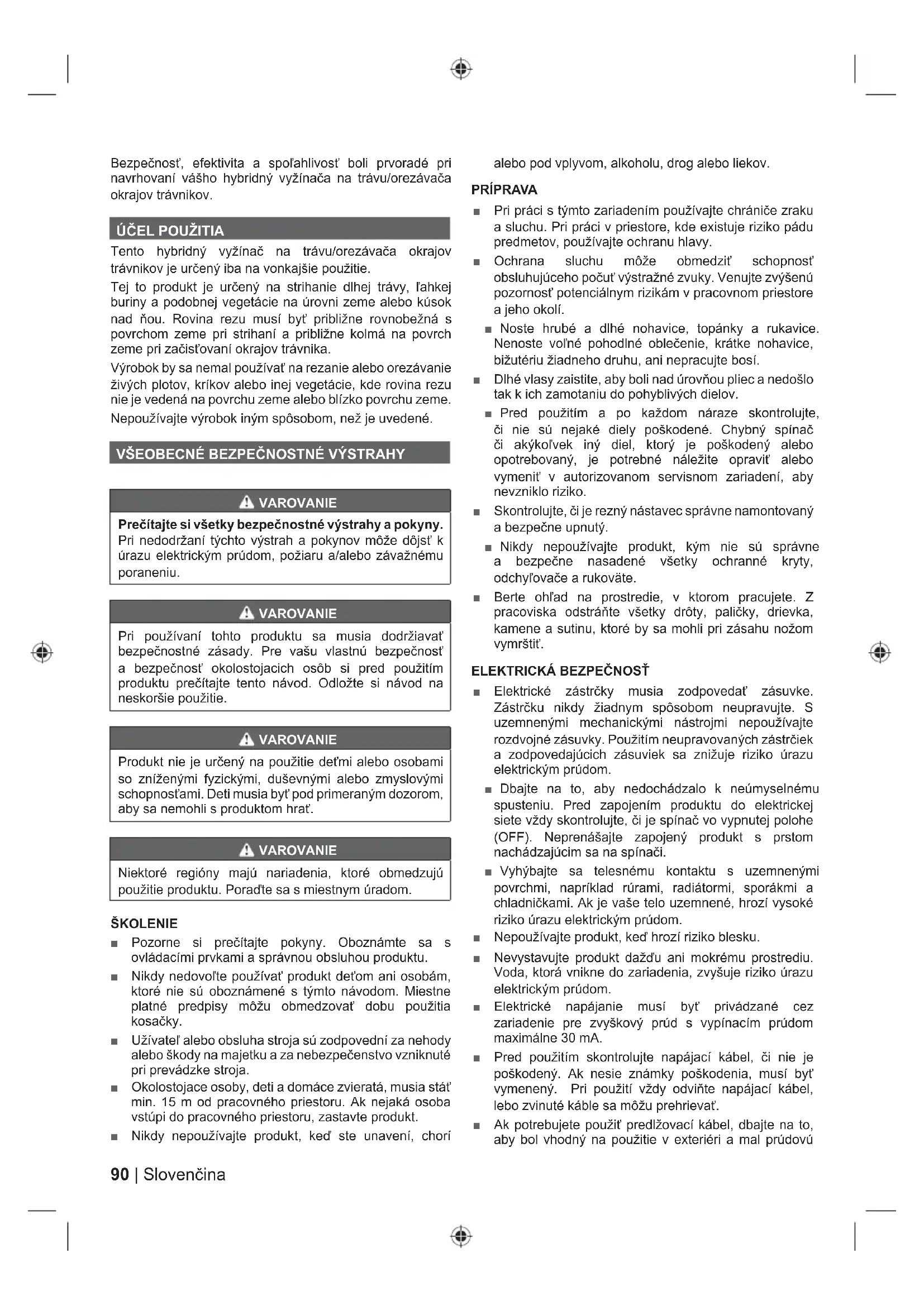 VAROVANIE Prečítajte si všetky bezpečnostné výstrahy a pokyny. Pri nedodržaní týchto výstrah a pokynov môže dôjsť k úrazu elektrickým prúdom, požiaru a/alebo závažnému poraneniu. VAROVANIE Pri používaní tohto produktu sa musia dodržiavať bezpečnostné zásady. Pre vašu vlastnú bezpečnosť a bezpečnosť okolostojacich osôb si pred použitím produktu prečítajte tento návod. Odložte si návod na neskoršie použitie. VAROVANIE Produkt nie je určený na použitie deťmi alebo osobami so zníženými fyzickými, duševnými alebo zmyslovými schopnosťami. Deti musia byť pod primeraným dozorom, aby sa nemohli s produktom hrať. VAROVANIE Niektoré regióny majú nariadenia, ktoré obmedzujú použitie produktu. Poraďte sa s miestnym úradom. ŠKOLENIE ■ Pozorne si prečítajte pokyny. Oboznámte sa s ovládacími prvkami a správnou obsluhou produktu. ■ Nikdy nedovoľte používať produkt deťom ani osobám, ktoré nie sú oboznámené s týmto návodom. Miestne platné predpisy môžu obmedzovať dobu použitia kosačky. ■ Užívateľ alebo obsluha stroja sú zodpovední za nehody alebo škody na majetku a za nebezpečenstvo vzniknuté pri prevádzke stroja. ■ Okolostojace osoby, deti a domáce zvieratá, musia stáť min. 15 m od pracovného priestoru. Ak nejaká osoba vstúpi do pracovného priestoru, zastavte produkt. ■ Nikdy nepoužívajte produkt, keď ste unavení, chorí alebo pod vplyvom, alkoholu, drog alebo liekov. PRÍPRA