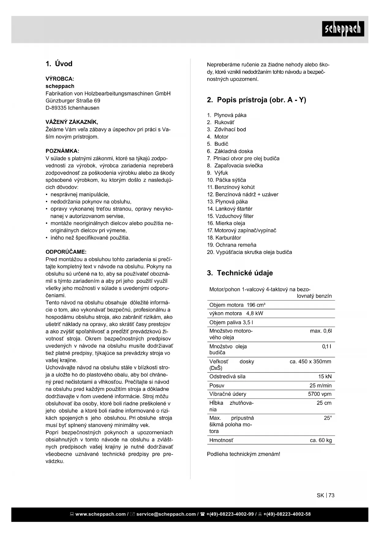 - iného než špecikované použitia. ODPORÚČAME: Pred montážou a obsluhou tohto zariadenia si prečí- tajte kompletný text v návode na obsluhu. Pokyny na obsluhu sú určené na to, aby sa používateľ obozná- mil s týmto zariadením a aby pri jeho použití využil všetky jeho možnosti v súlade s uvedenými odporu- čeniami. Tento návod na obsluhu obsahuje dôležité informá- cie o tom, ako vykonávať bezpečnú, profesionálnu a hospodárnu obsluhu stroja, ako zabrániť rizikám, ako ušetriť náklady na opravy, ako skrátiť časy prestojov a ako zvýšiť spoľahlivosť a predĺžiť prevádzkovú ži- votnosť stroja. Okrem bezpečnostných predpisov uvedených v návode na obsluhu musíte dodržiavať tiež platné predpisy, týkajúce sa prevádzky stroja vo vašej krajine. Uchovávajte návod na obsluhu stále v blízkosti stro- ja a uložte ho do plastového obalu, aby bol chráne- ný pred nečistotami a vlhkosťou. Prečítajte si návod na obsluhu pred každým použitím stroja a dôkladne dodržiavajte v ňom uvedené informácie. Stroj môžu obsluhovať iba osoby, ktoré boli riadne preškolené v jeho obsluhe a ktoré boli riadne informované o rizi- kách spojených s jeho obsluhou. Pri obsluhe stroja musí byť splnený stanovený minimálny vek. Popri bezpečnostných pokynoch a upozorneniach obsiahnutých v tomto návode na obsluhu a zvlášt- nych predpisoch vašej krajiny je nutné dodržiavať všeobecne uznávané technické predpisy pre pre- vádzku. www.scheppach.com / service@scheppach.com / +(49)-08223-4002-99 / +(49)-08223-4002-58