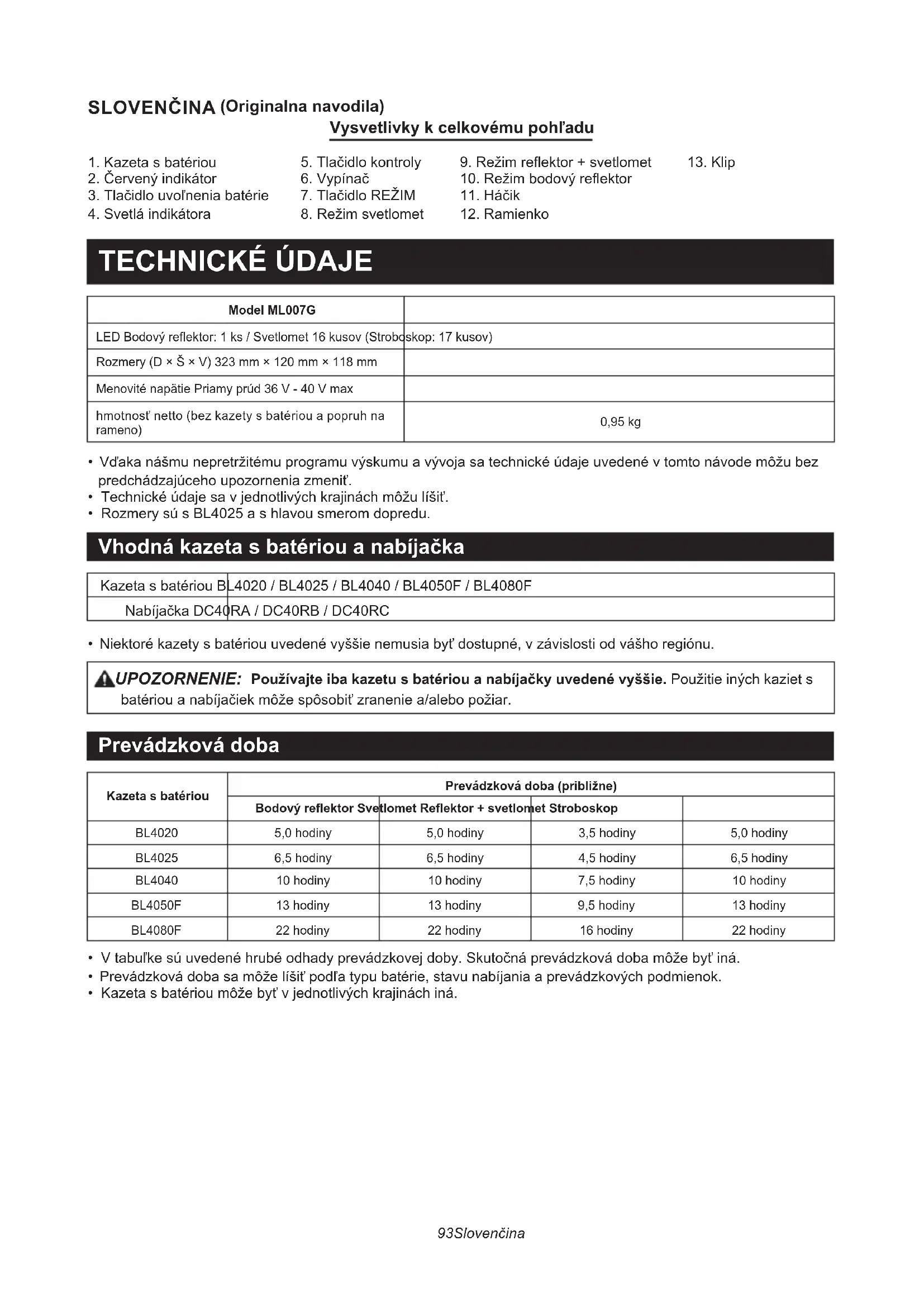 - Niektoré kazety s batériou uvedené vyššie nemusia byť dostupné, v závislosti od vášho regiónu. UPOZORNENIE: Používajte iba kazetu s batériou a nabíjačky uvedené vyššie. Použitie iných kaziet s batériou a nabíjačiek môže spôsobiť zranenie a/alebo požiar. Prevádzková doba Kazeta s batériouPrevádzková doba (približne)Bodový reflektor Svetlomet Reflektor + svetlomet Stroboskop BL4020 5,0 hodiny 5,0 hodiny 3,5 hodiny 5,0 hodiny BL4025 6,5 hodiny 6,5 hodiny 4,5 hodiny 6,5 hodiny BL4040 10 hodiny 10 hodiny 7,5 hodiny 10 hodiny BL4050F 13 hodiny 13 hodiny 9,5 hodiny 13 hodiny BL4080F 22 hodiny 22 hodiny 16 hodiny 22 hodiny