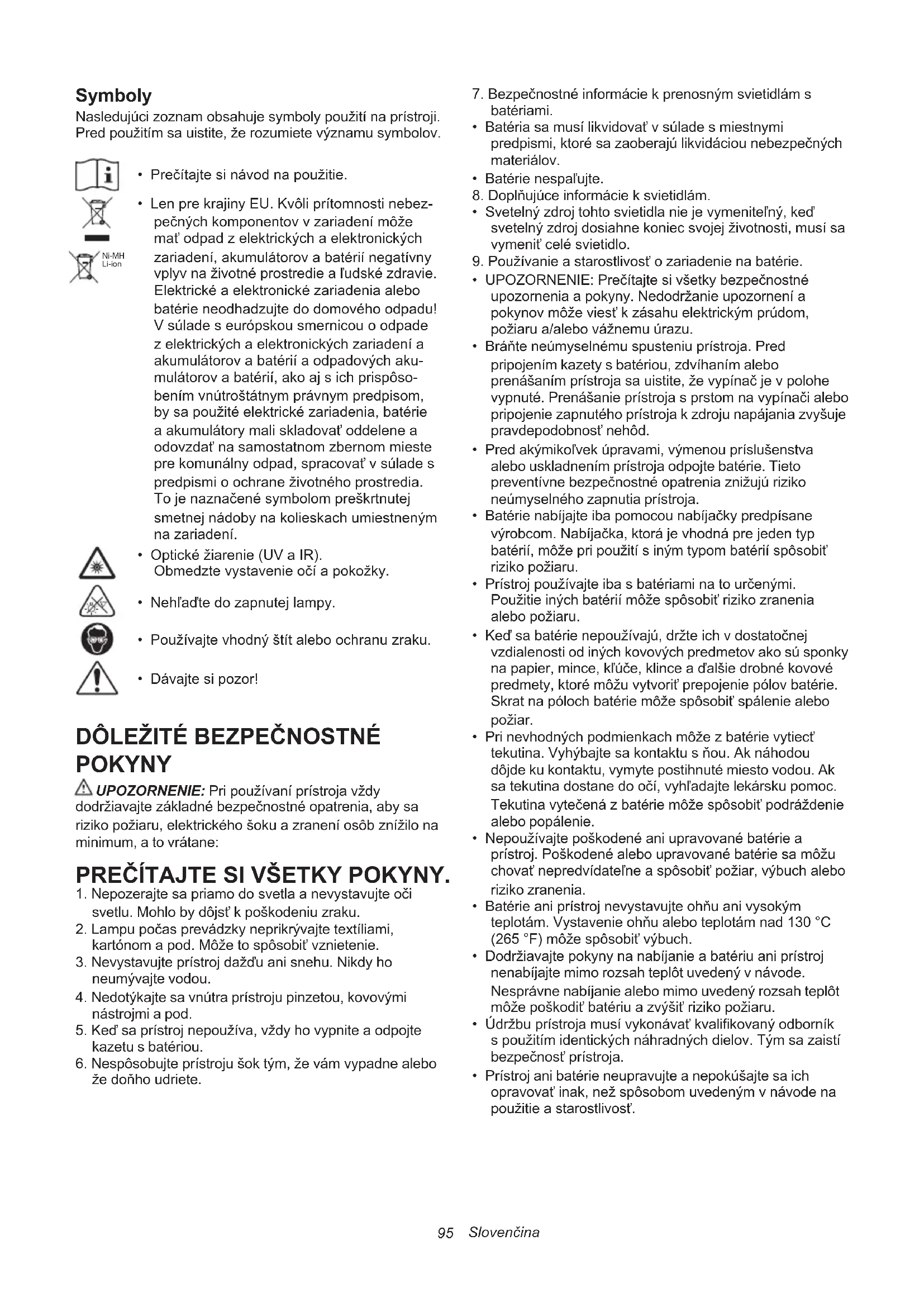 - Len pre krajiny EU. Kvôli prítomnosti nebez- pečnýchkomponentovvzariadenímôže maťodpadzelektrickýchaelektronických zariadení, akumulátorov a batérií negatívny vplyvnaživotnéprostredieaľudskézdravie. Elektrické a elektronické zariadenia alebo batérie neodhadzujte do domového odpadu! V súlade s európskou smernicou o odpade z elektrických a elektronických zariadení a akumulátorov a batérií a odpadových aku- mulátorov a batérií, ako aj s ich prispôso- bením vnútroštátnym právnym predpisom, bysapoužitéelektrickézariadenia,batérie aakumulátorymaliskladovaťoddelenea odovzdaťnasamostatnomzbernommieste prekomunálnyodpad,spracovaťvsúlades predpismioochraneživotnéhoprostredia. Tojenaznačenésymbolompreškrtnutej smetnej nádoby na kolieskach umiestneným na zariadení. Ni-MH Li-ion
