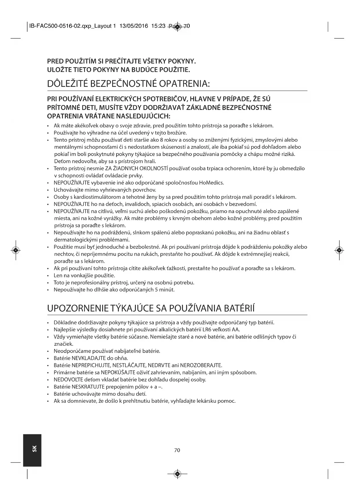 - Ak sa domnievate, že došlo k prehltnutiu batérie, vyhľadajte lekársku pomoc. IB-FAC500-0516-02.qxp_Layout 1 13/05/2016 15:23 Page 7071