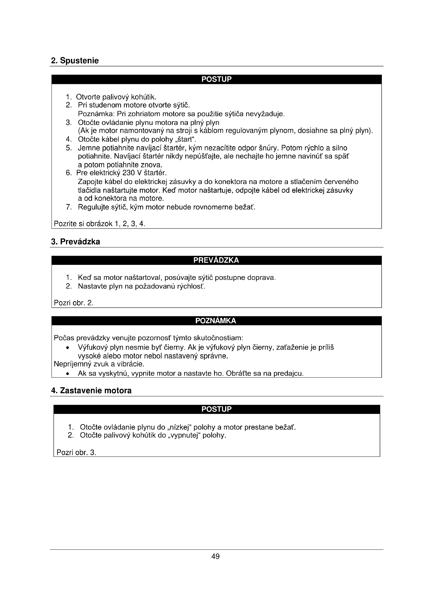 VÝSTRAHA Pred použitím motora si vždy prečítajte používateľskú príručku. VÝSTRAHA Vždy dodržujte usmernenia stanovené vaším predajcom produktov Power Line týkajúce sa motora. VÝSTRAHA Pred plnením benzínu alebo oleja vždy zastavte motor. VÝSTRAHA Vždy dôkladne vyčistite, ak sa rozleje kvapalina. VÝSTRAHA Vždy udržujte motor v stanovenej vzdialenosti od olejov alebo iných horľavých predmetov. VÝSTRAHA Výfukový plyn je nebezpečný, motor používajte len vonku alebo v dobre vetranom priestore. VÝSTRAHA Dávajte veľký pozor, aby ste sa nedostali do kontaktu s rotujúcimi dielmi motora počas prevádzky. VÝSTRAHA Dávajte veľký pozor, aby ste sa nedostali do kontaktu s výfukom bloku motora, pretože je počas prevádzky veľmi horúci. VÝSTRAHA Nikdy nepoužívajte motor pod vplyvom alkoholu alebo liekov.