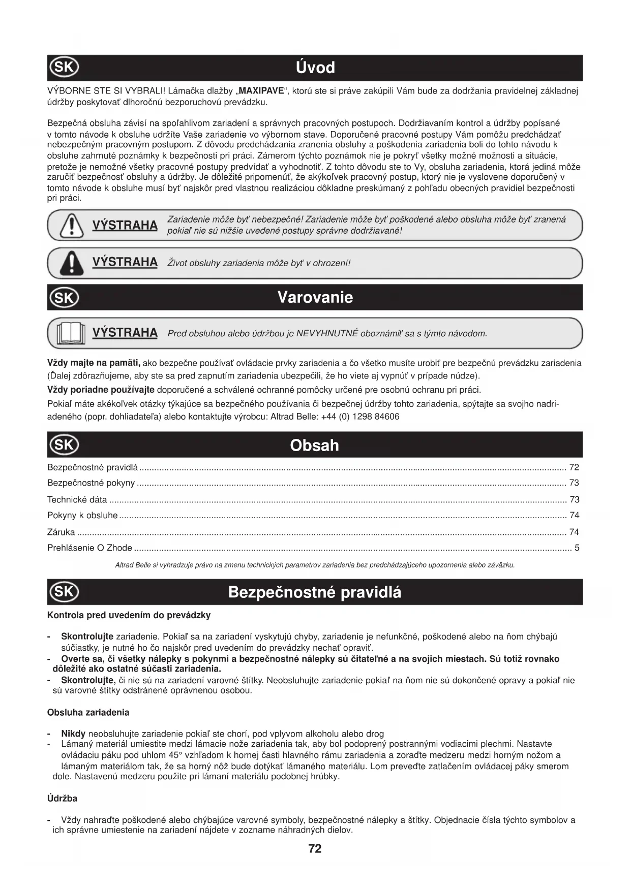 - VÝBORNE STE SI VYBRALI! Lámaþka dlažby „MAXIPAVE“, ktorú ste si práve zakúpili Vám bude za dodržania pravidelnej základnej údržby poskytovaĢ dlhoroþnú bezporuchovú prevádzku. Bezpeþná obsluha závisí na spoĐahlivom zariadení a správnych pracovných postupoch. Dodržiavaním kontrol a údržby popísané v tomto návode k obsluhe udržíte Vaše zariadenie vo výbornom stave. Doporuþené pracovné postupy Vám pomôžu predchádzaĢ nebezpeþným pracovným postupom. Z dôvodu predchádzania zranenia obsluhy a poškodenia zariadenia boli do tohto návodu k obsluhe zahrnuté poznámky k bezpeþnosti pri práci. Zámerom týchto poznámok nie je pokryĢ všetky možné možnosti a situácie, pretože je nemožné všetky pracovné postupy predvídaĢ a vyhodnotiĢ. Z tohto dôvodu ste to Vy, obsluha zariadenia, ktorá jediná môže zaruþiĢ bezpeþnosĢ obsluhy a údržby. Je dôležité pripomenúĢ, že akýkoĐvek pracovný postup, ktorý nie je vyslovene doporuþený v tomto návode k obsluhe musí byĢ najskôr pred vlastnou realizáciou dôkladne preskúmaný z pohĐadu obecných pravidiel bezpeþnosti pri práci. Bezpeþnostné pravidlá p. 72