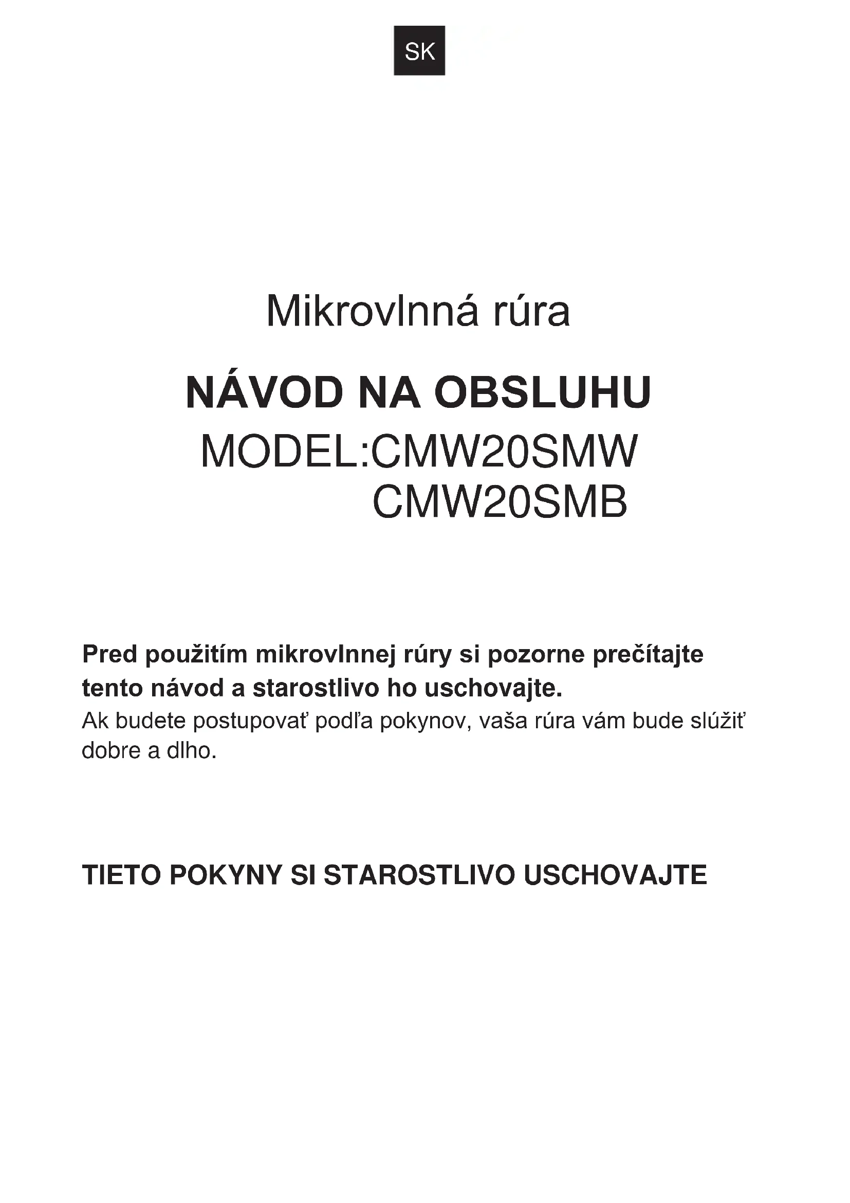 CMW20SMB Pred použitím mikrovlnnej rúry si pozorne prečítajte tento návod a starostlivo ho uschovajte. Ak budete postupovať podľa pokynov, vaša rúra vám bude slúžiť dobre a dlho.