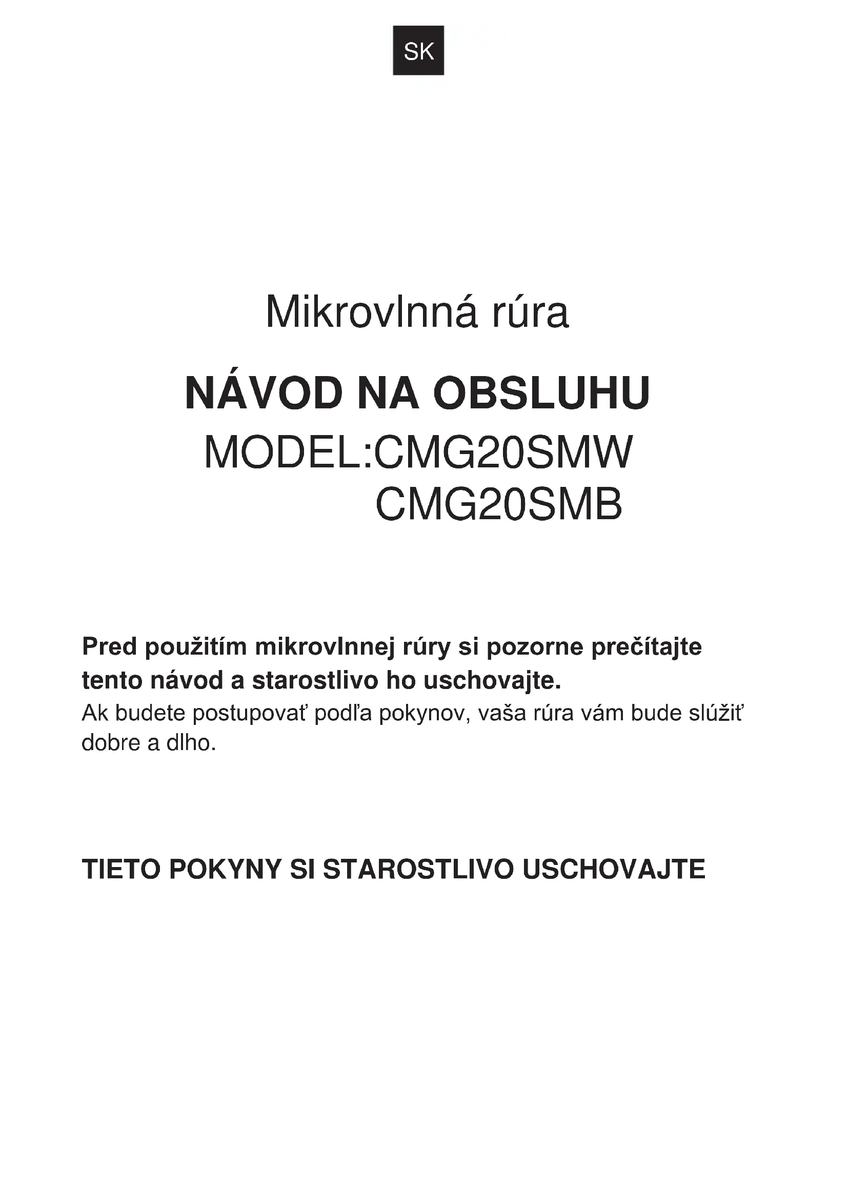 CMG20SMB Pred použitím mikrovlnnej rúry si pozorne prečítajte tento návod a starostlivo ho uschovajte. Ak budete postupovať podľa pokynov, vaša rúra vám bude slúžiť dobre a dlho.