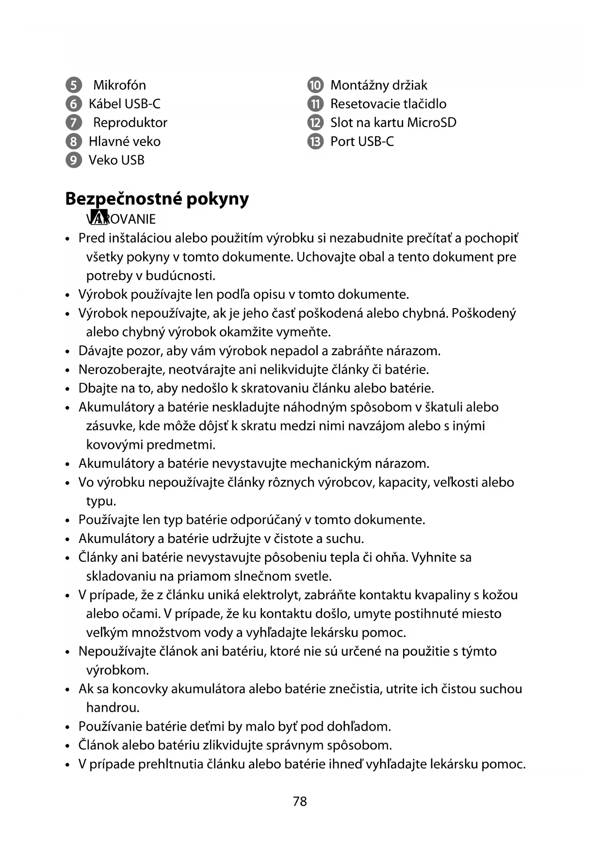 Rýchly návod Wi-Fi kamera s napájaním z batérie WIFICBO30WT Viac informácií nájdete v rozšírenom návode online: ned.is/wicbo30wt Určené použitie Výrobok je určený ako bezpečnostná IP kamera na použitie vo vnútornom a vonkajšom prostredí. Pred inštaláciou a použitím sa oboznámte s miestnymi zákonmi a predpismi týkajúcimi sa bezpečnostných kamier. Výrobok nie je určený na profesionálne použitie. Každá zmena výrobku môže mať následky na bezpečnosť, záruku a správne fungovanie. Hlavné časti (obrázok A) 1 LED indikátor stavu 2 Šošovka kamery 3 Tlačidlo napájania 4 Snímač PIR78 5 Mikrofón 6 Kábel USB-C 7 Reproduktor 8 Hlavné veko 9 Veko USB q Montážny držiak w Resetovacie tlačidlo e Slot na kartu MicroSD r Port USB-C Bezpečnostné pokyny