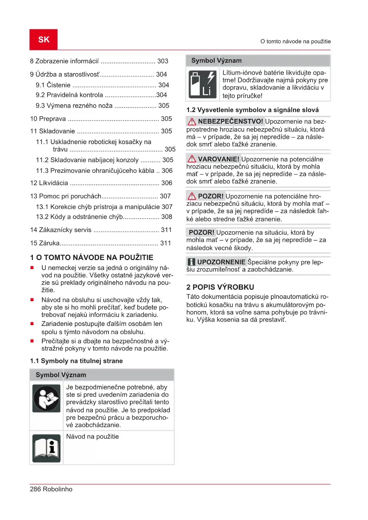 Táto dokumentácia popisuje plnoautomatickú ro- botickú kosačku na trávu s akumulátorovým po- honom, ktorá sa voľne sama pohybuje po trávni- ku. Výška kosenia sa dá prestaviť.442811_a 287 Popis výrobku