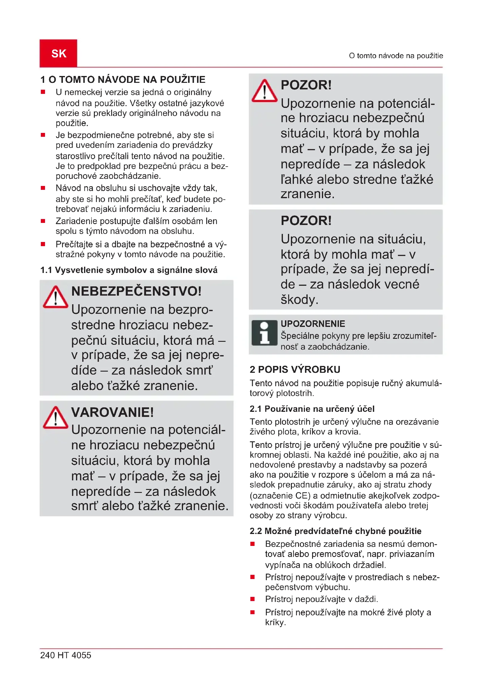 Pri dlhšom používaní je použí- vateľ vystavený vibráciám, čo môže spôsobiť obehové prob- lémy („biele prsty“). Za účelom zníženia tohto rizika noste pracovné rukavice a udržiavajte ruky teplé. Ak zba- dáte symptómy „bielych prs- tov“, okamžite vyhľadajte lekársku pomoc. K týmto symptómom patria: bezcit- nosť, strata citlivosti, mrav- čenie, svrbenie, bolesť, strata sily, zmena farby alebo stavu pokožky. Týmito symptómami sú spravidla postihnuté prsty,SK 250 HT 4055 Bezpečnostné pokyny dlane alebo tep. Pri nízkych teplotách je nebezpečenstvo väčšie.
