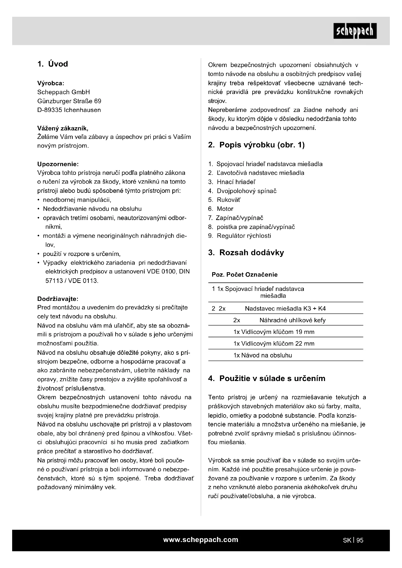 Tento prístroj je určený na rozmiešavanie tekutých a práškových stavebných materiálov ako sú farby, malta, lepidlo, omietky a podobné substancie. Podľa konzis- tencie materiálu a množstva určeného na miešanie, je potrebné zvoliť správny miešač s príslušnou účinnos- ťou miešania. Výrobok sa smie používať iba v súlade so svojím urče- ním. Každé iné použitie presahujúce určenie je pova- žované za používanie v rozpore s určením. Za škody z neho vzniknuté alebo poranenia akéhokoľvek druhu ručí používateľ/obsluha, a nie výrobca.www.scheppach.com