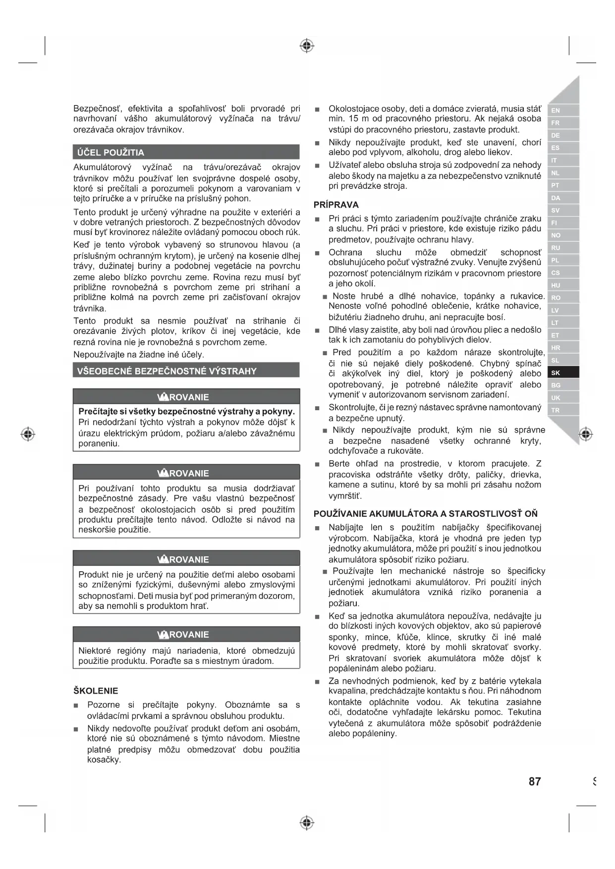 Akumulátorový vyžínač na trávu/orezávač okrajov trávnikov môžu používať len svojprávne dospelé osoby, ktoré si prečítali a porozumeli pokynom a varovaniam v tejto príručke a v príručke na príslušný pohon. Tento produkt je určený výhradne na použite v exteriéri a v dobre vetraných priestoroch. Z bezpečnostných dôvodov musí byť krovinorez náležite ovládaný pomocou oboch rúk. Keď je tento výrobok vybavený so strunovou hlavou (a príslušným ochranným krytom), je určený na kosenie dlhej trávy, dužinatej buriny a podobnej vegetácie na povrchu zeme alebo blízko povrchu zeme. Rovina rezu musí byť približne rovnobežná s povrchom zeme pri strihaní a približne kolmá na povrch zeme pri začisťovaní okrajov trávnika. Tento produkt sa nesmie používať na strihanie či orezávanie živých plotov, kríkov či inej vegetácie, kde rezná rovina nie je rovnobežná s povrchom zeme. Nepoužívajte na žiadne iné účely.