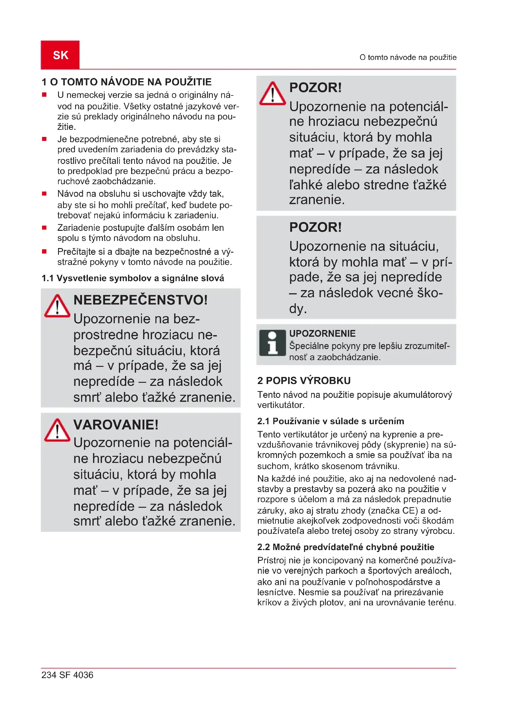 Tento vertikutátor je určený na kyprenie a pre- vzdušňovanie trávnikovej pôdy (skyprenie) na sú- kromných pozemkoch a smie sa používať iba na suchom, krátko skosenom trávniku. Na každé iné použitie, ako aj na nedovolené nad- stavby a prestavby sa pozerá ako na použitie v rozpore s účelom a má za následok prepadnutie záruky, ako aj stratu zhody (značka CE) a od- mietnutie akejkoľvek zodpovednosti voči škodám používateľa alebo tretej osoby zo strany výrobcu.