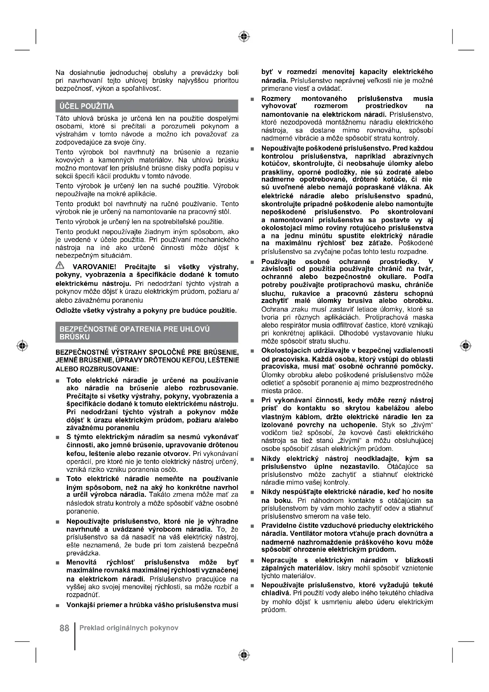 Táto uhlová brúska je určená len na použitie dospelými osobami, ktoré si prečítali a porozumeli pokynom a výstrahám v tomto návode a možno ich považovať za zodpovedajúce za svoje činy. Tento výrobok bol navrhnutý na brúsenie a rezanie kovových a kamenných materiálov. Na uhlovú brúsku možno montovať len príslušné brúsne disky podľa popisu v sekcii špecifi kácií produktu v tomto návode. Tento výrobok je určený len na suché použitie. Výrobok nepoužívajte na mokré aplikácie. Tento produkt bol navrhnutý na ručné používanie. Tento výrobok nie je určený na namontovanie na pracovný stôl. Tento výrobok je určený len na spotrebiteľské použitie. Tento produkt nepoužívajte žiadnym iným spôsobom, ako je uvedené v účele použitia. Pri používaní mechanického nástroja na iné ako určené činnosti môže dôjsť k nebezpečným situáciám. VAROVANIE! Prečítajte si všetky výstrahy, pokyny, vyobrazenia a špecifikácie dodané k tomuto elektrickému nástroju. Pri nedodržaní týchto výstrah a pokynov môže dôjsť k úrazu elektrickým prúdom, požiaru a/ alebo závažnému poraneniu Odložte všetky výstrahy a pokyny pre budúce použitie.