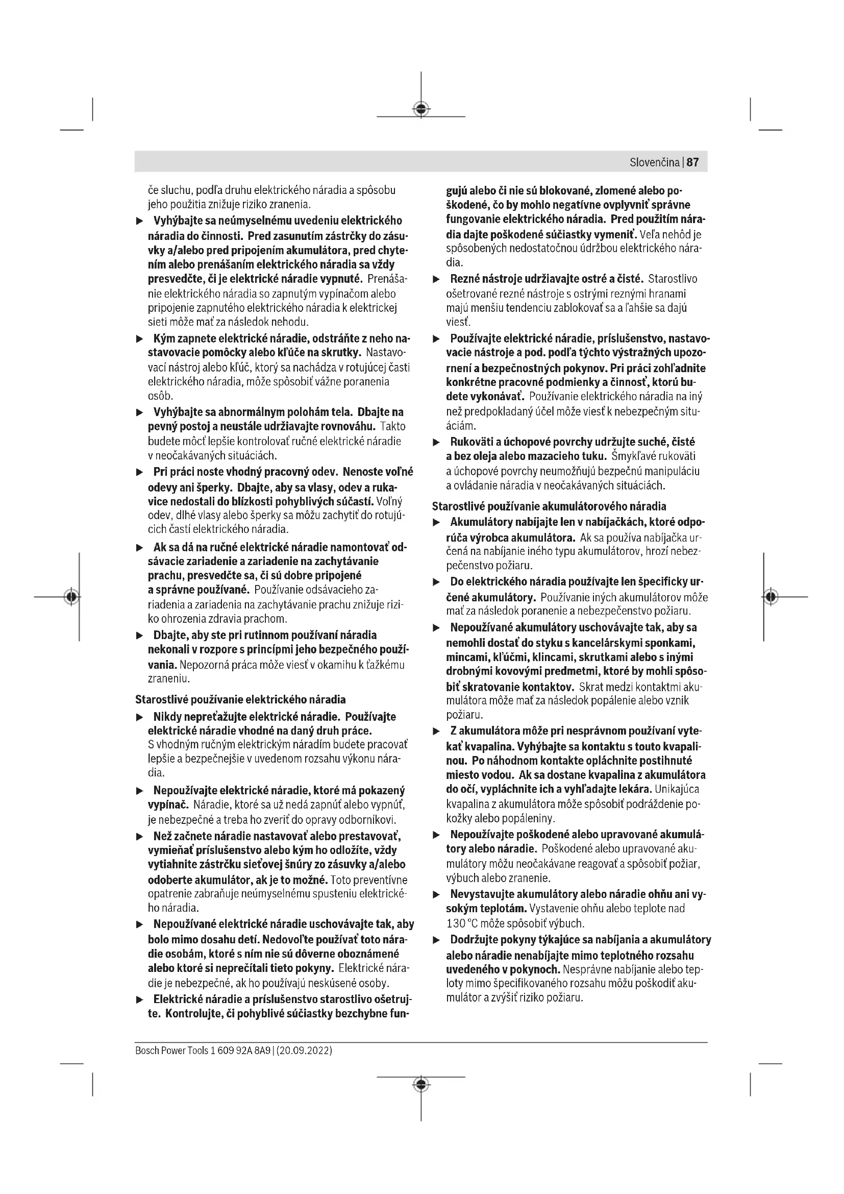 Úroveň vibrácií ahodnota emisií hluku uvedené vtýchto po- kynoch boli namerané podľa normovaného meracieho po- 1 609 92A 8A9 | (20.09.2022) Bosch Power ToolsSlovenčina | 89 stupu adajú sa použiť na vzájomné porovnávanie elektrické- ho náradia. Hodia sa aj na predbežný odhad emisie vibrácií ahluku. Uvedená úroveň vibrácií ahodnota emisií hluku reprezentuje hlavné spôsoby použitia elektrického náradia. Ak sa však elektrické náradie využíva na iné spôsoby použitia, sodlišný- mi vkladacími nástrojmi alebo pri nedostatočnej údržbe, mô- že sa úroveň vibrácií ahodnota emisií hlukuodlišovať. To môže emisiu vibrácií ahluku počas celého pracovného času výrazne zvýšiť. Na presný odhad emisií vibrácií ahluku by sa mal zohľadniť aj čas, vpriebehu ktorého je náradie vypnuté alebo síce spustené, ale vskutočnosti sa nepoužíva. To môže emisie vibrácií ahluku počas celého pracovného času výrazne zní- žiť. Na ochranu obsluhujúcej osoby pred pôsobením vibrácií ur- čite doplnkové bezpečnostné opatrenia, ako napríklad: údrž- ba elektrického náradia avkladacích nástrojov, udržiavanie správnej teploty rúk, organizácia pracovných procesov. Akumulátor Bosch predáva akumulátorové elektrické náradie aj bez aku- mulátora. Informáciu, či je súčasťou dodávky vášho elektric- kého náradia akumulátor, nájdete na obale. Nabíjanie akumulátora u Používajte len nabíjačky uvedené vtechnických úda- joch. Len tieto nabíjačky sú prispôsobené na lítium-ió- nový akumulátor používaný pri vašom elektrickom náradí. Upozornenie: Lítiovo-iónové akumulátory sa na základe medzinárodných dopravných predpisov dodávajú čiastočne nabité. Aby ste zaručili plný výkon akumulátora, pred prvým použitím ho úplne nabite. Vkladanie akumulátora Zasuňte nabitý akumulátor do uchytenia akumulátora tak, aby zaskočil. Vyberanie akumulátora Na vybratie akumulátora stlačte odisťovacie tlačidlo akumu- látora aakumulátor vytiahnite von. Nepoužívajte pritom ne- primeranú silu. Akumulátorje vybavený 2blokovacími stupňami, ktoré majú zabrániť tomu, aby pri neúmyselnom stlačení odisťovacieho tlačidlaakumulátor nevypadol. Kým sa akumulátor nachádza velektrickom náradí, je pridržiavaný vsprávnej polohe po- mocou pružiny. Indikácia stavu nabitia akumulátora Zelené LED kontrolky indikácie stavu nabitia akumulátora zo- brazujú stav nabitia akumulátora. Zbezpečnostných dôvo- dov je zisťovanie stavu nabitia možné len vtedy, keď je elektrické náradie zastavené. Stlačte tlačidlo pre indikáciu stavu nabitia alebo , aby sa zobrazil stav nabitia. Je to možné aj vtedy, keď je akumu- látor vybratý. Ak po stlačení tlačidla pre indikáciu stavu nabitia nesvieti žiadna LED kontrolka, akumulátor je chybný amusí sa vyme- niť. Typ akumulátora GBA 18V... LED Kapacita Trvalé svietenie 3× zelená 60–100% Trvalé svietenie 2× zelená 30–60% Trvalé svietenie 1× zelená 5–30% Blikanie 1× zelená 0–5% Typ akumulátora ProCORE18V... LED Kapacita Trvalé svietenie 5× zelená 80–100% Trvalé svietenie 4× zelená 60–80% Trvalé svietenie 3× zelená 40–60% Trvalé svietenie 2× zelená 20–40% Trvalé svietenie 1× zelená 5–20% Blikanie 1× zelená 0–5% Pokyny na optimálne zaobchádzanie sakumulátorom Chráňte akumulátor pred vlhkosťou avodou. Akumulátor skladujte iba pri teplote vrozsahu od –20°C do 50°C. Nenechávajte akumulátor napríklad vlete položený vautomobile. Príležitostne vyčistite vetracie štrbiny akumulátora čistým, mäkkým asuchým štetcom. Výrazne skrátená doba prevádzky akumulátora po nabití sig- nalizuje, že akumulátor je opotrebovaný atreba ho vymeniť za nový. Dodržiavajte upozornenia týkajúce sa likvidácie. Prevádzka Uvedenie do prevádzky Zapnutie/vypnutie Na zapnutie elektrického náradia posuňte vypínač(3) do- predu tak, aby sa na prepínači objavil znak I. Na vypnutie elektrického náradia posuňte vypínač(3) doza- du tak, aby sa na prepínači objavila 0. Ochrana pred opätovným spustením Ochrana pred opätovným spustením zabraňuje nekontrolo- vanému spusteniu elektrického náradia po prerušení dodáv- ky elektrického prúdu. Bosch Power Tools 1 609 92A 8A9 | (20.09.2022)90 | Slovenčina Ak chcete uviesť elektrické náradie znova do prevádzky, pre- pnite vypínač (3) do vypnutej polohy aelektrické náradie znova zapnite. Pozvoľný rozbeh Elektronicky regulovaný pozvoľný rozbeh obmedzuje krútiaci moment náradia pri zapnutí apredlžuje životnosť motora. Zmena smeru rezu Pri zmene smeru rezu môžete držiak matrice(7) otočiť do troch polôh posunutých vždy o90°. Smer rezu dozadu (smerom ktelesu náradia) nie je možný. Pri otáčaní držiaka matrice(7) povoľujte skrutku(4) dovte- dy, kým nie je možné držiak matrice otáčať. Otočte ho o90° kpozdĺžnej osi elektrického náradia doprava alebo doľava. Dbajte na to, aby skrutka(4) dosiahla do otvoru na držiaku matrice(7). Skrutku utiahnite. Upozornenia týkajúce sa prác u Pred všetkými prácami na elektrickom náradí (naprí- klad údržba, výmena nástroja apodobne), ako aj pri jeho preprave auskladnení vyberte akumulátor zelektrického náradia. Vprípade neúmyselného aktivo- vania vypínača hrozí nebezpečenstvo poranenia. u Elektrické náradie nie je vhodné na stacionárnu pre- vádzku. Nesmie sa napríklad upínať do zveráka alebo upevňovať na pracovnom stole. u Pri práci noste ochranné rukavice. Na strihaných plechoch vznikajú ostré ostrapky, na ktorých sa môžete poraniť. u Pozor pri manipulácii sodstrihnutými trieskami. Tieto triesky majú ostré hroty, na ktorých by ste sa mohli veľmi ľahko poraniť. Kobrobku prisúvajte elektrické náradie iba vzapnutom stave. Elektrické náradie držte vždy kolmo na povrch plechu ad