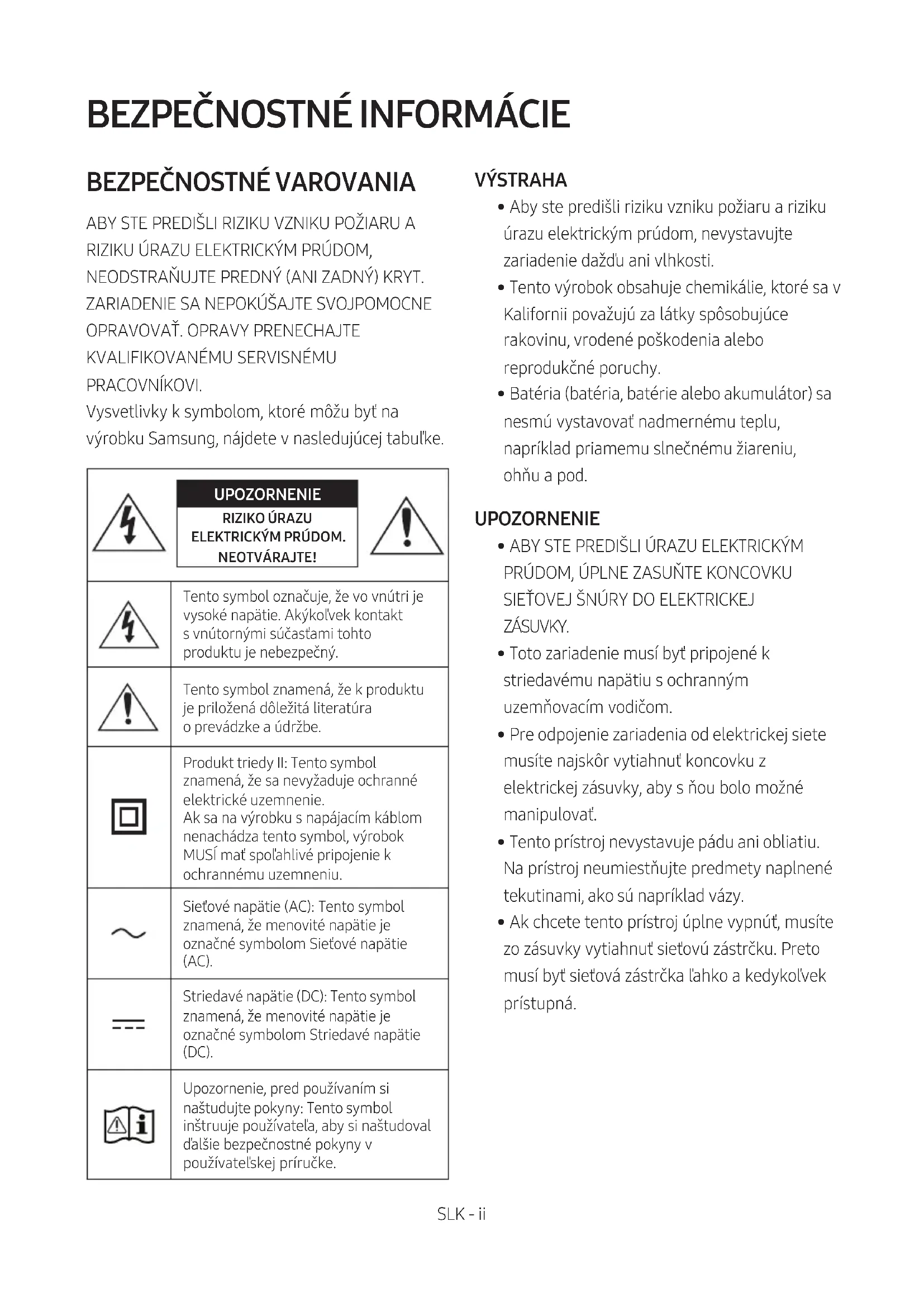 PRACOVNÍKOVI. Vysvetlivky k symbolom, ktoré môžu byť na výrobku Samsung, nájdete v nasledujúcej tabuľke. UPOZORNENIE RIZIKO ÚRAZU ELEKTRICKÝM PRÚDOM. NEOTVÁRAJTE!Tento symbol označuje, že vo vnútri je vysoké napätie. Akýkoľvek kontakt svnútornými súčasťami tohto produktu je nebezpečný.Tento symbol znamená, že kproduktu je priložená dôležitá literatúra oprevádzke a údržbe.Produkt triedy II: Tento symbol znamená, že sa nevyžaduje ochranné elektrické uzemnenie.Ak sa na výrobku s napájacím káblom nenachádza tento symbol, výrobok MUSÍ mať spoľahlivé pripojenie k ochrannému uzemneniu. Sieťové napätie (AC): Tento symbol znamená, že menovité napätie je označné symbolom Sieťové napätie (AC).Striedavé napätie (DC): Tento symbol znamená, že menovité napätie je označné symbolom Striedavé napätie (DC).Upozornenie, pred používaním si naštudujte pokyny: Tento symbol inštruuje používateľa, aby si naštudoval ďalšie bezpečnostné pokyny v používateľskej príručke. VÝSTRAHA