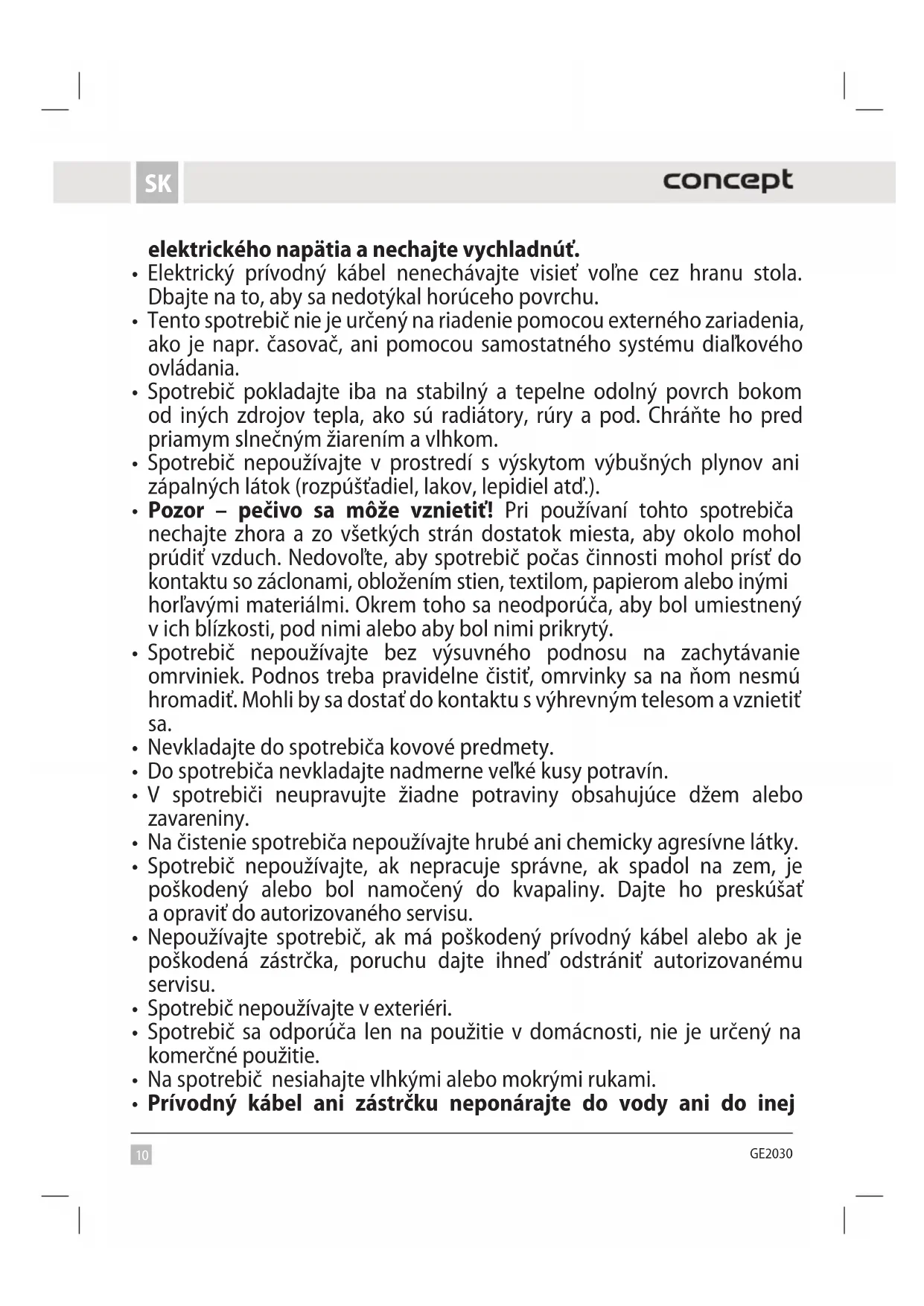 - Plastové vrecúška z polyetylénu (PE) odovzdajte do zberu materiálu na recykláciu. Recyklácia prístroja na konci jeho životnosti Tento spotrebič je označený v súlade s európskou smernicou 2012/19/EÚ o elektrickom odpade a elektrických zariadeniach (WEEE). Symbol na výrobku alebo jeho obale udáva, že tento výrobok nepatrí do domáceho odpadu Treba ho odovzdať na zberné miesto na recykláciu elektrických a elektronických zariadení. Zaistením správnej likvidácie tohto výrobku zabránite negatívnym dôsledkom na životné prostredie a ľudské zdravie. Likvidácia musí byť vykonaná vsúlade s predpismi na likvidáciu odpadu. Podrobnejšie informácie o recyklácii tohto výrobku zistíte na príslušnom miestnom úrade, u služby na likvidáciu domového odpadu alebo vobchode, kde ste výrobok kúpili. Tento výrobok spĺňa všetky základné požiadavky smerníc EÚ, ktoré pre neho platia. Zmeny v texte, vzhľade a technických špecifikáciách môžu nastať bez predošlého upozornenia a na tieto zmeny si vyhradzujeme právo . PODZIĘKOWANIE Dziękujemy za zakup produktu marki Concept i życzymy Państwu zadowolenia z naszego produktu przez cały czas jego użytkowania. Przed pierwszym użyciem prosimy o uważne przeczytanie całej instrukcji obsługi oraz zachowanie jej na przyszłość. Należy zadbać o to, aby także inne osoby, które będą obchodziły się z produktem, zapoznały się z niniejszą instrukcją. Parametry techniczne Napięcie 220-240 V ~ 50/60 Hz Pobór mocy 1750-2100 W WAŻNE PRZESTROGI DOTYCZĄCE BEZPIECZEŃSTWA