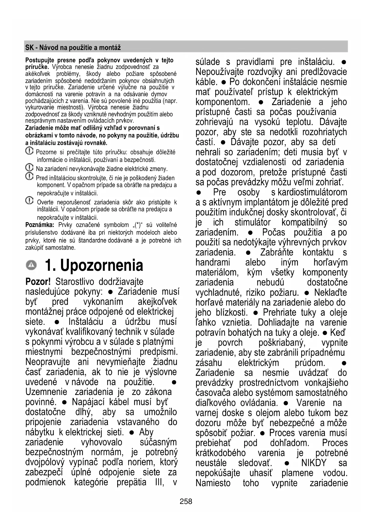 Pozor! Starostlivo dodržiavajte nasledujúce pokyny: ● Zariadenie musí byť pred vykonaním akejkoľvek montážnej práce odpojené od elektrickej siete. ● Inštaláciu a údržbu musí vykonávať kvalifikovaný technik v súlade s pokynmi výrobcu a v súlade s platnými miestnymi bezpečnostnými predpismi. Neopravujte ani nevymieňajte žiadnu časť zariadenia, ak to nie je výslovne uvedené v návode na použitie. ● Uzemnenie zariadenia je zo zákona povinné. ● Napájací kábel musí byť dostatočne dlhý, aby sa umožnilo pripojenie zariadenia vstavaného do nábytku k elektrickej sieti. ● Aby zariadenie vyhovovalo súčasným bezpečnostným normám, je potrebný dvojpólový vypínač podľa noriem, ktorý zabezpečí úplné odpojenie siete za podmienok kategórie prepätia III, v súlade s pravidlami pre inštaláciu. ● Nepoužívajte rozdvojky ani predlžovacie káble. ● Po dokončení inštalácie nesmie mať používateľ prístup k elektrickým komponentom. ● Zariadenie a jeho prístupné časti sa počas používania zohrievajú na vysokú teplotu. Dávajte pozor, aby ste sa nedotkli rozohriatych častí. ● Dávajte pozor, aby sa deti nehrali so zariadením; deti musia byť v dostatočnej vzdialenosti od zariadenia a pod dozorom, pretože prístupné časti sa počas prevádzky môžu veľmi zohriať. ● Pre osoby s kardiostimulátorom a s aktívnym implantátom je dôležité pred použitím indukčnej dosky skontrolovať, či je ich stimulátor kompatibilný so zariadením. ● Počas použitia a po použití sa nedotýkajte výhrevných prvkov zariadenia. ● Zabráňte kontaktu s handrami alebo iným horľavým materiálom, kým všetky komponenty zariadenia nebudú dostatočne vychladnuté, riziko požiaru. ● Neklaďte horľavé materiály na zariadenie alebo do jeho blízkosti. ● Prehriate tuky a oleje ľahko vznietia. Dohliadajte na varenie potravín bohatých na tuky a oleje. ● Keď je povrch poškriabaný, vypnite zariadenie, aby ste zabránili prípadnému zásahu elektrickým prúdom. ● Zariadenie sa nesmie uvádzať do prevádzky prostredníctvom vonkajšieho časovača alebo systémom samostatného diaľkového ovládania. ● Varenie na varnej doske s olejom alebo tukom bez dozoru môže byť nebezpečné a môže spôsobiť požiar. ● Proces varenia musí prebiehať pod dohľadom. Proces krátkodobého varenia je potrebné neustále sledovať. ● NIKDY sa nepokúšajte uhasiť plamene vodou. Namiesto toho vypnite zariadenie259 a zakryte plameň napríklad vekom alebo hasiacou pokrývkou. Nebezpečenstvo požiaru: neukladajte predmety na varnú dosku. ● Nepoužívajte parné čističe, existuje riziko úrazu elektrickým prúdom. ● Neukladajte magnetické predmety ako nože, vidličky, lyžice na povrch varnej dosky, pretože by sa mohli prehriať. ● Pred pripojením zariadenia k elektrickej sieti: skontrolujte identifikačný štítok (umiestnený na spodnej časti zariadenia), aby ste sa uistili, že napätie a výkon zodpovedajú hodnotám siete a že elektrická zásuvka je vhodná. V prípade pochybností kontaktujte kvalifikovaného elektrikára. Dôležité: ● Po použití vypnite varnú dosku ovládacím zariadením a nespoliehajte sa na detektor prítomnosti hrnca. ● Zabráňte rozliatiu tekutín, preto pri uvádzaní tekutín do varu alebo pri ich ohrievaní znížte prívod tepla. ● Nenechávajte ohrievacie prvky zapnuté, keď sú na nich uložené prázdne hrnce alebo panvice, alebo keď na nich nie sú uložené žiadne nádoby. ● Po dokončení varenia vypnite príslušnú varnú zónu. ● Na varenie nikdy nepoužívajte hliníkovú fóliu a nikdy na dosku priamo neumiestňujte výrobky balené do hliníka. Došlo by k roztopeniu hliníka a nenapraviteľnému poškodeniu vášho zariadenia. ● Nikdy neohrievajte neotvorenú konzervu alebo plechovú nádobu s potravinami: môže vybuchnúť! Toto upozornenie platí pre všetky ostatné druhy varných dosiek. ● Použitie vysokého výkonu, ako je funkcia Booster, nie je vhodné pre zohrievanie niektorých tekutín, ako napríklad olej na vyprážanie. Nadmerné teplo by mohlo byť nebezpečné. V týchto prípadoch odporúčame použiť nižší výkon. ● Nádoby musia byť umiestnené priamo na varnej ploche a musia byť v strede. V žiadnom prípade nevkladajte medzi hrniec a varnú dosku iné predmety. ● V prípade vysokých teplôt zariadenie automatický zníži stupeň výkonu varných zón. ● Skôr ako vykonáte akýkoľvek úkon čistenia alebo údržby, zariadenie odpojte z elektrickej siete vytiahnutím zástrčky alebo vypnutím hlavného vypínača obydlia. ● Pri všetkých úkonoch montáže a údržby používajte pracovné rukavice. ● Zariadenie smú používať deti staršie ako 8 rokov a osoby s obmedzenými fyzickými, zmyslovými alebo mentálnymi schopnosťami alebo bez skúseností alebo potrebných znalostí len vtedy, keď sú pod dozorom alebo keď im boli dané pokyny týkajúce sa bezpečného používania zariadenia a tieto osoby pochopili nebezpečenstvá spojené so zariadením. ● Deti musia byť pod dozorom, aby sa so zariadením nehrali. ● Čistenie a údržbu nesmú vykonávať deti bez dozoru. ● V miestnosti musí byť zabezpečené dostatočné vetranie, keď sa zariadenie používa súčasne s ďalšími spaľovacími zariadeniami na plyn alebo iné palivá. ● Zariadenie sa musí často čistiť, zvnútra aj zvonku (ASPOŇ RAZ ZA MESIAC), v každom prípade dodržiavajte pokyny výslovne uvedené v pokynoch na údržbu. ● Nedodržanie postupov čistenia zariadenia a výmeny a čistenia filtrov spôsobuje riziká požiarov. ● Varenie na spôsob flambovania je prísne zakázané. ● Použitie otvoreného ohňa je škodlivé pre filtre a môže vyvolať požiar, preto sa mu vždy vyhýbajte. ● Vyprážanie je nutné vykonávať pod dozorom, aby sa zabránilo zapáleniu prehriateho olej