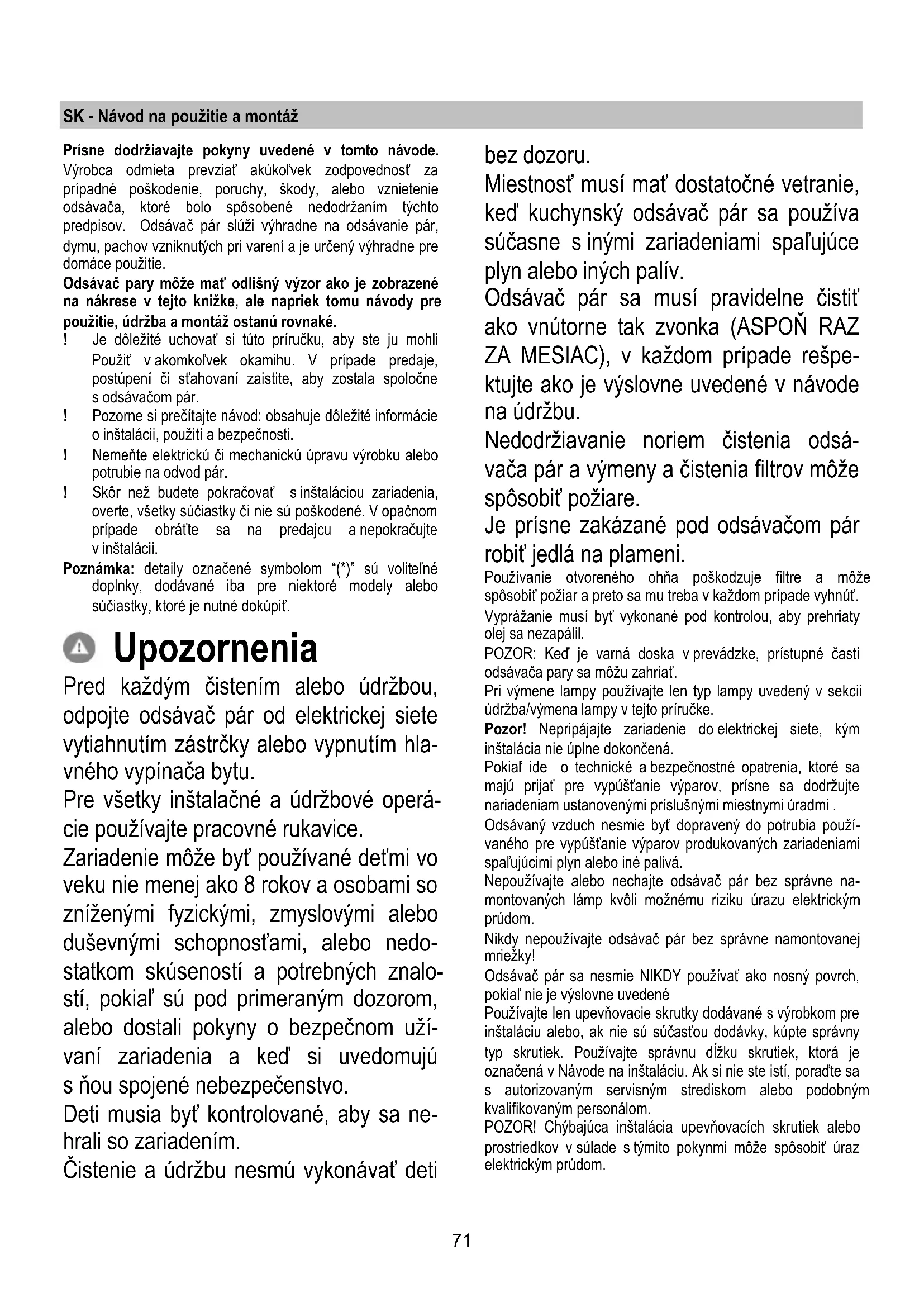Jestliže osvětlení nefunguje, dříve než zavoláte servis si ověřte, zda jste správně nasadili žárovky do uložení.71 SK - Návod na použitie a montáž Prísne dodržiavajte pokyny uvedené v tomto návode. Výrobca odmieta prevziať akúkoľvek zodpovednosť za prípadné poškodenie, poruchy, škody, alebo vznietenie odsávača, ktoré bolo spôsobené nedodržaním týchto predpisov. Odsávač pár slúži výhradne na odsávanie pár, dymu, pachov vzniknutých pri varení a je určený výhradne pre domáce použitie. Odsávač pary môže mať odlišný výzor ako je zobrazené na nákrese v tejto knižke, ale napriek tomu návody pre použitie, údržba a montáž ostanú rovnaké. ! Je dôležité uchovať si túto príručku, aby ste ju mohli Použiť v akomkoľvek okamihu. V prípade predaje, postúpení či sťahovaní zaistite, aby zostala spoločne s odsávačom pár. ! Pozorne si prečítajte návod: obsahuje dôležité informácie o inštalácii, použití a bezpečnosti. ! Nemeňte elektrickú či mechanickú úpravu výrobku alebo potrubie na odvod pár. ! Skôr než budete pokračovať s inštaláciou zariadenia, overte, všetky súčiastky či nie sú poškodené. V opačnom prípade obráťte sa na predajcu a nepokračujte v inštalácii. Poznámka: detaily označené symbolom “(*)” sú voliteľné doplnky, dodávané iba pre niektoré modely alebo súčiastky, ktoré je nutné dokúpiť. Upozornenia Pred každým čistením alebo údržbou, odpojte odsávač pár od elektrickej siete vytiahnutím zástrčky alebo vypnutím hla- vného vypínača bytu. Pre všetky inštalačné a údržbové operá- cie používajte pracovné rukavice. Zariadenie môže byť používané deťmi vo veku nie menej ako 8 rokov a osobami so zníženými fyzickými, zmyslovými alebo duševnými schopnosťami, alebo nedo- statkom skúseností a potrebných znalo- stí, pokiaľ sú pod primeraným dozorom, alebo dostali pokyny o bezpečnom uží- vaní zariadenia a keď si uvedomujú s ňou spojené nebezpečenstvo. Deti musia byť kontrolované, aby sa ne- hrali so zariadením. Čistenie a údržbu nesmú vykonávať deti bez dozoru. Miestnosť musí mať dostatočné vetranie, keď kuchynský odsávač pár sa používa súčasne s inými zariadeniami spaľujúce plyn alebo iných palív. Odsávač pár sa musí pravidelne čistiť ako vnútorne tak zvonka (ASPOŇ RAZ ZA MESIAC), v každom prípade rešpe- ktujte ako je výslovne uvedené v návode na údržbu. Nedodržiavanie noriem čistenia odsá- vača pár a výmeny a čistenia filtrov môže spôsobiť požiare. Je prísne zakázané pod odsávačom pár robiť jedlá na plameni. Používanie otvoreného ohňa poškodzuje filtre a môže spôsobiť požiar a preto sa mu treba v každom prípade vyhnúť. Vyprážanie musí byť vykonané pod kontrolou, aby prehriaty olej sa nezapálil. POZOR: Keď je varná doska v prevádzke, prístupné časti odsávača pary sa môžu zahriať. Pri výmene lampy používajte len typ lampy uvedený v sekcii údržba/výmena lampy v tejto príručke. Pozor! Nepripájajte zariadenie do elektrickej siete, kým inštalácia nie úplne dokončená. Pokiaľ ide o technické a bezpečnostné opatrenia, ktoré sa majú prijať pre vypúšťanie výparov, prísne sa dodržujte nariadeniam ustanovenými príslušnými miestnymi úradmi . Odsávaný vzduch nesmie byť dopravený do potrubia použí- vaného pre vypúšťanie výparov produkovaných zariadeniami spaľujúcimi plyn alebo iné palivá. Nepoužívajte alebo nechajte odsávač pár bez správne na- montovaných lámp kvôli možnému riziku úrazu elektrickým prúdom. Nikdy nepoužívajte odsávač pár bez správne namontovanej mriežky! Odsávač pár sa nesmie NIKDY používať ako nosný povrch, pokiaľ nie je výslovne uvedené Používajte len upevňovacie skrutky dodávané s výrobkom pre inštaláciu alebo, ak nie sú súčasťou dodávky, kúpte správny typ skrutiek. Používajte správnu dĺžku skrutiek, ktorá je označená v Návode na inštaláciu. Ak si nie ste istí, poraďte sa s autorizovaným servisným strediskom alebo podobným kvalifikovaným personálom. POZOR! Chýbajúca inštalácia upevňovacích skrutiek alebo prostriedkov v súlade s týmito pokynmi môže spôsobiť úraz elektrickým prúdom.72 Tento spotrebič je označený v súlade s európskou smernicou 2012/19/EC o likvidácii elektrického a elektronického zariadenia (WEEE). Uistením sa, že tento výrobok bol po svojej životnosti odstrá- nený správnym spôsobom, užívateľ prispieva k predchádzaniu možným negatívnym následkom pre životné prostredie a zdravie. Symbol výrobku alebo na jeho sprievodnej dokumentá- cii, upozorňuje, že s týmto výrobkom sa nesmie zaobchádzať ako s domácim odpadom, ale musí byť odovzdaný do prí- slušné miesta zberu pre recykláciu elektrických a elektronických prístrojov. Zbaviť sa ho riadením sa podľa miestnych zákonov o odstránení odpadkov. Kvôli dokonale- jším informáciám o zaobchádzaní, znovuzískaní a recyklácii tohto výrobku, kontaktujte príslušné miestne úrady, služby pre zber domáceho odpadu alebo predajňu , v ktorej výrobok bol zakúpený. Prístroj bol navrhnutý, testovaný a vyrobený v súlade s: