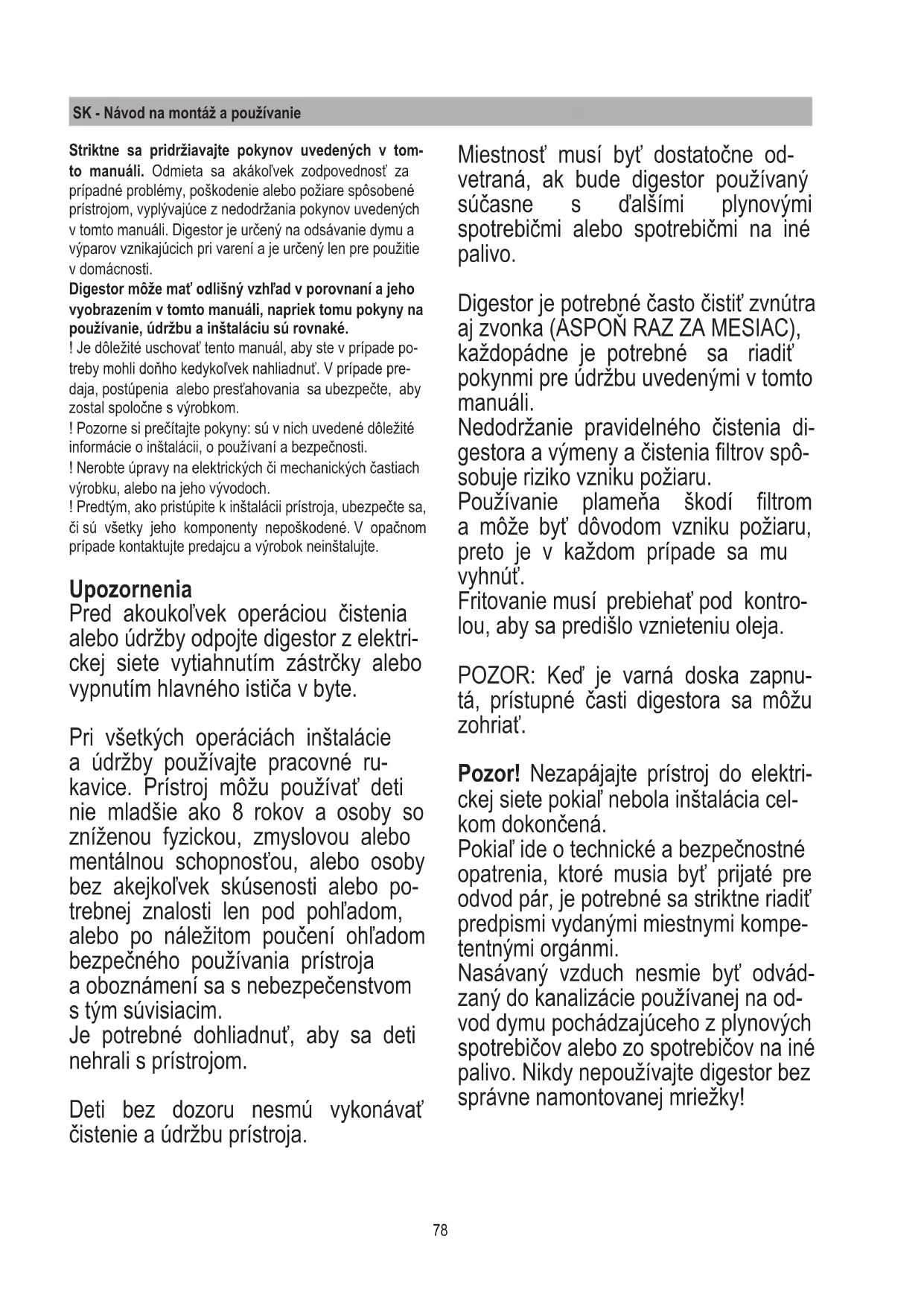 - Odsavač par nechte klesnout seshora až na příslušné sedlo a přišroubujte ke zdi jak uvedeno (Obr. 2).77 Indikátor nasycení ltrů Odsavač par indikuje kdy je nutno čistit ltry: Tukový ltr (každých cca 40 hod provozu): veškeré Led se rozsvítí modře Pachový ltr s aktivními uhlíky (každých cca 160 hod provozu): veškeré Led se rozsvítí modře, Led L2 a L3 bli- kají Reset signalizace nasycení ltrů Po vykonaném vyčištĕní ltrů podržte stisknuté tlačítko T1 a T3, Led L1, L2 a L3 krátce blikají modrým svĕtlem a pak nakonec zhasnou. Aktivace indikátoru signalizace nasycení pachových ltrů s aktivními uhlíky Tento indikátor je obyčejnĕ deaktivován. Pro jeho aktivaci postupujte podle následovného: Při vypnutém odsavači par tisknĕte a podržte stisknuté tlačítko a zároveň T1 a T2: nejdřív se rozsvítí L1 pak také L2 a L3 posléze po uvolnĕní tlačítek Led L2 a L3 krátce blikají na potvrzení aktivace. Deaktivace LED nasycení ltru s aktivními uhlíky: opa- kujte výše uvedenou operaci, ponejprv se rozsvítí zároveň Led L1, L2 a L3 posléze po uvolnĕní tlačítek Led L2 a L3 zhasnou na potvrzení deaktivace. ÚDRŽBA Tukový ltr Zachycuje tukové částice z vaření. Tukový ltr je nutné jednou měsíčně (nebo když systém signalizace nasycení ltrů signalizuje nutnost umytí) umýt pomocí neagresivních mycích prostředků v dřezu nebo v myčce s krátkým mycím cyklem s nízkou teplotou. Mytím v myčce může kovový tukový ltr vyblednout, na jeho ltrační výkon to ale nemá žádný vliv. Filtr s aktivními uhlíky (Jen pro ltrační verzi) Pohlcuje pa- chy z vaření. K nasycení uhlíkového ltru dojde po kratším či delším čase podle typu vaření a pravidelnosti čištĕní tu- kového ltru. V každém případĕ je nezbytné vyměnit náplň nejméně jednou za každé čtyři měsíce. Po vyjmutí tukových ltrů lze vložit uhlíkové ltry (Obr. 8) . Funkce Pro normální fungování spotřebiče je nutno otevřít výsuvný vozík a postupu- jte dle následujícího. Stlačením skla dolů, podle uvedeného obr. 12, je dosaženo odklapnutí a příslušné otevření. Po otevření výsuvného vozíku lze akti- vovat motor odsávání pouhým stisknu- tím tlačítka jak níže uvedeno. Zavření panelu se uskutečňuje obdob- ným způsobem, stlačením čelního skla až do úplného výsuvného vozíku. T1. T2. T3. Tlačítko ON/OFF timer: stisknĕte pro nastavení auto- matického vypnutí: Rychlost 1: 20 minut Rychlost 2: 15 minut Rychlost 3: 10 minut Intenzivní rychlost: 5 minut Tlačítko snížení rychlosti (výkonu) odsávání OFF 1: několikerým tisknutím lze zvyšovat nebo snižovat účinnost odsávání až do vypnutí odsavače par. OFF 2: při jakékoli rychlosti podržte tlačítko déle. Tlačítko ON/zvýšení účinnosti odsávání (výkon) (1-2-3-Intenzivní) Intenzivní rychlost trvá cca 5 minut, posléze se auto- maticky nastaví na rychlost 2.78 SK - Návod na montáž a používanie Striktne sa pridržiavajte pokynov uvedených v tom- to manuáli. Odmieta sa akákoľvek zodpovednosť za prípadné problémy, poškodenie alebo požiare spôsobené prístrojom, vyplývajúce z nedodržania pokynov uvedených v tomto manuáli. Digestor je určený na odsávanie dymu a výparov vznikajúcich pri varení a je určený len pre použitie v domácnosti. Digestor môže mať odlišný vzhľad v porovnaní a jeho vyobrazením v tomto manuáli, napriek tomu pokyny na používanie, údržbu a inštaláciu sú rovnaké. ! Je dôležité uschovať tento manuál, aby ste v prípade po- treby mohli doňho kedykoľvek nahliadnuť. V prípade pre- daja, postúpenia alebo presťahovania sa ubezpečte, aby zostal spoločne s výrobkom. ! Pozorne si prečítajte pokyny: sú v nich uvedené dôležité informácie o inštalácii, o používaní a bezpečnosti. ! Nerobte úpravy na elektrických či mechanických častiach výrobku, alebo na jeho vývodoch. ! Predtým, ako pristúpite k inštalácii prístroja, ubezpečte sa, či sú všetky jeho komponenty nepoškodené. V opačnom prípade kontaktujte predajcu a výrobok neinštalujte. Upozornenia Pred akoukoľvek operáciou čistenia alebo údržby odpojte digestor z elektri- ckej siete vytiahnutím zástrčky alebo vypnutím hlavného ističa v byte. Pri všetkých operáciách inštalácie a údržby používajte pracovné ru- kavice. Prístroj môžu používať deti nie mladšie ako 8 rokov a osoby so zníženou fyzickou, zmyslovou alebo mentálnou schopnosťou, alebo osoby bez akejkoľvek skúsenosti alebo po- trebnej znalosti len pod pohľadom, alebo po náležitom poučení ohľadom bezpečného používania prístroja a oboznámení sa s nebezpečenstvom s tým súvisiacim. Je potrebné dohliadnuť, aby sa deti nehrali s prístrojom. Deti bez dozoru nesmú vykonávať čistenie a údržbu prístroja. Miestnosť musí byť dostatočne od- vetraná, ak bude digestor používaný súčasne s ďalšími plynovými spotrebičmi alebo spotrebičmi na iné palivo. Digestor je potrebné často čistiť zvnútra aj zvonka (ASPOŇ RAZ ZA MESIAC), každopádne je potrebné sa riadiť pokynmi pre údržbu uvedenými v tomto manuáli. Nedodržanie pravidelného čistenia di- gestora a výmeny a čistenia ltrov spô- sobuje riziko vzniku požiaru. Používanie plameňa škodí ltrom a môže byť dôvodom vzniku požiaru, preto je v každom prípade sa mu vyhnúť. Fritovanie musí prebiehať pod kontro- lou, aby sa predišlo vznieteniu oleja. POZOR: Keď je varná doska zapnu- tá, prístupné časti digestora sa môžu zohriať. Pozor! Nezapájajte prístroj do elektri- ckej siete pokiaľ nebola inštalácia cel- kom dokončená. Pokiaľ ide o technické a bezpečnostné opatrenia, ktoré musia byť prijaté pre odvod pár, je potrebné sa striktne riadiť predpismi vydanými miestnymi kompe- tentnými orgánmi. Nasávaný vzduch ne