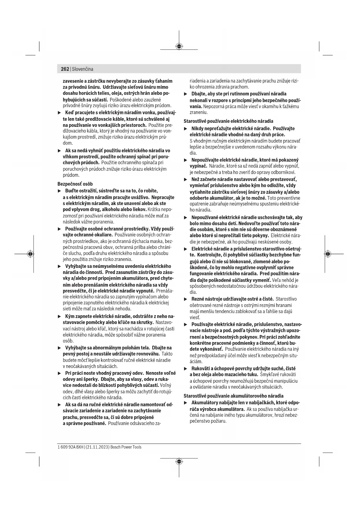 Bluetooth® Low Energy ModuleGCY42 není součástí standardní dodávky Funkce konektivity (GWS18V-15 C / GWS18V-15 SC/ GWS18V-15 PSC) Ve spojení sBluetooth® Low Energy ModuleGCY42 (není součástí standardní dodávky) jsou pro elektrické nářadí kdispozici následující funkce konektivity: – Registrace apersonalizace – Kontrola stavu, varovná hlášení – Všeobecné informace anastavení – Správa Pro informace kBluetooth® Low Energy ModuleGCY42 (není součástí standardní dodávky) si přečtěte příslušný návod kobsluze. Spojení elektrického nářadí saplikací se musí potvrdit stisknutím tlačítkem předvolby otáček (39) na uživatelském rozhraní (4). Aplikace ktomu při spojování vyzve. Údržba aservis Údržba ačištění u Před každou prací na elektronářadí (např. údržba, výměna nástrojů) apři jeho přepravě auskladnění vyjměte akumulátor. Při neúmyslném stisknutí vypínače hrozí nebezpečí poranění. u Udržujte elektronářadí avětrací otvory čisté, aby pracovalo dobře abezpečně. Příslušenství pečlivě ukládejte azacházejte sním opatrně. Zákaznická služba aporadenství ohledně použití Zákaznická služba zodpoví vaše dotazy kopravě aúdržbě vašeho výrobku atéž knáhradním dílům. Rozkladové výkresy ainformace onáhradních dílech najdete také na: 1 609 92A 8XH | (21.11.2023) Bosch Power ToolsSlovenčina | 261 www.bosch-pt.com Vpřípadě dotazů knašim výrobkům apříslušenství vám ochotně pomůže poradenský tým Bosch. Vpřípadě veškerých otázek aobjednávek náhradních dílů bezpodmínečně uveďte 10místné věcné číslo podle typového štítku výrobku. Czech Republic Robert Bosch odbytová s.r.o. Bosch Service Center PT K Vápence 1621/16 692 01 Mikulov Na www.bosch-pt.cz si si můžete objednat opravu Vašeho stroje nebo náhradní díly online. Tel.: +420 519 305700 Fax: +420 519 305705 E-Mail: servis.naradi@cz.bosch.com www.bosch-pt.cz Další adresy servisů najdete na: www.bosch-pt.com/serviceaddresses Přeprava Doporučené lithium-iontové akumulátory podléhají požadavkům zákona onebezpečných nákladech. Tyto akumulátory mohou být bez dalších podmínek přepravovány uživatelem po silnici. Při zasílání prostřednictvím třetí osoby (např.: letecká přeprava nebo spedice) je třeba brát zřetel na zvláštní požadavky na balení aoznačení. Zde musí být při přípravě zásilky nezbytně přizván expert na nebezpečné náklady. Akumulátory zasílejte pouze tehdy, pokud není poškozený kryt. Otevřené kontakty přelepte lepicí páskou aakumulátor zabalte tak, aby se vobalu nemohl pohybovat. Dodržujte také případné další národní předpisy. Likvidace Elektronářadí, akumulátory, příslušenství aobaly se musí odevzdat kekologické recyklaci. Elektronářadí aakumulátory/baterie nevyhazujte do domovního odpadu! Pouze pro zeměEU: Podle evropské směrnice 2012/19/EU oodpadních elektrických aelektronických zařízeních ajejího provedení ve vnitrostátním právu se musí již nepoužitelné elektrické nářadí apodle evropské směrnice 2006/66/ES vadné nebo opotřebované akumulátory/baterie shromažďovat odděleně aodevzdat kekologické recyklaci. Při nesprávné likvidaci mohou odpadní elektrická aelektronická zařízení kvůli případnému obsahu nebezpečných látek poškodit životní prostředí alidské zdraví. Akumulátory/baterie: Lithium-iontové: Dodržujte pokyny uvedené včásti Přeprava (viz „Přeprava“, Stránka261). Slovenčina Bezpečnostné upozornenia Všeobecné bezpečnostné upozornenia pre elektrické náradie VÝSTRAHA Prečítajte si všetky bezpečnostné upozornenia, pokyny, ilustrácie ašpecifikácie dodané stýmto elektrickým náradím. Nedodržiavanie všetkých uvedených pokynov môže mať za následok úraz elektrickým prúdom, požiar a/alebo ťažké poranenie. Tieto výstražné upozornenia abezpečnostné pokyny starostlivo uschovajte na budúce použitie. Pojem „elektrické náradie“ používaný vnasledujúcom texte sa vzťahuje na elektrické náradie napájané zo siete (sprívod- nou šnúrou) ana elektrické náradie napájané akumulátoro- vou batériou (bez prívodnej šnúry). Bezpečnosť na pracovisku u Pracovisko vždy udržiavajte čisté adobre osvetlené. Neporiadok aneosvetlené priestory pracoviska môžu mať za následok pracovné úrazy. u Nepoužívajte elektrické náradie vo výbušnom pro- stredí, napr. tam, kde sa nachádzajú horľavé kvapali- ny, plyny alebo horľavý prach. Ručné elektrické náradie vytvára iskry, ktoré by mohli zapáliť prach alebo výpary. u Nedovoľte deťom ainým nepovolaným osobám, aby sa počas používania elektrického náradia zdržiavali vblízkosti pracoviska. Pri rozptyľovaní môžete stratiť kontrolu nad náradím. Bezpečnosť – elektrina u Zástrčka prívodnej šnúry elektrického náradia musí zodpovedať použitej zásuvke. Vžiadnom prípade nija- ko nemeňte zástrčku. Suzemneným elektrickým náradím nepoužívajte ani žiadne zástrčkové adapté- ry. Neupravované zástrčky avhodné zásuvky znižujú rizi- ko úrazu elektrickým prúdom. u Vyhýbajte sa telesnému kontaktu suzemnenými povr- chovými plochami, ako sú napr. potrubia, vykurovacie telesá, sporáky achladničky. Ak je vaše telo uzemnené, hrozí zvýšené riziko úrazu elektrickým prúdom. u Nevystavujte elektrické náradie dažďu ani vlhkosti. Vniknutie vody do ručného elektrického náradia zvyšuje riziko úrazu elektrickým prúdom. u Nepoužívajte prívodnú šnúru na iné než určené účely: na nosenie ručného elektrického náradia, ani na jeho Bosch Power Tools 1 609 92A 8XH | (21.11.2023)262 | Slovenčina zavesenie azástrčku nevyberajte zo zásuvky ťahaním za prívodnú šnúru. Udržiavajte sieťovú šnúru mimo dosahu horúcich telies