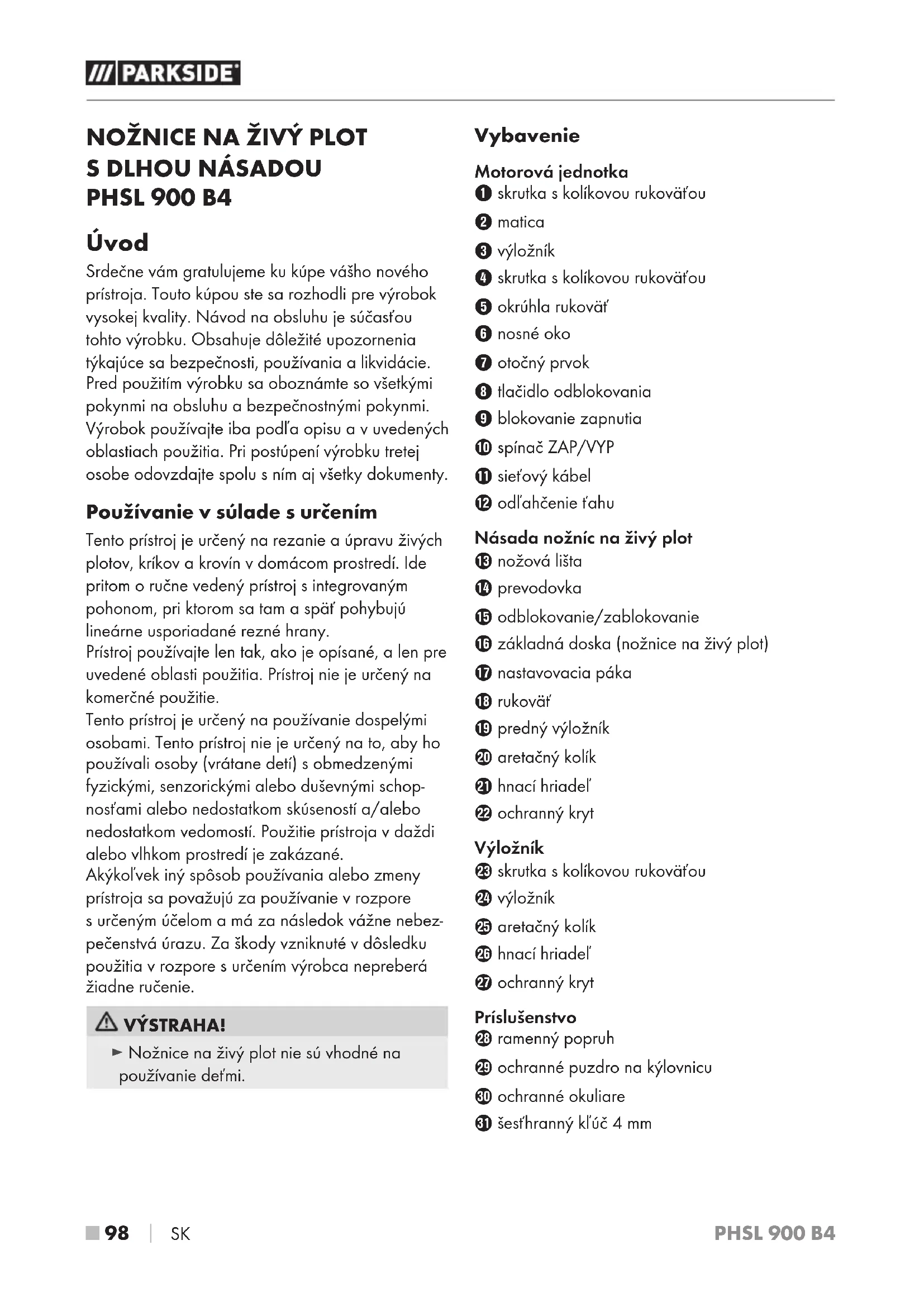 PHSL 900 B4 Úvod Srdečne vám gratulujeme kukúpe vášho nového prístroja. Touto kúpou ste sa rozhodli pre výrobok vysokej kvality. Návod na obsluhu je súčasťou tohto výrobku. Obsahuje dôležité upozornenia týkajúce sa bezpečnosti, používania a likvidácie. Pred použitím výrobku sa oboznámte sovšetkými pokynmi na obsluhu a bezpečnostnými pokynmi. Výrobok používajte iba podľa opisu a vuvedených oblastiach použitia. Pri postúpení výrobku tretej osobe odovzdajte spolu sním aj všetky dokumenty. Používanie vsúlade surčením Tento prístroj je určený na rezanie a úpravu živých plotov, kríkov a krovín v domácom prostredí. Ide pritom o ručne vedený prístroj s integrovaným pohonom, pri ktorom sa tam a späť pohybujú lineárne usporiadané rezné hrany. Prístroj používajte len tak, ako je opísané, a len pre uvedené oblasti použitia. Prístroj nie je určený na komerčné použitie. Tento prístroj je určený na používanie dospelými osobami. Tento prístroj nie je určený na to, aby ho používali osoby (vrátane detí) s obmedzenými fyzickými, senzorickými alebo duševnými schop- nosťami alebo nedostatkom skúseností a/alebo nedostatkom vedomostí. Použitie prístroja v daždi alebo vlhkom prostredí je zakázané. Akýkoľvek iný spôsob používania alebo zmeny prístroja sa považujú za používanie v rozpore surčeným účelom a má za následok vážne nebez- pečenstvá úrazu. Za škody vzniknuté v dôsledku použitia v rozpore s určením výrobca nepreberá žiadne ručenie. VÝSTRAHA! ► Nožnice na živý plot nie sú vhodné na používanie deťmi. Vybavenie Motorová jednotka 1 skrutka s kolíkovou rukoväťou 2 matica 3 výložník 4 skrutka s kolíkovou rukoväťou 5 okrúhla rukoväť 6 nosné oko 7 otočný prvok 8 tlačidlo odblokovania 9 blokovanie zapnutia 0 spínač ZAP/VYP q sieťový kábel w odľahčenie ťahu Násada nožníc na živý plot e nožová lišta r prevodovka t odblokovanie/zablokovanie z základná doska (nožnice na živý plot) u nastavovacia páka i rukoväť o predný výložník p aretačný kolík a hnací hriadeľ s ochranný kryt Výložník d skrutka s kolíkovou rukoväťou f výložník g aretačný kolík h hnací hriadeľ j ochranný kryt Príslušenstvo k ramenný popruh l ochranné puzdro na kýlovnicu y ochranné okuliare x šesťhranný kľúč 4 mmSK
