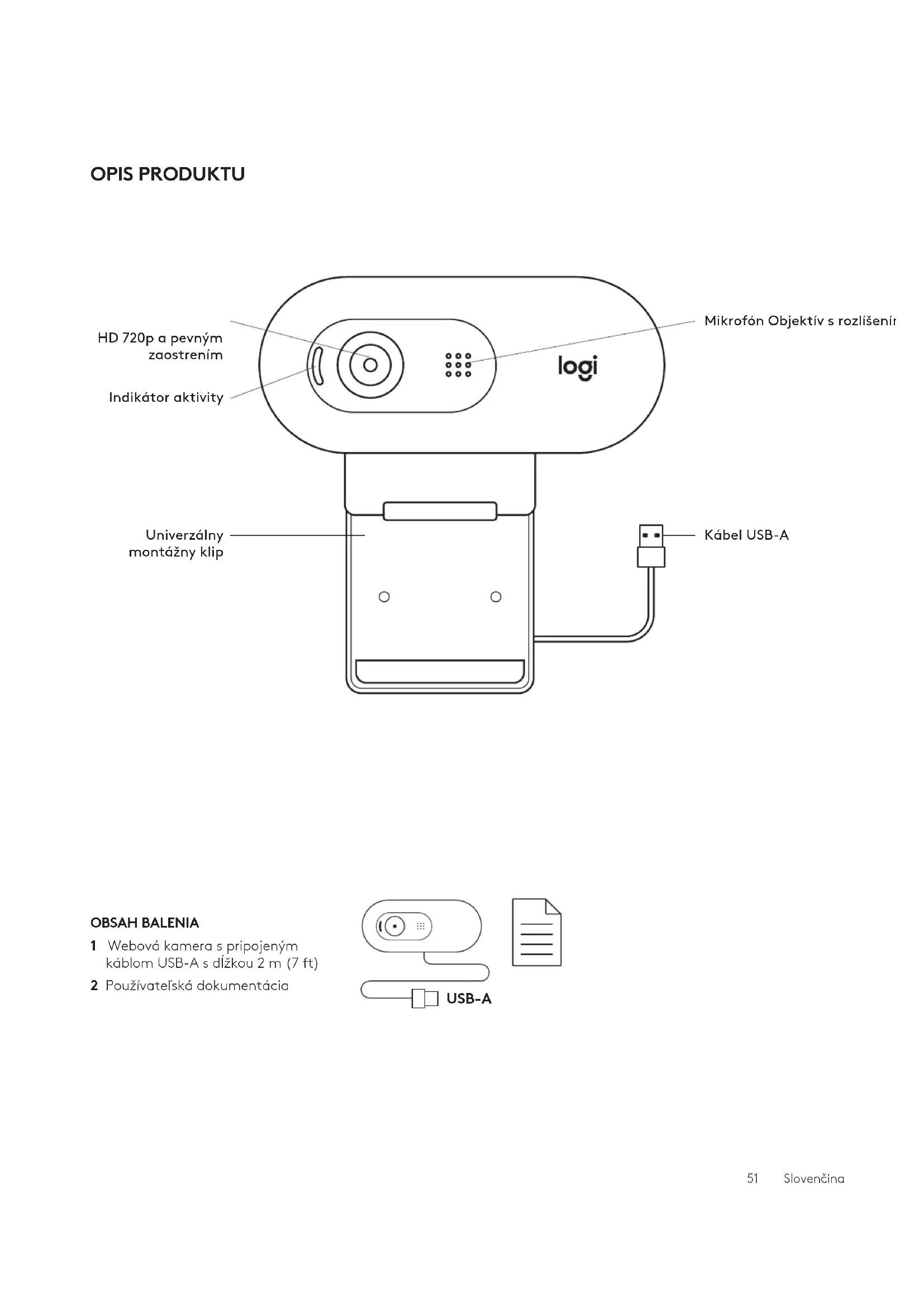 Keď je webová kamera používaná aplikáciou, indikátoraktivity sa rozsvieti. 2 Po umiestnení webovej kamery sa ubezpečte, žejespodok univerzálneho montážneho klipu vyrovnaný so zadnou časťou vášho zariadenia. 3 Ručne nastavte webovú kameru nahor/nadol tak, abyste čo najlepšie zaberali seba. 52 SlovenčinaVRÁTANE UPEVNENÉHO MONTÁŽNEHO KLIPU: Výška × šírka × hĺbka: 31,91 mm (1,26 in) x 72,91 mm (2,87 in) x 66,64 mm (2,62 in) Hmotnosť: 75 g (2,65 oz) ROZMERY www.logitech.com/support/C505e © 2020 Logitech, Logi a logo Logitech sú ochranné známky alebo registrované ochranné známky spoločnosti Logitech Europe S.A. a/alebo jej pridružených spoločností v Spojených štátoch aďalšíchkrajinách. Spoločnosť Logitech nenesie žiadnu zodpovednosť za prípadné chyby, ktorésamôžu vyskytnúť v tejto príručke. Informácie uvedené vtomto dokumente sa môžu zmeniť bez predchádzajúceho upozornenia.USB-A Мікрофон Об’єктив формату HD720p із фіксованою фокусною відстанню Світлодіодний індикатор активного