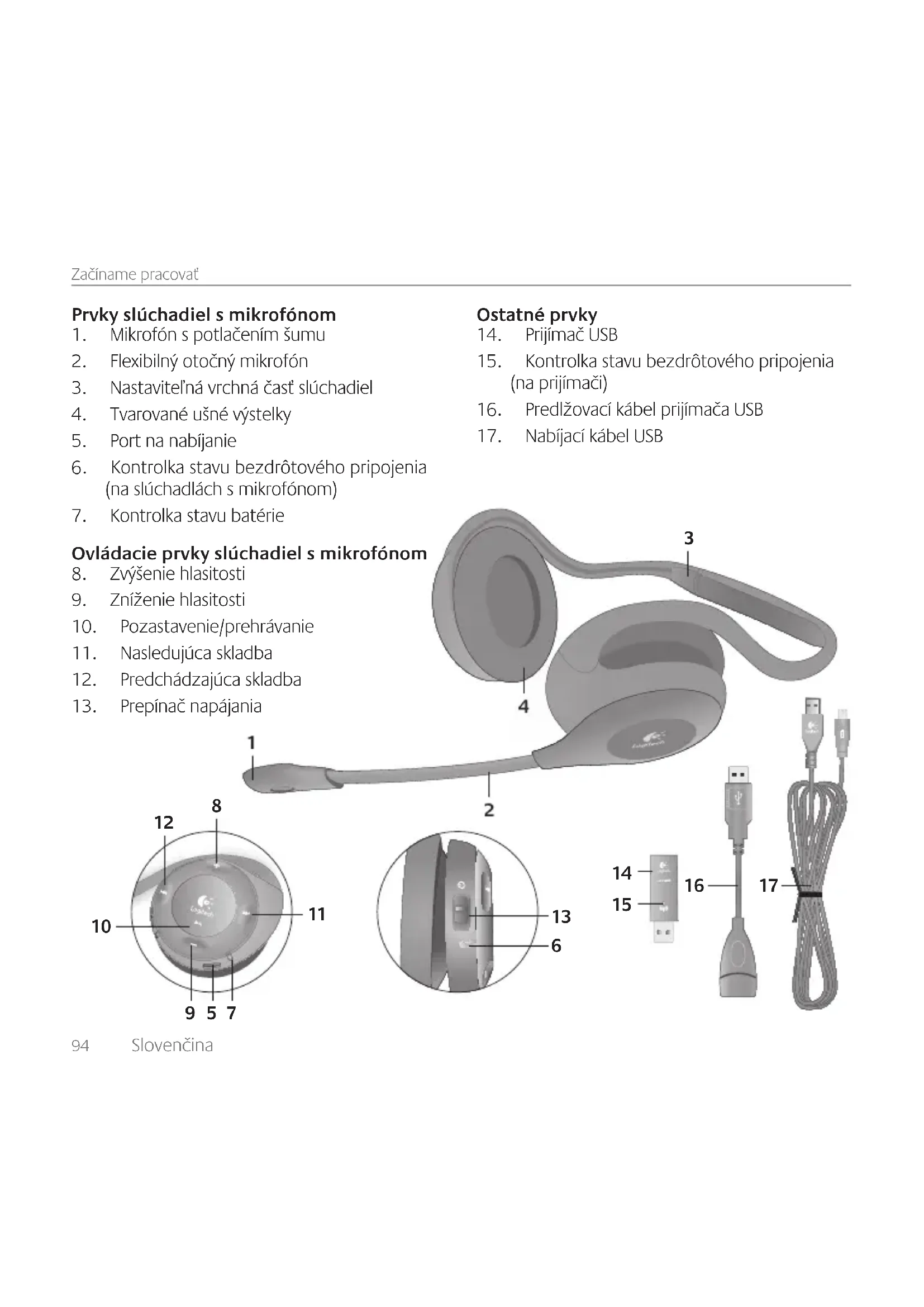 Prvkyslúchadielsmikrofónom 1. Mikrofón s potlačením šumu 2. Flexibilný otočný mikrofón 3. Nastaviteľná vrchná časť slúchadiel 4. Tvarované ušné výstelky 5. Port na nabíjanie 6. Kontrolka stavu bezdrôtového pripojenia (na slúchadlách s mikrofónom) 7. Kontrolka stavu batérie Ovládacieprvkyslúchadielsmikrofónom 8. Zvýšenie hlasitosti 9. Zníženie hlasitosti 10. Pozastavenie/prehrávanie 11. Nasledujúca skladba 12. Predchádzajúca skladba 13. Prepínač napájania Ostatnéprvky 14. Prijímač USB 15. Kontrolka stavu bezdrôtového pripojenia (na prijímači) 16. Predlžovací kábel prijímača USB 17. Nabíjací kábel USBSlovenčina 95 Logitech