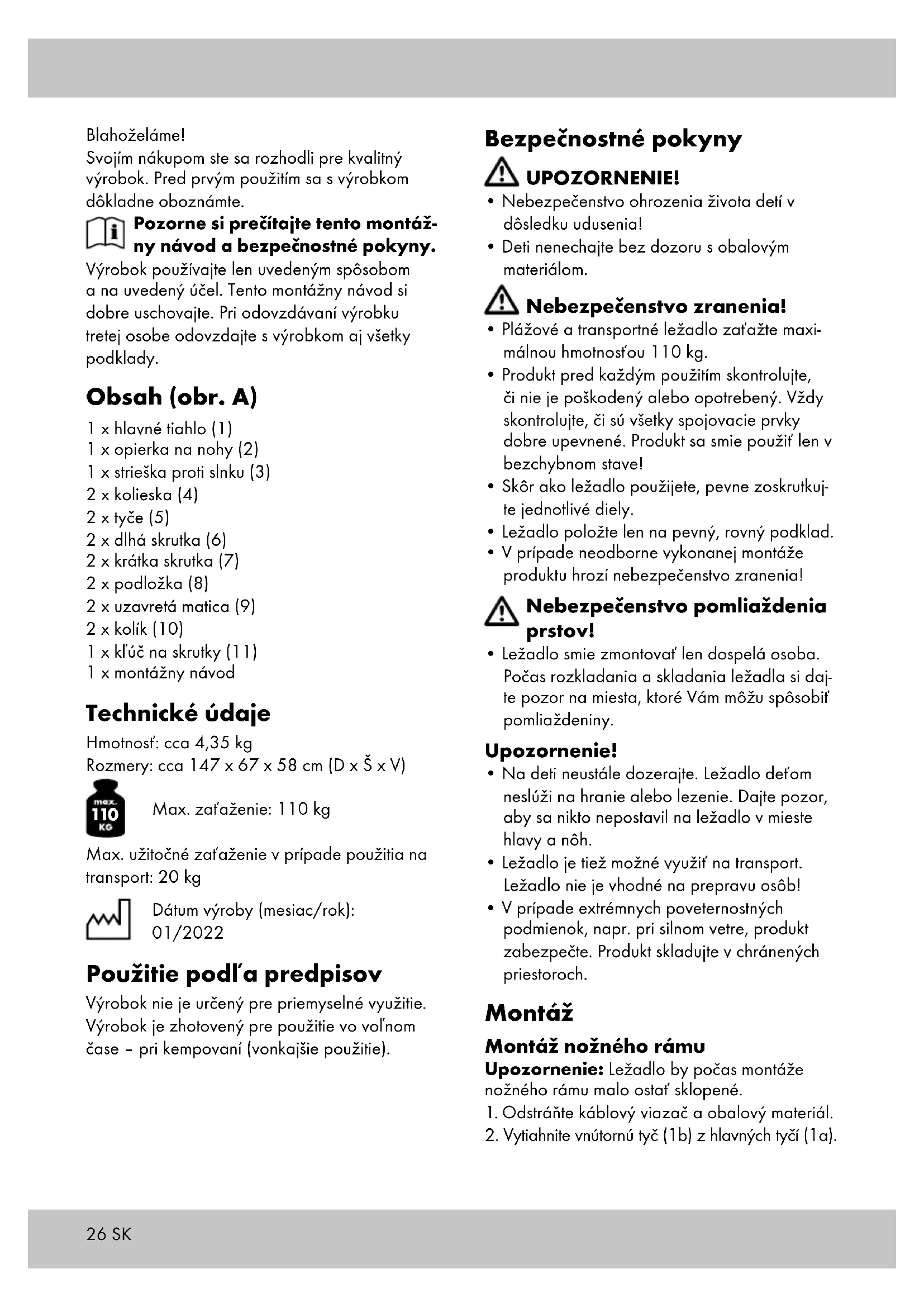 - Ležadlo smie zmontovať len dospelá osoba. Počas rozkladania a skladania ležadla si daj- te pozor na miesta, ktoré Vám môžu spôsobiť pomliaždeniny. Upozornenie!