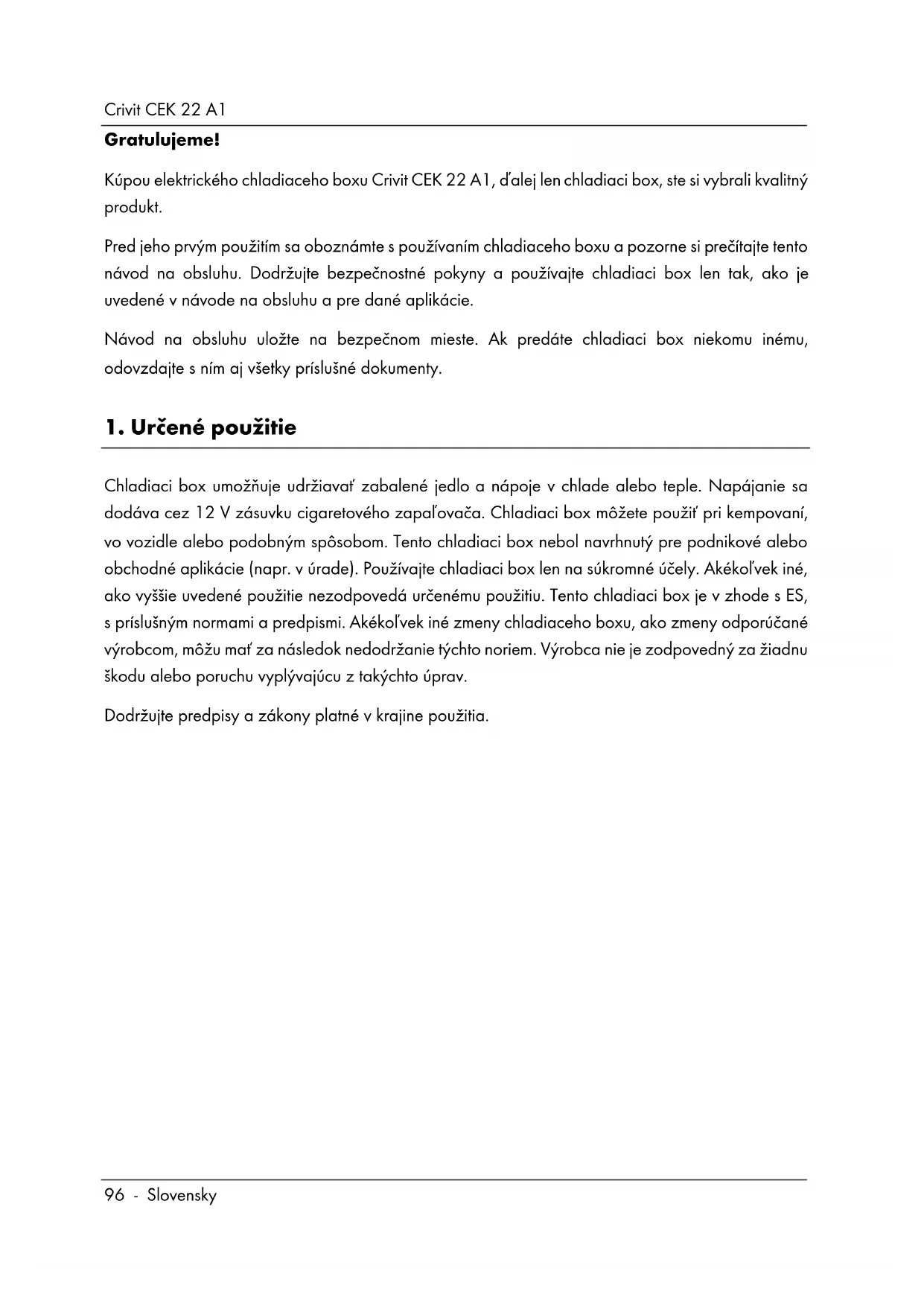 Chladiaci box umožňuje udržiavať zabalené jedlo a nápoje v chlade alebo teple. Napájanie sa dodáva cez 12 V zásuvku cigaretového zapaľovača. Chladiaci box môžete použiť pri kempovaní, vo vozidle alebo podobným spôsobom. Tento chladiaci box nebol navrhnutý pre podnikové alebo obchodné aplikácie (napr. v úrade). Používajte chladiaci box len na súkromné účely. Akékoľvek iné, ako vyššie uvedené použitie nezodpovedá určenému použitiu. Tento chladiaci box je v zhode s ES, s príslušným normami a predpismi. Akékoľvek iné zmeny chladiaceho boxu, ako zmeny odporúčané výrobcom, môžu mať za následok nedodržanie týchto noriem. Výrobca nie je zodpovedný za žiadnu škodu alebo poruchu vyplývajúcu z takýchto úprav. Dodržujte predpisy a zákony platné v krajine použitia.Crivit CEK 22 A1 Slovensky - 97