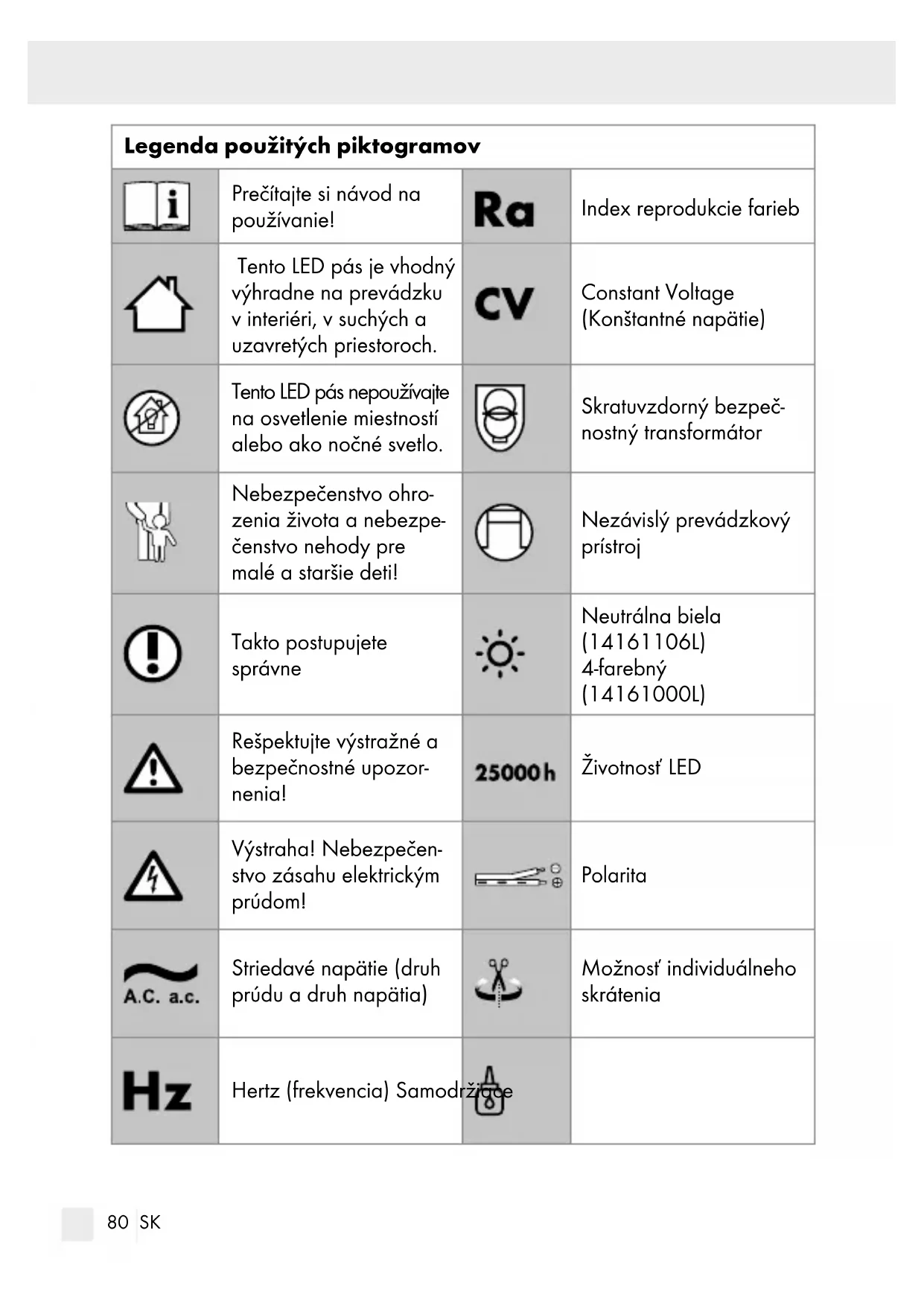Legenda použitých piktogramov .............................Strana 80 Úvod ....................................................................................................Strana 82 Používanie v súlade s určeným účelom .............................................Strana 82 Obsah dodávky ..................................................................................Strana 83 Popis častí ...........................................................................................Strana 83 Technické údaje ..................................................................................Strana 83 Bezpečnosť....................................................................................Strana 84 Bezpečnostné upozornenia ...............................................................Strana 84 Uvedenie do prevádzky ...................................................Strana 86 Skrátiť/spojiť LED-pás .........................................................................Strana 86 Montáž LED pásu .....................................................................Strana 87 Údržba a čistenie .....................................................................Strana 88 Likvidácia .......................................................................................Strana 88 Informácie ......................................................................................Strana 88 Záruka .................................................................................................Strana 88 Servis ...................................................................................................Strana 89 Konformitné vyhlásenie ......................................................................Strana 89 Výrobca ...............................................................................................Strana 8980 SK Legenda použitých piktogramov Prečítajte si návod na používanie! Index reprodukcie farieb Tento LED pás je vhodný výhradne na prevádzku v interiéri, v suchých a uzavretých priestoroch. Constant Voltage (Konštantné napätie) Tento LED pás nepoužívajte na osvetlenie miestností alebo ako nočné svetlo. Skratuvzdorný bezpeč- nostný transformátor Nebezpečenstvo ohro- zenia života a nebezpe- čenstvo nehody pre malé a staršie deti! Nezávislý prevádzkový prístroj Takto postupujete správne Neutrálna biela (14161106L) 4-farebný (14161000L) Rešpektujte výstražné a bezpečnostné upozor- nenia! Životnosť LED Výstraha! Nebezpečen- stvo zásahu elektrickým prúdom! Polarita Striedavé napätie (druh prúdu a druh napätia) Možnosť individuálneho skrátenia Hertz (frekvencia) Samodržiace81 SK Legenda použitých piktogramov Watt (efektívny výkon) Toto svietidlo nie je vhodné pre externé stmievače a elektronické spínače. Volt Ampér 14161106L: Aby nedo- šlo k ohrozeniam, smie poškodený prevádzkový prístroj tohto výrobku vymieňať výhradne výrobca, jeho servisné zastúpenie alebo porov- nateľný odborník. 14161106L: Aby nedo- šlo k ohrozeniam, smie poškodený svetelný zdroj tohto výrobku vymieňať výhradne výrobca, jeho servisné zastúpenie alebo porov- nateľný odborník. Trieda ochrany II Teplota svetla v Kelvin Jednosmerné napätie (druh prúdu a druh napätia) Obal je vyrobený zo 100% recyklovaného papiera. Ochranné nízke napätie Obal a prístroj ekologicky zlikvidujte! Miliampér Polyetylén (s nízkou hustotou) Toto svietidlo disponuje stupňom ochrany „IP20“ a je určené výlučne pre použitie v interiéroch v súkromných domácnos- tiach. Ostatné plasty ako sú polykarbonát (PC), polyamid (PA), akrylonit- rilbutadiénstyrén (ABS), polymetylmetakrylát (PMMA), polylaktid (PLA) atď.82 SK Legenda použitých piktogramov Teplota okolia Vlnitá lepenka Teplota schránky na uvedenom bode LED svetelný pás, 3 m Úvod Dôkladne si prečítajte celý tento návod na obsluhu. Tento návod patrí k tomuto výrobku a obsahuje dôležité upozornenia pre uvedenie do prevádzky a manipuláciu. Dodržiavajte vždy všetky bezpečnostné upozornenia. Pred uvedením do prevádzky prekontrolujte, či je k dispozícii správne napätie a či sú všetky diely správne namontované. V prípade otázok alebo ne- istoty ohľadom manipulácie s prístrojom sa prosím spojte s Vaším predajcom alebo servisným pracoviskom. Tento návod si starostlivo uschovajte a prípadne ho odovzdajte tretej osobe. Používanie v súlade s určeným účelom Tento LED pás je vhodný výhradne na prevádzku v interiéri, v suchých a uzavretých priestoroch. Tento prístroj je určený iba pre nasadenie v súkromných domácnostiach a nie pre komerčné využitie. Iné používanie ako vyššie popísané je neprípustné a vedie k poškodeniu tohto produktu. Okrem toho je to spojené s nebezpečenstvami ako napr. skrat, požiar, zásah elektrickým prúdom atď. Tento produkt je určený pre normálnu prevádzku. Iba pre 14161000L: V prípade tohto výrobku ide o svetelnú dekoráciu. Tento LED pás nepoužívajte na osvetlenie miestností alebo ako nočné svetlo.83 SK Obsah dodávky Bezprostredne po vybalení vždy skontrolujte úplnosť dodávky ako aj bez- chybný stav zariadenia. 1 LED svetelný pás 2 spojky 4 uzatváracie uzávery 2 držiaky káblov 1 lepiaca páska 1 návod na obsluhu Popis častí