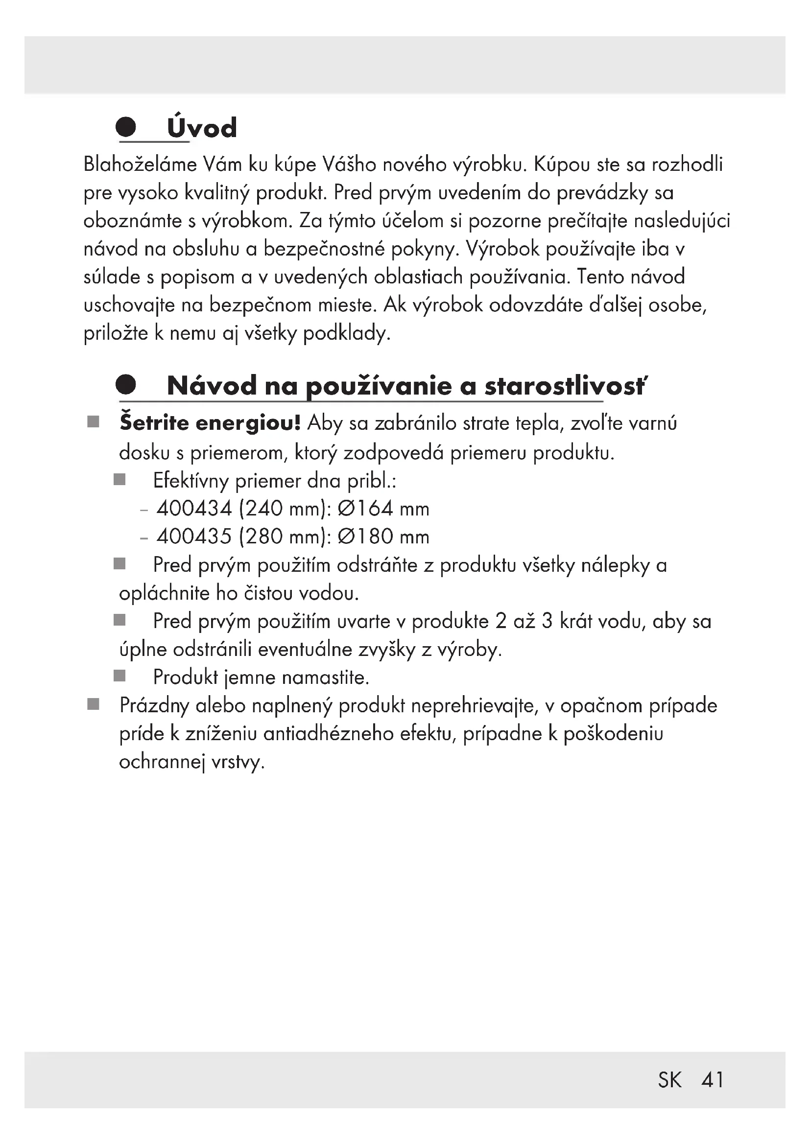 Úvod Blahoželáme Vám ku kúpe Vášho nového výrobku. Kúpou ste sa rozhodli pre vysoko kvalitný produkt. Pred prvým uvedením do prevádzky sa oboznámte s výrobkom. Za týmto účelom si pozorne prečítajte nasledujúci návod na obsluhu a bezpečnostné pokyny. Výrobok používajte iba v súlade s popisom a v uvedených oblastiach používania. Tento návod uschovajte na bezpečnom mieste. Ak výrobok odovzdáte ďalšej osobe, priložte k nemu aj všetky podklady. Návod na používanie a starostlivosť Šetrite energiou! Aby sa zabránilo strate tepla, zvoľte varnú dosku s priemerom, ktorý zodpovedá priemeru produktu. Efektívny priemer dna pribl.: – 400434(240mm): Ø164mm – 400435(280mm): Ø180mm Pred prvým použitím odstráňte z produktu všetky nálepky a opláchnite ho čistou vodou. Pred prvým použitím uvarte v produkte 2až3krát vodu, aby sa úplne odstránili eventuálne zvyšky z výroby. Produkt jemne namastite. Prázdny alebo naplnený produkt neprehrievajte, v opačnom prípade príde k zníženiu antiadhézneho efektu, prípadne k poškodeniu ochrannej vrstvy.42 SK Nebezpečenstvo prehriatia! Ak sa prehriaty kuchynský riad bez oleja dostane do kontaktu s potravinami bez tuku, môžu vzniknúť zafarbenia nepriľnavého povrchu spôsobené spálením bielkovín. Tieto sfarbené miesta sa považujú za stopy po používaní a v žiadnom prípade neovplyvňujú kvalitu vrchnej vrstvy a vhodnosť jej používania. Ohrejte jedlo na vysokom/miernom ohni a nechajte ho dôjsť na malom plameni. Pri zohrievaní tuku nenechávajte produkt bez dozoru: Prehriaty tuk sa môže vznietiť. Nikdy nehaste horiaci tuk vodou! Plameň uhaste pokrievkou alebo hrubou vlnenou prikrývkou. Používajte len kuchynské náradie z plastu alebo dreva, aby ste nepoškodili nepriľnavý povrch. Pripravované potraviny nekrájajte priamo v produkte. Do produktu nedávajte mokré kvapkajúce mäso. Tuk, ktorý by mohol odfrknúť na žeravú varnú platňu, by mohol spôsobiť požiar. Počas varenia sa môže rozohriať rukoväť. Na ochranu používajte chňapky alebo rukavice na grilovanie. Produkt je vhodný na plynové, elektrické, sklokeramické, indukčné a halogénové varné dosky.43SK Upozornenie pre indukčné dosky: Za určitých podmienok môže vznikať hluk, ktorý spôsobujú elektromagnetické vlastnosti ohrievacieho zdroja a produktu. Je to normálne a nepredstavuje to žiadnu poruchu vašej indukčnej varnej dosky alebo produktu. Produkt treba umiestniť na indukčnú varnú dosku presne do stredu. OPATRNE! Veľmi rýchle ohriatie! Produkt pri predhrievaní neprehrejte. V prípade prehriatia produktu musíte miestnosť dôkladne vyvetrať. Tento produkt spája výhody hliníkového riadu ako je nízka hmotnosť a vysoká tepelná vodivosť s výhodami varenia za pomoci indukcie. Aby to bolo možné, boli do hliníkového dna pridané magnetické oceľové prvky. Dno nie je preto celé magnetické, takže na indukčných varných doskách, ktoré sú o dosť väčšie ako je priemer dna, sa môže stať, že indukčné cievky nebudú reagovať. To nie je žiadna chyba kvality a nepredstavuje žiadne zníženie funkčnosti. Produkt bude fungovať správne, len ak ho vždy umiestnite na varnú dosku, ktorá zodpovedá efektívnemu priemeru dna uvedenému v tomto návode. Vysoké teploty môžu spôsobiť sfarbenie vonkajšej strany produktu. To nie je žiadna materiálová chyba a v žiadnom prípade neovplyvňuje kvalitu alebo funkciu produktu. Horúci produkt nikdy nechlaďte pod studenou tečúcou vodou. Tým by sa mohla spodná strana produktu poškodiť alebo z produktu odpadnúť.44 SK Produkt je vhodný na udržiavanie teploty jedál v rúre na pečenie (max.160°Cpočas1hodiny). Tento produkt je vhodný do umývačky riadu. Na ručné umývanie použite horúcu vodu a bežný prostriedok na umývanie riadu. Vyhnite sa používaniu ostrých a špicatých predmetov alebo kefiek, aby ste nepoškodili materiál. Pri čistení nepoužívajte žiadne abrazívne prostriedky. Časté čistenie ostrými čistiacimi prostriedkami môže spôsobiť poškodenie a/alebo sfarbenie produktu. Čistenie v umývačke riadu môže viesť k sfarbeniu hliníkových častí. OPATRNE! ŠKRABANCE! Zabráňte šúchaniu produktu po sklo-keramickej varnej doske! Pred tým, ako začnete s varením, odporúčame vám, aby ste utreli plochu varnej dosky a dno produktu čistou handrou, ktorá nepúšťa vlákna (napr. z mikrovlákna). Takto zabránite vzniku škrabancov. Vhodné pre potraviny: Tento produkt nemá žiadny vplyv na chuť a vôňu pripravovaných jedál. Produkt v žiadnom prípade nepoužívajte, ak je rukoväť uvoľnená. V takom prípade skrutku rukoväte utiahnite. Likvidácia Obal pozostáva z ekologických materiálov, ktoré môžete odovzdať na miestnych recyklačných zberných miestach. O možnostiach likvidácie opotrebovaného výrobku sa môžete informovať na Vašej obecnej alebo mestskej správe.45SK Záruka Tento výrobok bol dôkladne vyrobený podľa prísnych akostných smerníc a pred dodaním svedomito testovaný. V prípade nedostatkov tohto výrobku Vám prináležia zákonné práva voči predajcovi produktu. Tieto zákonné práva nie sú našou nižšie uvedenou zárukou obmedzené. Na tento produkt poskytujeme 3-ročnú záruku od dátumu nákupu. Záručná doba začína plynúť dátumom kúpy. Starostlivo si prosím uschovajte originálny pokladničný lístok. Tento doklad je potrebný ako dôkaz o kúpe. Ak sa v rámci 3 rokov od dátumu nákupu tohto výrobku vyskytne chyba materiálu alebo výrobná chyba, výrobok Vám bezplatne opravíme alebo vymeníme – podľa nášho výberu. Táto záruka zaniká, ak bol produkt poškodený, neodborne používaný alebo neodborne udržiavaný. Poskytnutie záruky sa vzťahuje na chyby materiálu a výrobné chyby. Táto záruka sa nevzťahuje na časti produktu, ktoré sú vystavené norm