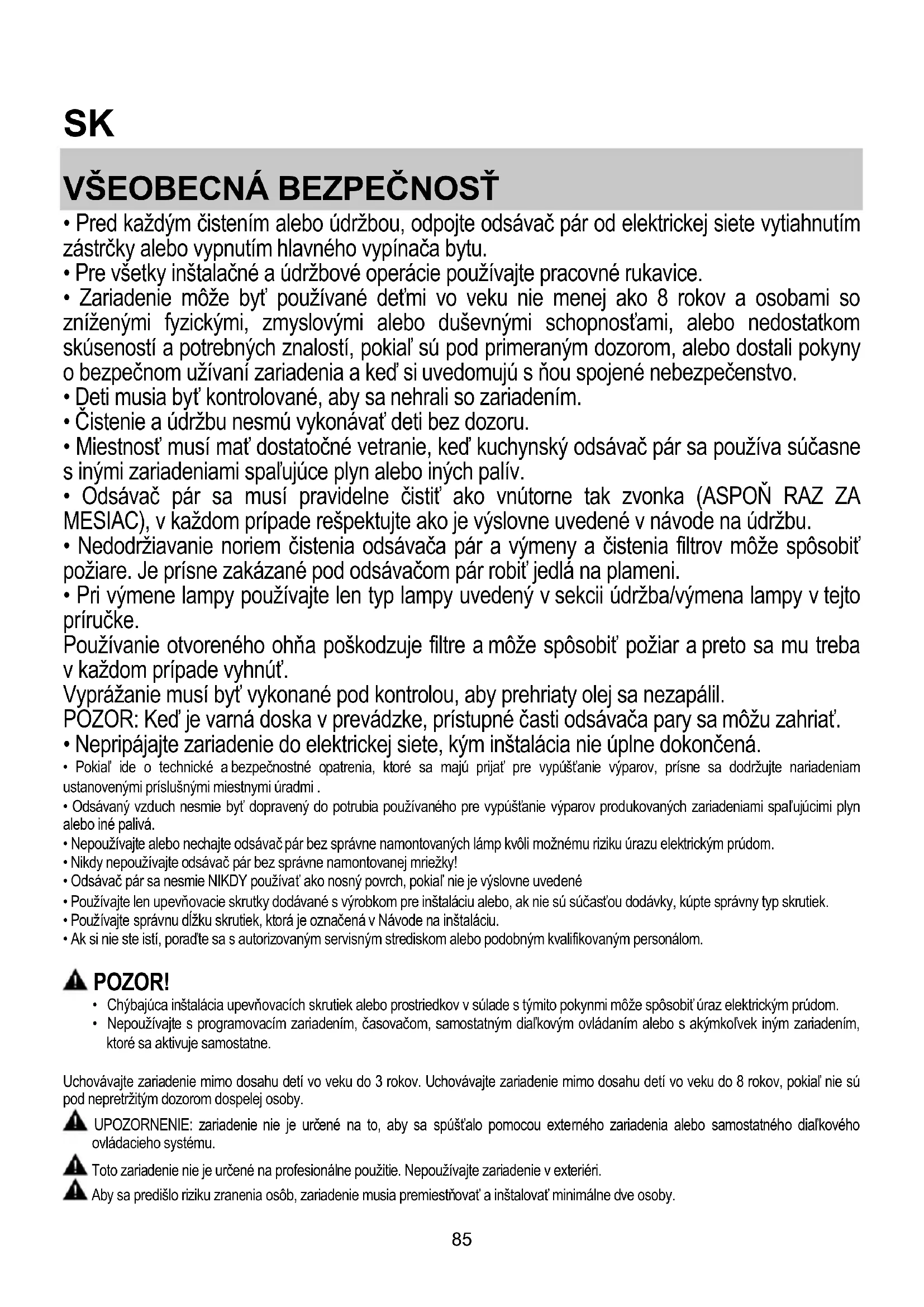 - Pri výmene lampy používajte len typ lampy uvedený v sekcii údržba/výmena lampy v tejto príručke. Používanie otvoreného ohňa poškodzuje filtre a môže spôsobiť požiar a preto sa mu treba v každom prípade vyhnúť. Vyprážanie musí byť vykonané pod kontrolou, aby prehriaty olej sa nezapálil. POZOR: Keď je varná doska v prevádzke, prístupné časti odsávača pary sa môžu zahriať.