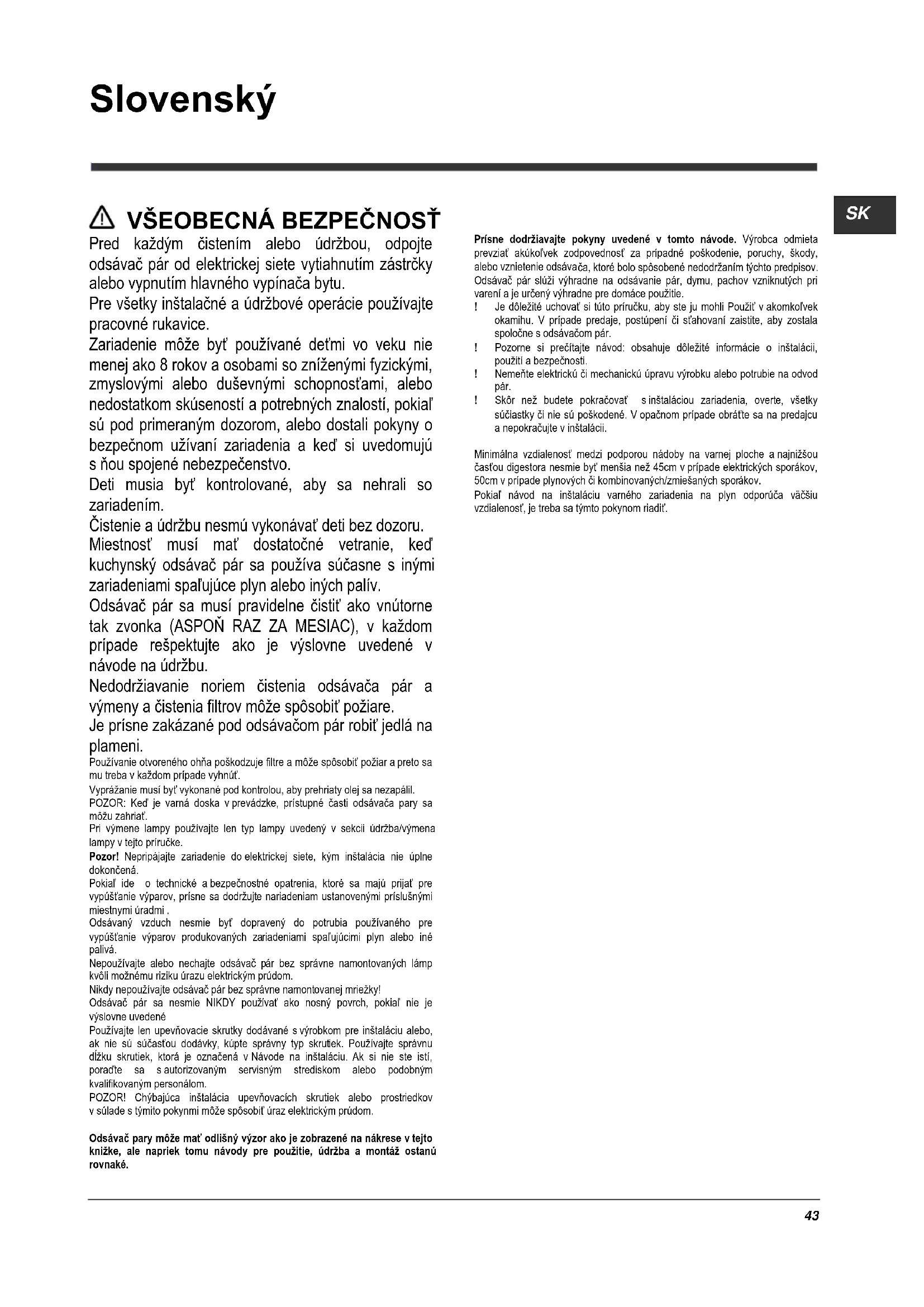 Pred každým čistením alebo údržbou, odpojte odsávač pár od elektrickej siete vytiahnutím zástrčky alebo vypnutím hlavného vypínača bytu. Pre všetky inštalačné a údržbové operácie používajte pracovné rukavice. Zariadenie môže byť používané deťmi vo veku nie menej ako 8 rokov a osobami so zníženými fyzickými, zmyslovými alebo duševnými schopnosťami, alebo nedostatkom skúseností a potrebných znalostí, pokiaľ sú pod primeraným dozorom, alebo dostali pokyny o bezpečnom užívaní zariadenia a keď si uvedomujú s ňou spojené nebezpečenstvo. Deti musia byť kontrolované, aby sa nehrali so zariadením. Čistenie a údržbu nesmú vykonávať deti bez dozoru. Miestnosť musí mať dostatočné vetranie, keď kuchynský odsávač pár sa používa súčasne s inými zariadeniami spaľujúce plyn alebo iných palív. Odsávač pár sa musí pravidelne čistiť ako vnútorne tak zvonka (ASPOŇ RAZ ZA MESIAC), v každom prípade rešpektujte ako je výslovne uvedené v návode na údržbu. Nedodržiavanie noriem čistenia odsávača pár a výmeny a čistenia filtrov môže spôsobiť požiare. Je prísne zakázané pod odsávačom pár robiť jedlá na plameni. Používanie otvoreného ohňa poškodzuje filtre a môže spôsobiť požiar a preto sa mu treba v každom prípade vyhnúť. Vyprážanie musí byť vykonané pod kontrolou, aby prehriaty olej sa nezapálil. POZOR: Keď je varná doska v prevádzke, prístupné časti odsávača pary sa môžu zahriať. Pri výmene lampy používajte len typ lampy uvedený v sekcii údržba/výmena lampy v tejto príručke. Pozor! Nepripájajte zariadenie do elektrickej siete, kým inštalácia nie úplne dokončená. Pokiaľ ide o technické a bezpečnostné opatrenia, ktoré sa majú prijať pre vypúšťanie výparov, prísne sa dodržujte nariadeniam ustanovenými príslušnými miestnymi úradmi . Odsávaný vzduch nesmie byť dopravený do potrubia používaného pre vypúšťanie výparov produkovaných zariadeniami spaľujúcimi plyn alebo iné palivá. Nepoužívajte alebo nechajte odsávač pár bez správne namontovaných lámp kvôli možnému riziku úrazu elektrickým prúdom. Nikdy nepoužívajte odsávač pár bez správne namontovanej mriežky! Odsávač pár sa nesmie NIKDY používať ako nosný povrch, pokiaľ nie je výslovne uvedené Používajte len upevňovacie skrutky dodávané s výrobkom pre inštaláciu alebo, ak nie sú súčasťou dodávky, kúpte správny typ skrutiek. Používajte správnu dĺžku skrutiek, ktorá je označená v Návode na inštaláciu. Ak si nie ste istí, poraďte sa s autorizovaným servisným strediskom alebo podobným kvalifikovaným personálom. POZOR! Chýbajúca inštalácia upevňovacích skrutiek alebo prostriedkov v súlade s týmito pokynmi môže spôsobiť úraz elektrickým prúdom. Odsávač pary môže mať odlišný výzor ako je zobrazené na nákrese v tejto knižke, ale napriek tomu návody pre použitie, údržba a montáž ostanú rovnaké. Prísne dodržiavajte pokyny uvedené v tomto návode. Výrobca odmieta prevziať akúkoľvek zodpovednosť za prípadné poškodenie, poruchy, škody, alebo vznietenie odsáva ča, ktoré bolo spôsobené nedodržaním týchto predpisov. Odsávač pár slúži výhradne na odsávanie pár, dymu, pachov vzniknutých pri varení a je určený výhradne pre domáce použitie. ! Je dôležité uchovať si túto príručku, aby ste ju mohli Použiť v akomkoľvek okamihu. V prípade predaje, postúpení či sťahovaní zaistite, aby zostala spoločne s odsávačom pár. ! Pozorne si prečítajte návod: obsahuje dôležité informácie o inštalácii, použití a bezpečnosti. ! Nemeňte elektrickú či mechanickú úpravu výrobku alebo potrubie na odvod pár. ! Skôr než budete pokračovať s inštaláciou zariadenia, overte, všetky súčiastky či nie sú poškodené. V opačnom prípade obráťte sa na predajcu a nepokračujte v inštalácii. Minimálna vzdialenosť medzi podporou nádoby na varnej ploche a najnižšou časťou digestora nesmie byť menšia než 45cm v prípade elektrických sporákov, 50cm v prípade plynových či kombinovaných/zmiešaných sporákov. Pokiaľ návod na inštaláciu varného zariadenia na plyn odporúča väčšiu vzdialenosť, je treba sa týmto pokynom riadiť.44 ELEKTRICKÉ PRIPOJENIE Sieťové napätie musí zodpovedať napätiu uvedenému na štítku s charakteristikami umiestnenom vo vnútri odsávača. Pokiaľ je odsávač vybavený prípojkou/vidlicou, stačí ju zapojiť do zásuvky zodpovedajúcej aktuálnym normám, ktorá sa nachádza v ľahko dosiahnuteľnom priestore aj po prevedenej montáži. Pokiaľ odsávač nie je vybavený prípojkami/vidlicou (priame pripojenie k sieti) alebo sa zásuvka nenachádza v ľahko dosiahnuteľnom priestore aj po prevedení montáže, je nutné použiť dvojpólový vypínač zodpovedajúci normám, ktorý zaručí úplné odpojenie od siete v podmienkach kategórie prepätí III, v súlade s pravidlami inštalácie. Upozornenie! Skôr než opäť napojíte obvod digestora na sieťové napájanie a overíte správne fungovanie, skontrolujte si vždy, že sieťový kábel bol správne namontovaný. Výmena napájacieho kábla Digestor je vybavený špeciálnym napájacím káblom; v prípade poškodenia káblu si ho vyžiadajte u servisnej služby.