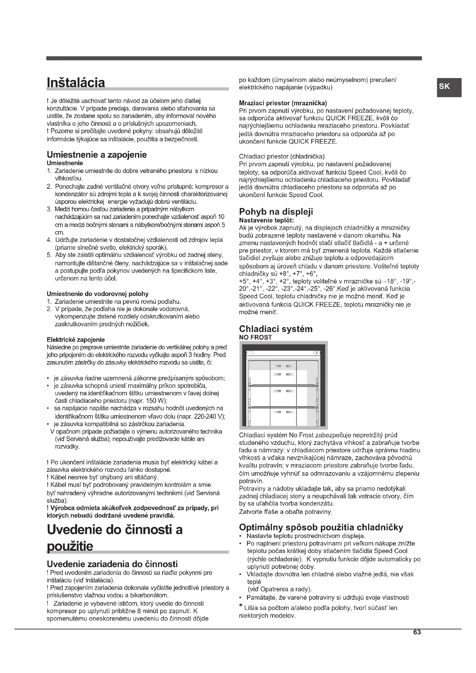 - je zásuvka kompatibilná so zástrčkou zariadenia. V opačnom prípade požiadajte o výmenu autorizovaného technika (viď Servisná služba); nepoužívajte predlžovacie káble ani rozvodky. ! Po ukončení inštalácie zariadenia musia byť elektrický kábel a zásuvka elektrického rozvodu ľahko dostupné. ! Kábel nesmie byť ohýbaný ani stláčaný. ! Kábel musí byť podrobovaný pravidelným kontrolám a smie byť nahradený výhradne autorizovanými technikmi (viď Servisná služba). ! Výrobca odmieta akúkoľvek zodpovednosť za prípady, pri ktorých nebudú dodržané uvedené pravidlá. Uvedenie do činnosti a použitie Uvedenie zariadenia do činnosti ! Pred uvedením zariadenia do činnosti sa riaďte pokynmi pre inštaláciu (viď Inštalácia). ! Pred zapojením zariadenia dokonale vyčistite jednotlivé priestory a príslušenstvo vlažnou vodou a bikarbonátom. ! Zariadenie je vybavené ističom, ktorý uvedie do činnosti kompresor po uplynutí približne 8 minút po zapnutí. K spomenutému oneskorenému uvedeniu do činnosti dôjde po každom (úmyselnom alebo neúmyselnom) prerušení elektrického napájanie (výpadku) Mraziaci priestor (mraznička) Pri prvom zapnutí výrobku, po nastavení požadovanej teploty, sa odporúča aktivovať funkciu QUICK FREEZE, kvôli čo najrýchlejšiemu ochladeniu mraziaceho priestoru. Povkladať jedlá dovnútra mraziaceho priestoru sa odporúča až po ukončení funkcie QUICK FREEZE. Chladiaci priestor (chladnička) Pri prvom zapnutí výrobku, po nastavení požadovanej teploty, sa odporúča aktivovať funkciu Speed Cool, kvôli čo najrýchlejšiemu ochladeniu chladiaceho priestoru. Povkladať jedlá dovnútra chladiaceho priestoru sa odporúča až po ukončení funkcie Speed Cool. Pohyb na displeji Nastavenie teplôt: Ak je výrobok zapnutý, na displejoch chladničky a mrazničky budú zobrazené teploty nastavené v danom okamihu. Na zmenu nastavených hodnôt stačí stlačiť tlačidlá - a + určené pre priestor, v ktorom má byť zmenená teplota. Každé stlačenie tlačidiel zvyšuje alebo znižuje teplotu a odpovedajúcim spôsobom aj úroveň chladu v danom priestore. Voliteľné teploty chladničky sú +8°, +7°, +6°, +5°, +4°, +3°, +2°, teploty voliteľné v mrazničke sú –18°, -19°,- 20°,-21°, -22°, -23°,-24°,-25°, -26°.Keď je aktivovaná funkcia Speed Cool, teplotu chladničky nie je možné meniť. Keď je aktivovaná funkcia QUICK FREEZE, teplotu mrazničky nie je možné meniť. Chladiaci systém NO FROST Chladiaci systém No Frost zabezpečuje nepretržitý prúd studeného vzduchu, ktorý zachytáva vlhkosť a zabraňuje tvorbe ľadu a námrazy: v chladiacom priestore udržuje správnu hladinu vlhkosti a vďaka nevznikajúcej námraze, zachováva pôvodnú kvalitu potravín; v mraziacom priestore zabraňuje tvorbe ľadu, čím umožňuje vyhnúť sa odmrazovaniu a vzájomnému zlepeniu potravín. Potraviny a nádoby ukladajte tak, aby sa priamo nedotýkali zadnej chladiacej steny a neupchávali tak vetracie otvory, čím by sa uľahčila tvorba kondenzátu. Zatvorte fľaše a obaľte potraviny. Optimálny spôsob použitia chladničky