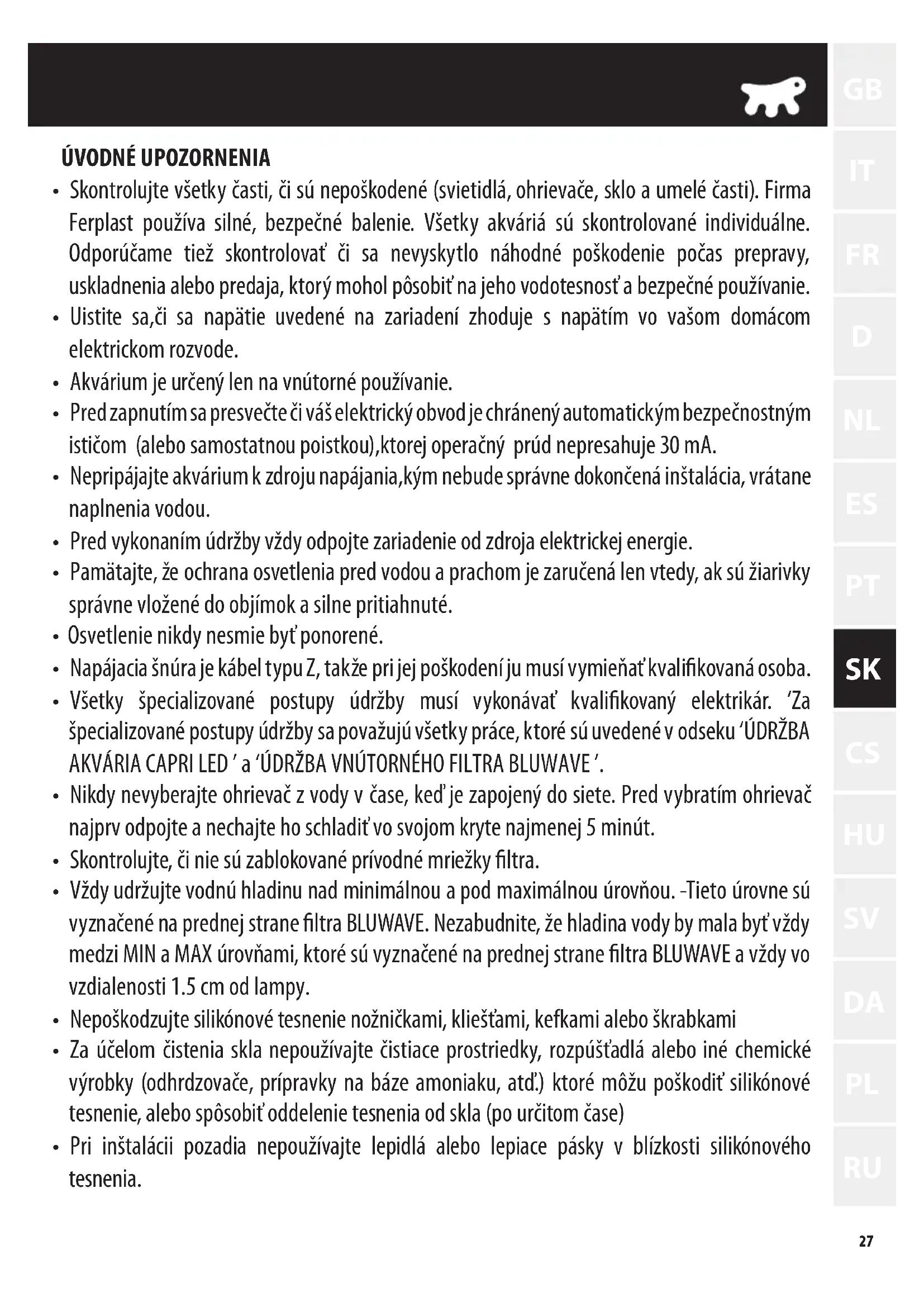 - Vsetky špecializované postupy udržby musí vykonávat kvalifikovany elektrikár. Za špecializované postupy udržby sa považuju vsetky prace, ktoré su uvedenév odseku 'UDRŽBA AKVÁRIA CAPRI LED 'a 'UDRŽBA VNUTORNEHO FILTRA BLUWAVE'.