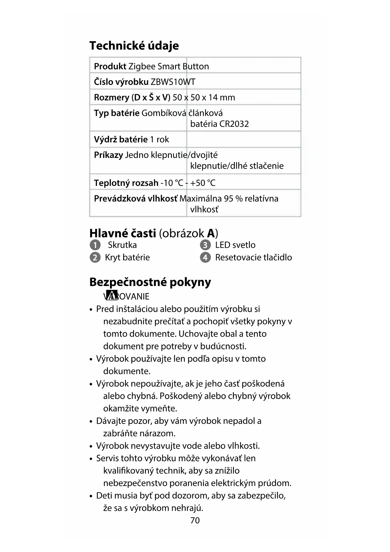 Rýchly návod Zigbee Smart Button ZBWS10WT Určené použitie Nedis ZBWS10WT je bezdrôtové inteligentné tlačidlo s napájaním z batérie. Pomocou tohto tlačidla môžete ovládať pripojené výrobky zo skupiny výrobkov Nedis SmartLife. Výrobok je možné pripojiť bezdrôtovo k aplikácii Nedis SmartLife prostredníctvom brány Zigbee. Tlačidlo má tri rôzne príkazy: jedno klepnutie, dvojité klepnutie a dlhé stlačenie. Keď ste pripojili výrobok k aplikácii, môžete pripojiť tieto tri príkazy nástenného spínača Zigbee Wireless Wall Switch k svojim ďalším výrobkom Nedis SmartLife a ovládať ich. Výrobok je určený len na použitie vo vnútri. Výrobok nie je určený na profesionálne použitie. Každá zmena výrobku môže mať následky na bezpečnosť, záruku a správne fungovanie.70 Technické údaje Produkt Zigbee Smart Button Číslo výrobku ZBWS10WT Rozmery (D x Š x V) 50 x 50 x 14 mm Typ batérie Gombíková článková batéria CR2032 Výdrž batérie 1 rok Príkazy Jedno klepnutie/dvojité klepnutie/dlhé stlačenie Teplotný rozsah -10 °C - +50 °C Prevádzková vlhkosť Maximálna 95 % relatívna vlhkosť Hlavné časti (obrázok A) 1 Skrutka 2 Kryt batérie 3 LED svetlo 4 Resetovacie tlačidlo Bezpečnostné pokyny