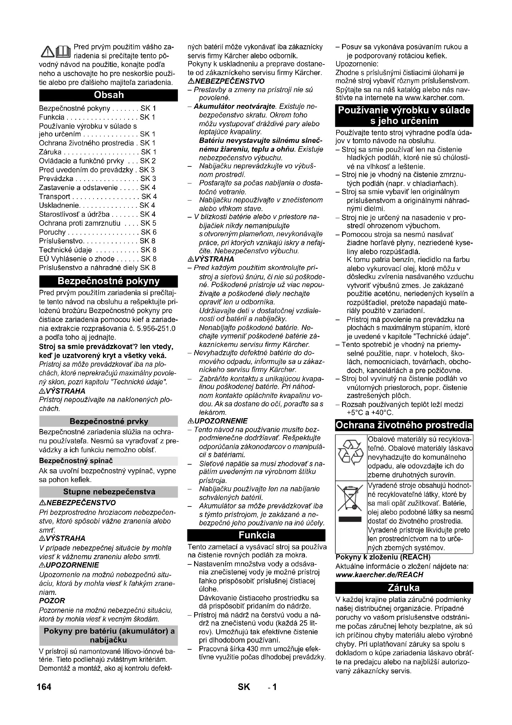 Prístroj má povolenie na prevádzku na plochách s maximálnym stúpaním, ktoré je uvedené v kapitole "Technické údaje". – Tento spotrebič je vhodný na priemy- selné použitie, napr. v hoteloch, ško- lách, nemocniciach, továrňach, obcho- doch, kanceláriách a pre požičovne. – Stroj bol vyvinutý na čistenie podláh vo vnútorných priestoroch, popr. čistenie zastrešených plôch. – Rozsah používaných teplôt leží medzi +5°C a +40°C. Pokyny k zloženiu (REACH) Aktuálne informácie o zložení nájdete na: www.kaercher.de/REACH V každej krajine platia záručné podmienky našej distribučnej organizácie. Prípadné poruchy vo vašom príslušenstve odstráni- me počas záručnej lehoty bezplatne, ak sú ich príčinou chyby materiálu alebo výrobné chyby. Pri uplatňovaní záruky sa spolu s dokladom o kúpe zariadenia láskavo obráť- te na predajcu alebo na najbližší autorizo- vaný zákaznícky servis. Obsah Bezpečnostné pokyny . . . . . . . SK 1 Funkcia . . . . . . . . . . . . . . . . . . SK 1 Používanie výrobku v súlade s jeho určením . . . . . . . . . . . . . . SK 1 Ochrana životného prostredia . SK 1 Záruka . . . . . . . . . . . . . . . . . . . SK 1 Ovládacie a funkčné prvky . . . SK 2 Pred uvedením do prevádzky . SK 3 Prevádzka . . . . . . . . . . . . . . . . SK 3 Zastavenie a odstavenie . . . . . SK 4 Transport . . . . . . . . . . . . . . . . . SK 4 Uskladnenie. . . . . . . . . . . . . . . SK 4 Starostlivosť a údržba . . . . . . . SK 4 Ochrana proti zamrznutiu . . . . SK 5 Poruchy . . . . . . . . . . . . . . . . . . SK 6 Príslušenstvo. . . . . . . . . . . . . . SK 8 Technické údaje . . . . . . . . . . . SK 8 EÚ Vyhlásenie o zhode . . . . . . SK 8 Príslušenstvo a náhradné diely SK 8 Bezpečnostné pokyny Bezpečnostné prvky Bezpečnostný spínač Stupne nebezpečenstva Pokyny pre batériu (akumulátor) a nabíjačku Funkcia Používanie výrobku v súlade s jeho určením Ochrana životného prostredia Obalové materiály sú recyklova- teľné. Obalové materiály láskavo nevyhadzujte do komunálneho odpadu, ale odovzdajte ich do zberne druhotných surovín. Vyradené stroje obsahujú hodnot- né recyklovateľné látky, ktoré by sa mali opäť zužitkovať. Batérie, olej alebo podobné látky sa nesmú dostať do životného prostredia. Vyradené prístroje likvidujte preto len prostredníctvom na to urče- ných zberných systémov. Záruka 164 SK- 2 1 Filtračné sito 2 Bezpečnostné spínače 3 Batéria * 4 Vypúšťacia hadica na znečistenú vodu s dávkovacím zariadením 5 Upevňovacia lišta pre Homebase 6Plavák 7 Nádrž na čistú vodu 8 Uzáver nádrže na čistú vodu 9 Čistiaca hlava 10 Kefka na kotúče 11 Plniaci otvor nádrže na čistú vodu 12 Rukoväť na výmenu kefy 13 Nádrž znečistenej vody 14 Zobrazenie stavu naplnenia čistou vo- dou 15 Otočná rukoväť na sklonenie nasáva- cieho nosníka 16 Výškovo nastaviteľný nasávací nadsta- vec * 17 Krídlové matice na upevnenie sacej nadstavby 18 Sací nadstavec * 19 Vysávacia hadica 20 Regulačná hlava množstva vody 21 Zástrčka batérie 22 Páka spustenia sacej nadstavby 23 Ovládací panel 24 Posuvná rukoväť 25 Odstavná plocha pre čistiacu súpravu „Homebase Box“ 26 Kryt nádrže znečistenej vody
