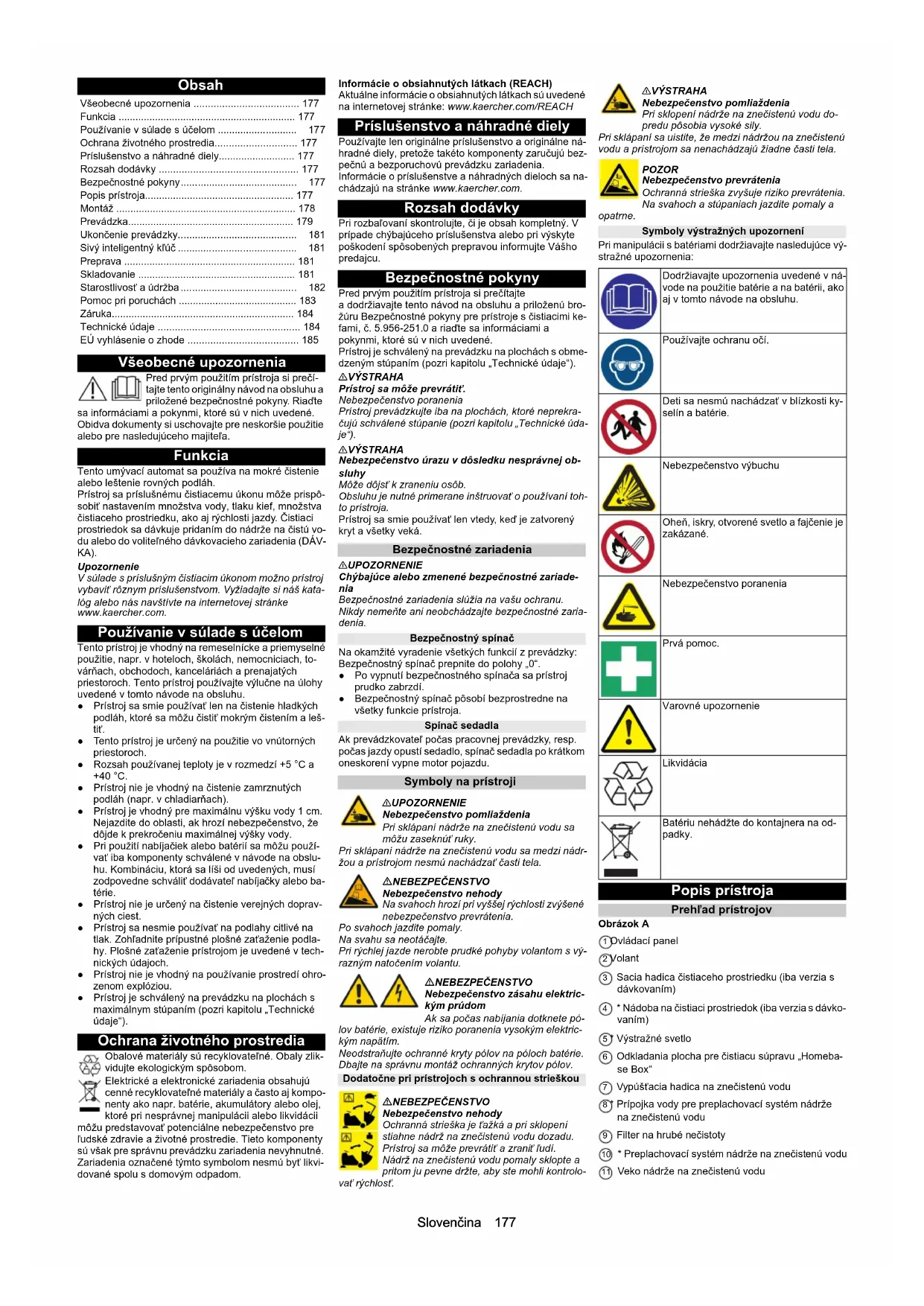 • - - 2943 (30) 2943 (30) - R 75 D 75 R 85 D 90 D 110Slovenčina 177 Obsah Všeobecné upozornenia Pred prvým použitím prístroja si prečí- tajte tento originálny návod na obsluhu a priložené bezpečnostné pokyny. Riaďte sa informáciami a pokynmi, ktoré sú v nich uvedené. Obidva dokumenty si uschovajte pre neskoršie použitie alebo pre nasledujúceho majiteľa. Funkcia Tento umývací automat sa používa na mokré čistenie alebo leštenie rovných podláh. Prístroj sa príslušnému čistiacemu úkonu môže prispô- sobiť nastavením množstva vody, tlaku kief, množstva čistiaceho prostriedku, ako aj rýchlosti jazdy. Čistiaci prostriedok sa dávkuje pridaním do nádrže na čistú vo- du alebo do voliteľného dávkovacieho zariadenia (DÁV- KA). Upozornenie V súlade s príslušným čistiacim úkonom možno prístroj vybaviť rôznym príslušenstvom. Vyžiadajte si náš kata- lóg alebo nás navštívte na internetovej stránke www.kaercher.com. Používanie v súlade s účelom Tento prístroj je vhodný na remeselnícke a priemyselné použitie, napr. v hoteloch, školách, nemocniciach, to- várňach, obchodoch, kanceláriách a prenajatých priestoroch. Tento prístroj používajte výlučne na úlohy uvedené v tomto návode na obsluhu. ● Prístroj sa smie používať len na čistenie hladkých podláh, ktoré sa môžu čistiť mokrým čistením a leš- tiť. ● Tento prístroj je určený na použitie vo vnútorných priestoroch. ● Rozsah používanej teploty je v rozmedzí +5 °C a +40 °C. ● Prístroj nie je vhodný na čistenie zamrznutých podláh (napr. v chladiarňach). ● Prístroj je vhodný pre maximálnu výšku vody 1 cm. Nejazdite do oblasti, ak hrozí nebezpečenstvo, že dôjde k prekročeniu maximálnej výšky vody. ● Pri použití nabíjačiek alebo batérií sa môžu použí- vať iba komponenty schválené v návode na obslu- hu. Kombináciu, ktorá sa líši od uvedených, musí zodpovedne schváliť dodávateľ nabíjačky alebo ba- térie. ● Prístroj nie je určený na čistenie verejných doprav- ných ciest. ● Prístroj sa nesmie používať na podlahy citlivé na tlak. Zohľadnite prípustné plošné zaťaženie podla- hy. Plošné zaťaženie prístrojom je uvedené v tech- nických údajoch. ● Prístroj nie je vhodný na používanie prostredí ohro- zenom explóziou. ● Prístroj je schválený na prevádzku na plochách s maximálnym stúpaním (pozri kapitolu „Technické údaje“). Ochrana životného prostredia Obalové materiály sú recyklovateľné. Obaly zlik- vidujte ekologickým spôsobom. Elektrické a elektronické zariadenia obsahujú cenné recyklovateľné materiály a často aj kompo- nenty ako napr. batérie, akumulátory alebo olej, ktoré pri nesprávnej manipulácii alebo likvidácii môžu predstavovať potenciálne nebezpečenstvo pre ľudské zdravie a životné prostredie. Tieto komponenty sú však pre správnu prevádzku zariadenia nevyhnutné. Zariadenia označené týmto symbolom nesmú byť likvi- dované spolu s domovým odpadom. Informácie o obsiahnutých látkach (REACH) Aktuálne informácie o obsiahnutých látkach sú uvedené na internetovej stránke: www.kaercher.com/REACH Príslušenstvo a náhradné diely Používajte len originálne príslušenstvo a originálne ná- hradné diely, pretože takéto komponenty zaručujú bez- pečnú a bezporuchovú prevádzku zariadenia. Informácie o príslušenstve a náhradných dieloch sa na- chádzajú na stránke www.kaercher.com. Rozsah dodávky Pri rozbaľovaní skontrolujte, či je obsah kompletný. V prípade chýbajúceho príslušenstva alebo pri výskyte poškodení spôsobených prepravou informujte Vášho predajcu. Bezpečnostné pokyny Pred prvým použitím prístroja si prečítajte a dodržiavajte tento návod na obsluhu a priloženú bro- žúru Bezpečnostné pokyny pre prístroje s čistiacimi ke- fami, č. 5.956-251.0 a riaďte sa informáciami a pokynmi, ktoré sú v nich uvedené. Prístroj je schválený na prevádzku na plochách s obme- dzeným stúpaním (pozri kapitolu „Technické údaje“). 몇 VÝSTRAHA Prístroj sa môže prevrátiť. Nebezpečenstvo poranenia Prístroj prevádzkujte iba na plochách, ktoré neprekra- čujú schválené stúpanie (pozri kapitolu „Technické úda- je“). 몇 VÝSTRAHA Nebezpečenstvo úrazu v dôsledku nesprávnej ob- sluhy Môže dôjsť k zraneniu osôb. Obsluhu je nutné primerane inštruovať o používaní toh- to prístroja. Prístroj sa smie používať len vtedy, keď je zatvorený kryt a všetky veká. Bezpečnostné zariadenia 몇 UPOZORNENIE Chýbajúce alebo zmenené bezpečnostné zariade- nia Bezpečnostné zariadenia slúžia na vašu ochranu. Nikdy nemeňte ani neobchádzajte bezpečnostné zaria- denia. Bezpečnostný spínač Na okamžité vyradenie všetkých funkcií z prevádzky: Bezpečnostný spínač prepnite do polohy „0“. ● Po vypnutí bezpečnostného spínača sa prístroj prudko zabrzdí. ● Bezpečnostný spínač pôsobí bezprostredne na všetky funkcie prístroja. Spínač sedadla Ak prevádzkovateľ počas pracovnej prevádzky, resp. počas jazdy opustí sedadlo, spínač sedadla po krátkom oneskorení vypne motor pojazdu. Symboly na prístroji 몇UPOZORNENIE Nebezpečenstvo pomliaždenia Pri sklápaní nádrže na znečistenú vodu sa môžu zaseknúť ruky. Pri sklápaní nádrže na znečistenú vodu sa medzi nádr- žou a prístrojom nesmú nachádzať časti tela. NEBEZPEČENSTVO Nebezpečenstvo nehody Na svahoch hrozí pri vyššej rýchlosti zvýšené nebezpečenstvo prevrátenia. Po svahoch jazdite pomaly. Na svahu sa neotáčajte. Pri rýchlej jazde nerobte prudké pohyby volantom s vý- razným natočením volantu. NEBEZPEČENSTVO Nebezpečenstvo zásahu elektric- kým prúdom Ak sa počas nabíjania dotknete pó- lov batérie, existuje riziko poranenia vysokým elektric- kým napätím. Neodstraňujte