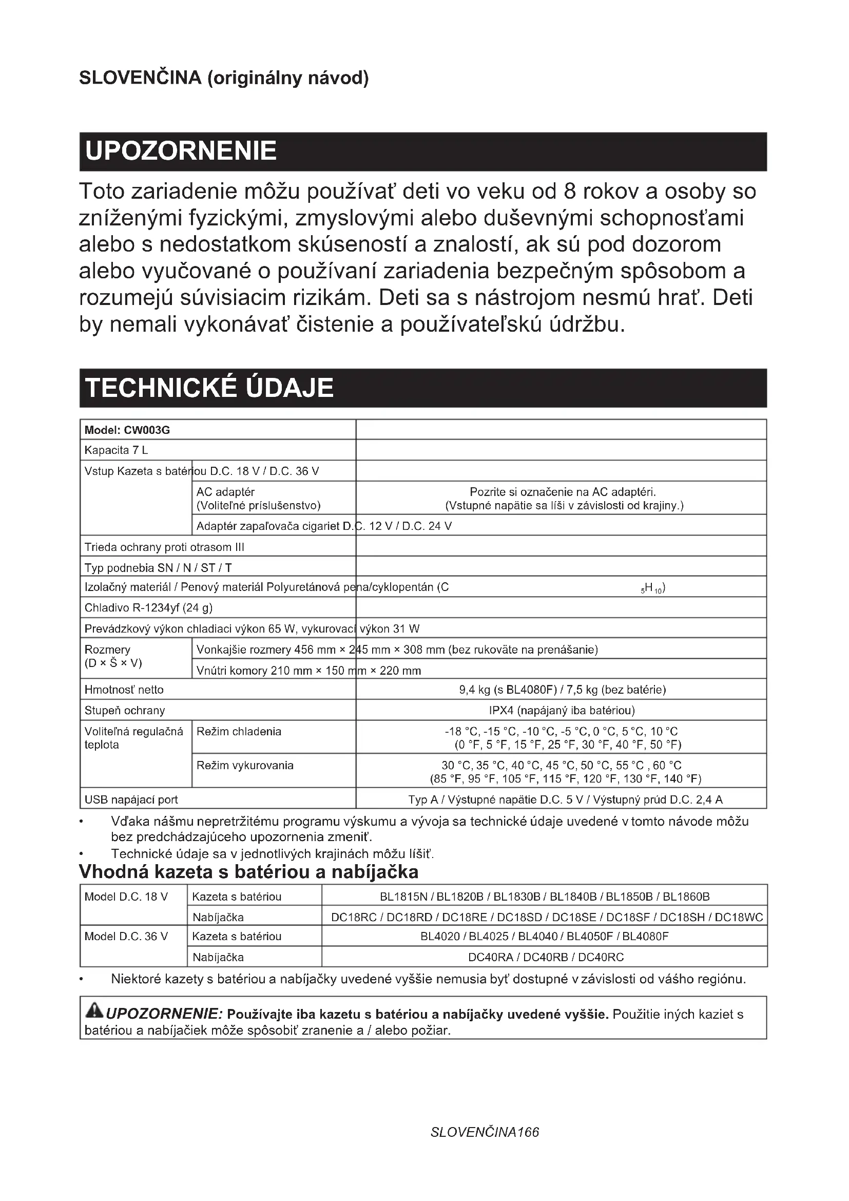- Eredeti Makita akkumulátor és töltő MEGJEGYZÉS: A listában felsorolt néhány tétel a készülék csomagjában szabványos tartozékként fordulhat elő. A készülékhez mellékelt tartozékok országonként eltérhetnek.SLOVENČINA166 SLOVENČINA (originálny návod) UPOZORNENIE Toto zariadenie môžu používať deti vo veku od 8 rokov a osoby so zníženými fyzickými, zmyslovými alebo duševnými schopnosťami alebo s nedostatkom skúseností a znalostí, ak sú pod dozorom alebo vyučované o používaní zariadenia bezpečným spôsobom a rozumejú súvisiacim rizikám. Deti sa s nástrojom nesmú hrať. Deti by nemali vykonávať čistenie a používateľskú údržbu. TECHNICKÉ ÚDAJE Model: CW003GKapacita 7 LVstup Kazeta s batériou D.C. 18 V / D.C. 36 VAC adaptér (Voliteľné príslušenstvo)Pozrite si označenie na AC adaptéri. (Vstupné napätie sa líši v závislosti od krajiny.)Adaptér zapaľovača cigariet D.C. 12 V / D.C. 24 VTrieda ochrany proti otrasom IIITyp podnebia SN / N / ST / TIzolačný materiál / Penový materiál Polyuretánová pena/cyklopentán (C
