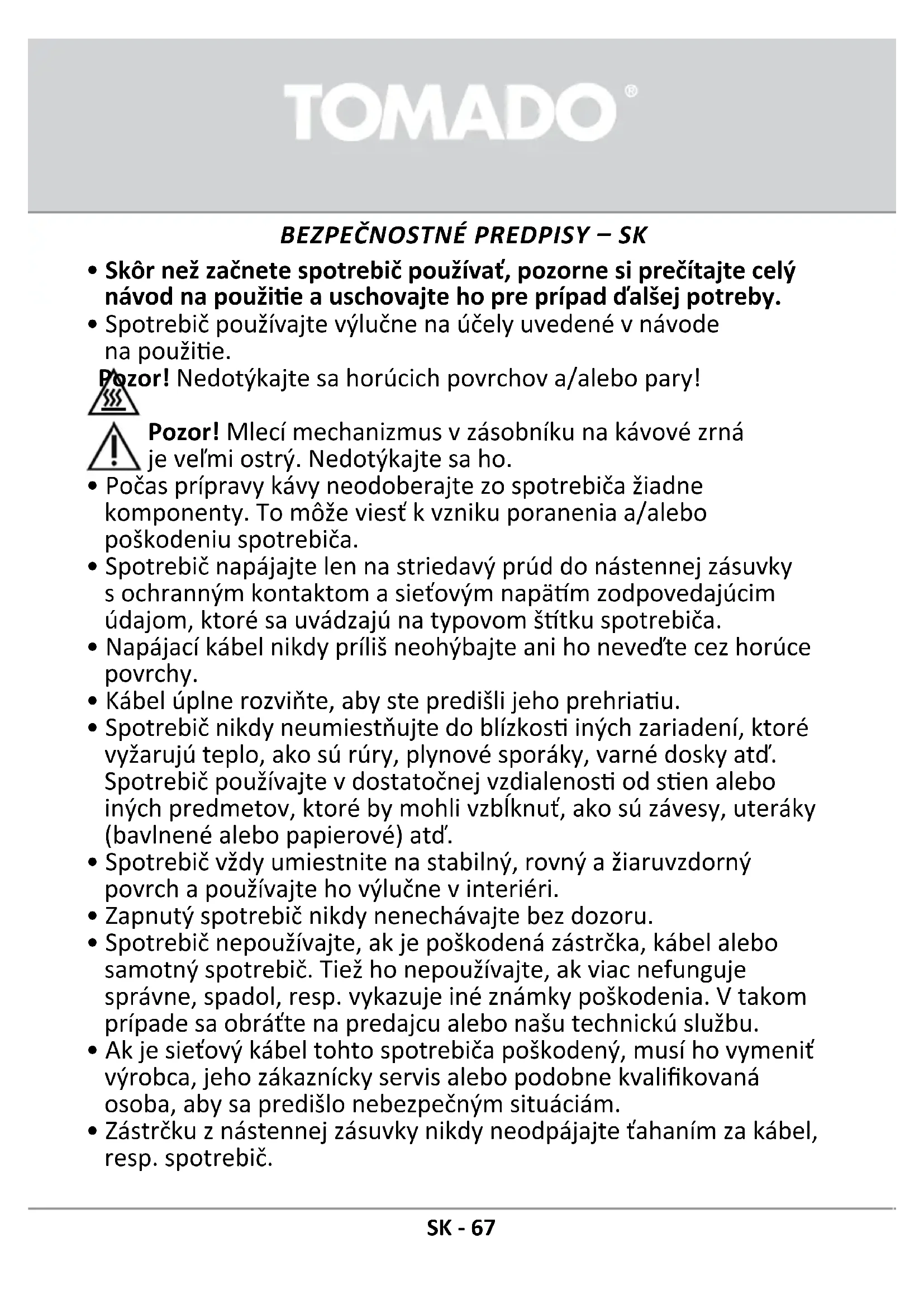 TGB0801S - Kávovar Tomado - Bezplatný návod na obsluhu