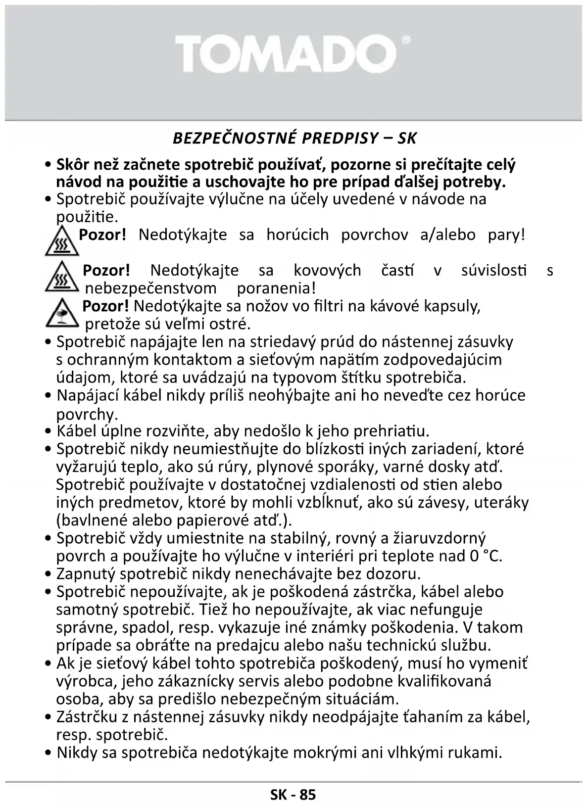 - Spotrebič používajte výlučne na účely uvedené v návode na použie. Pozor! Nedotýkajte sa horúcich povrchov a/alebo pary! Pozor! Nedotýkajte sa kovových čas v súvislos s nebezpečenstvom poranenia! Pozor! Nedotýkajte sa nožov vo ltri na kávové kapsuly, pretože sú veľmi ostré.