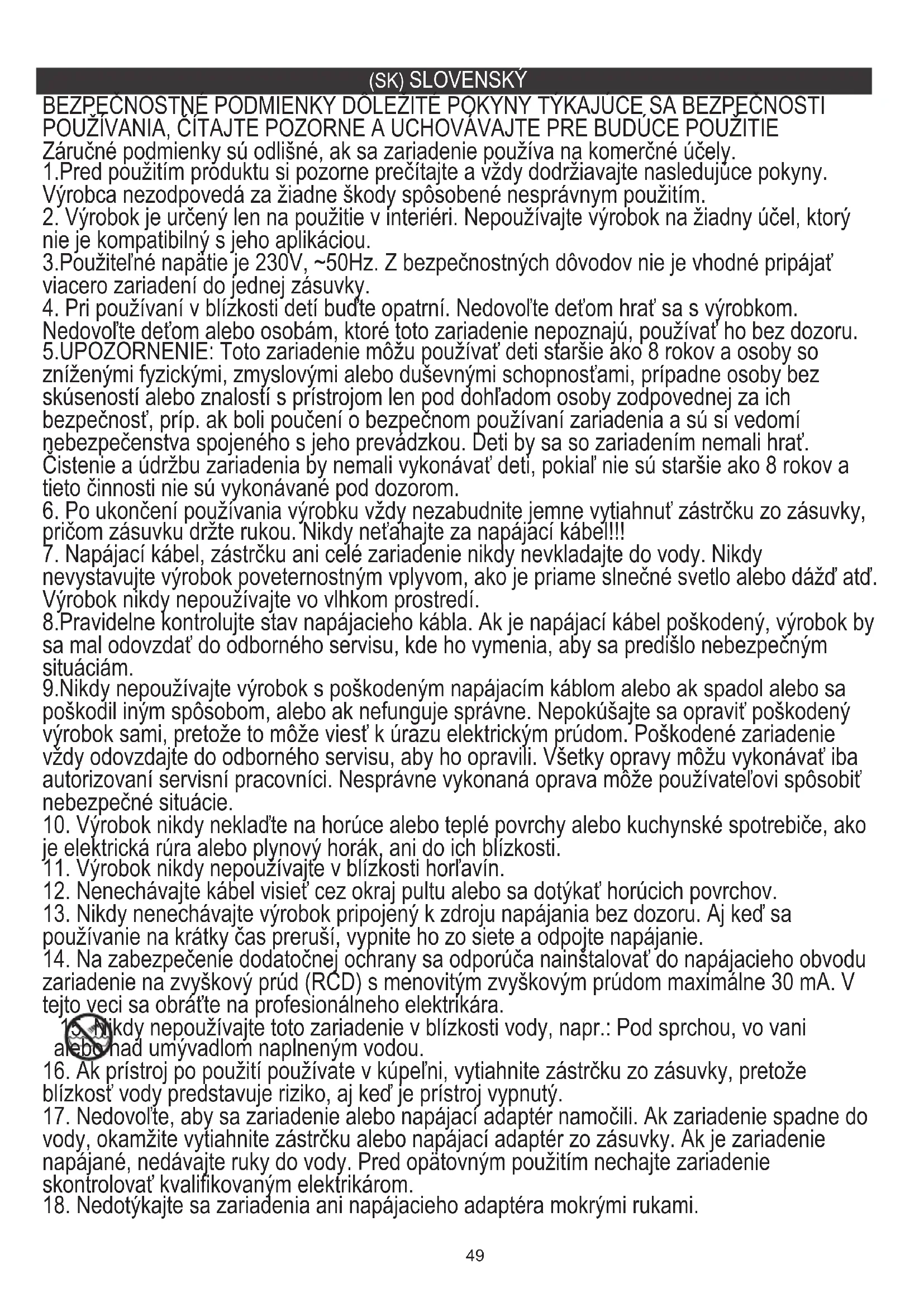15. Nikdy nepoužívajte toto zariadenie v blízkosti vody, napr.: Pod sprchou, vo vani